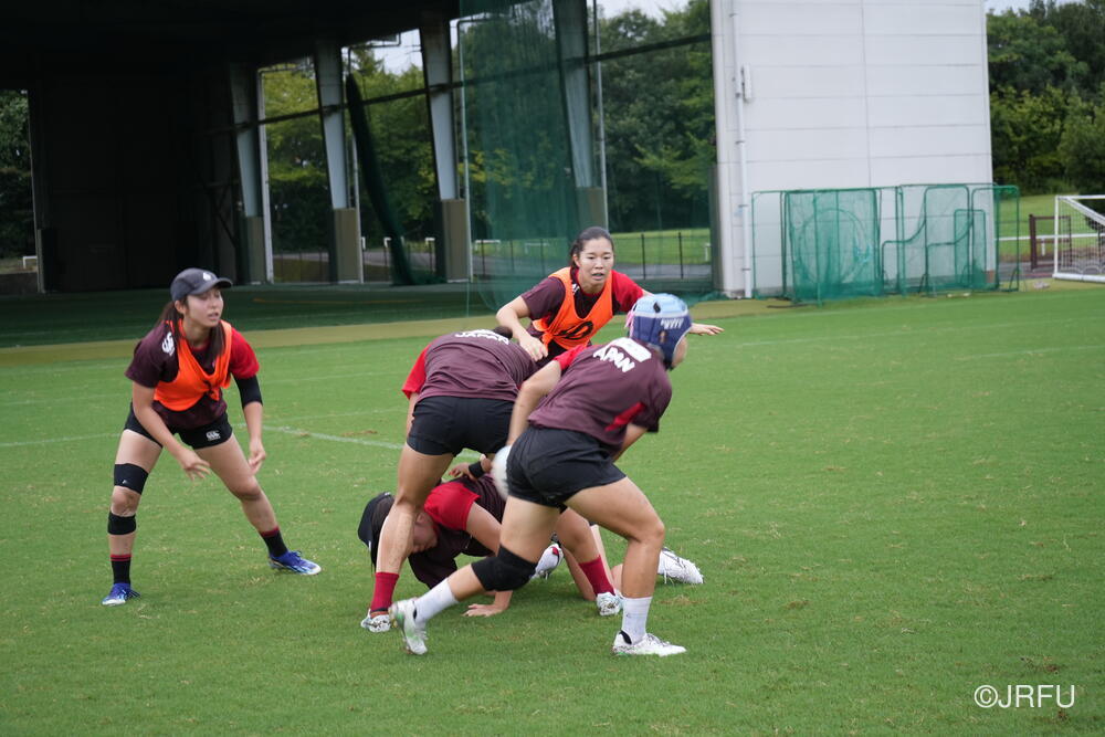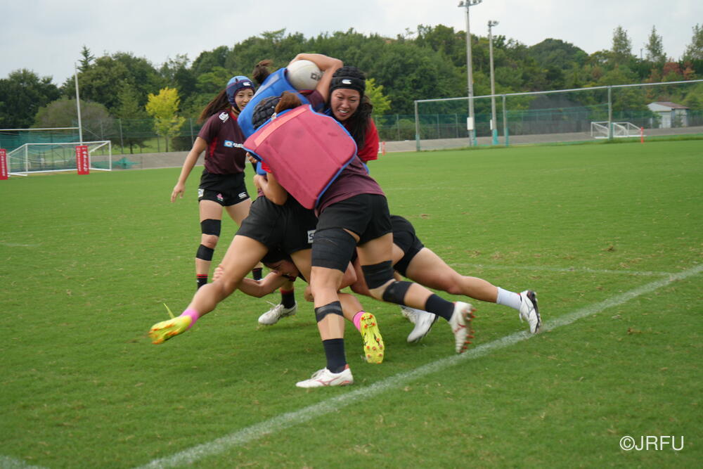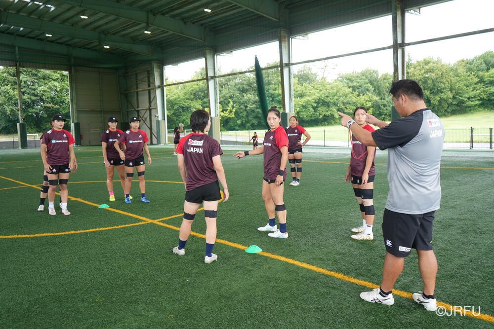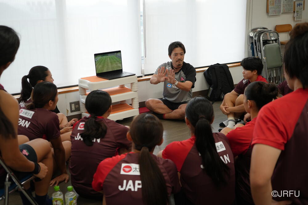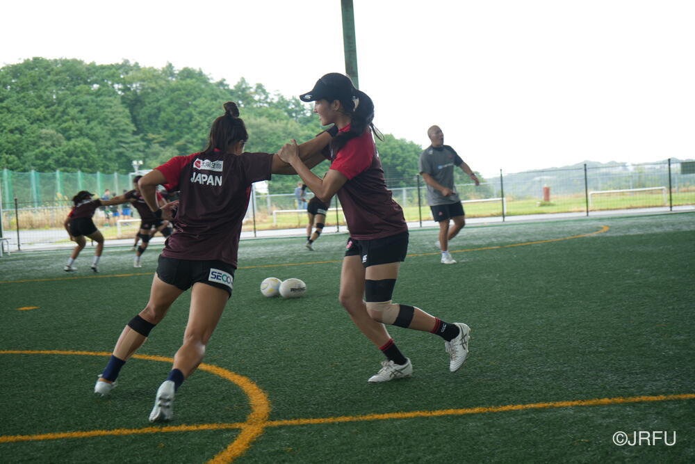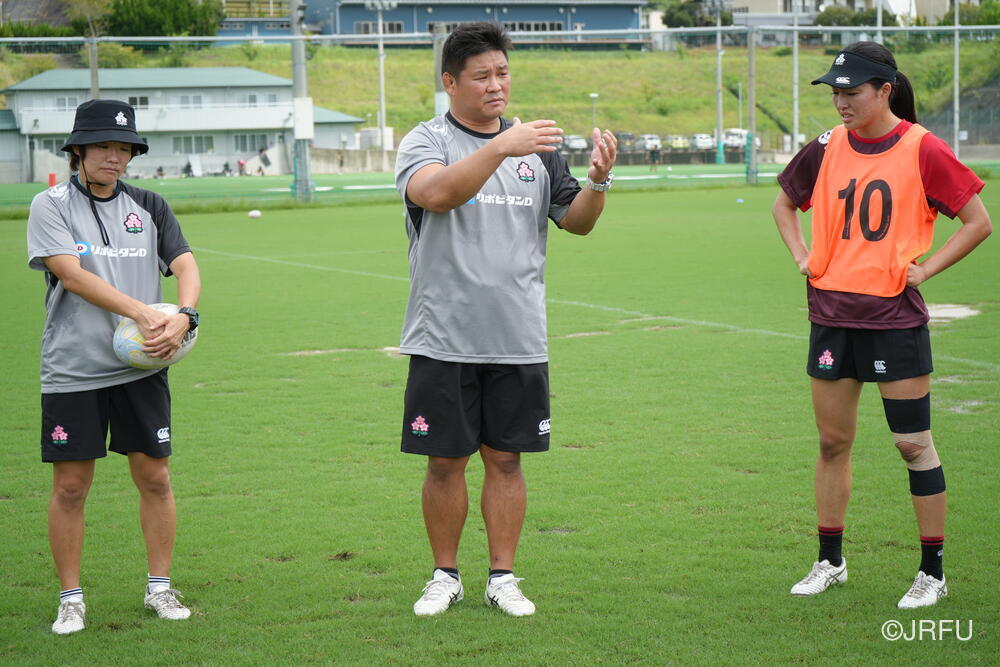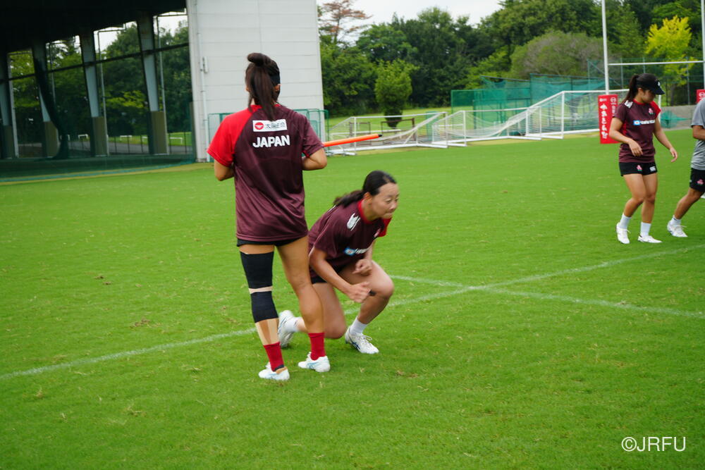 午前は昨夜のミーティングで共有したキックオフレシーブの動きを一つ一つ確認しながら行いました。その後、サクラセブンズのアタックの精度を上げるために、ランコースやタイミングを考えながら取り組み、最後にそれらを7対7の中でチャレンジしました。