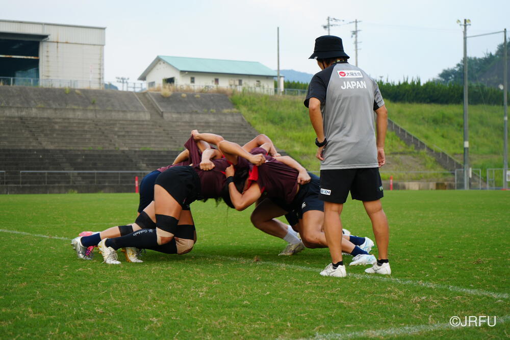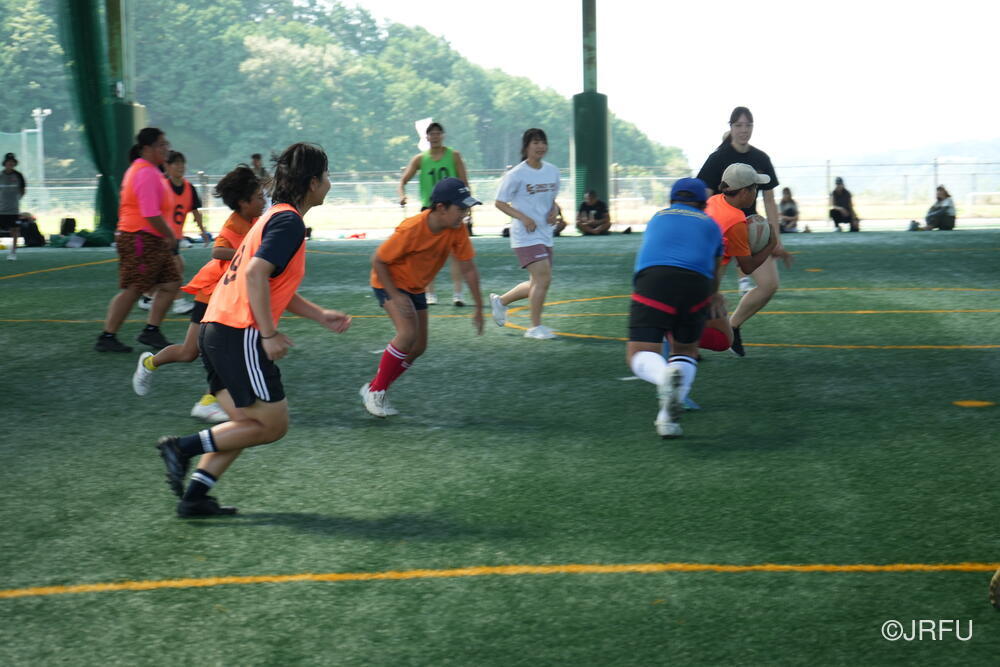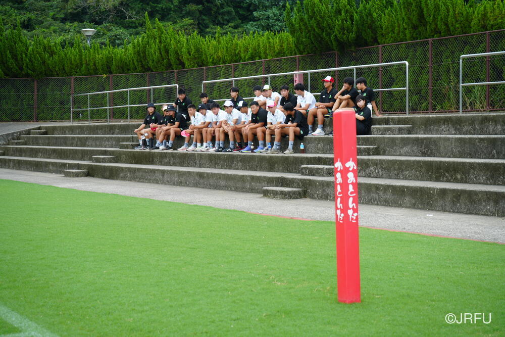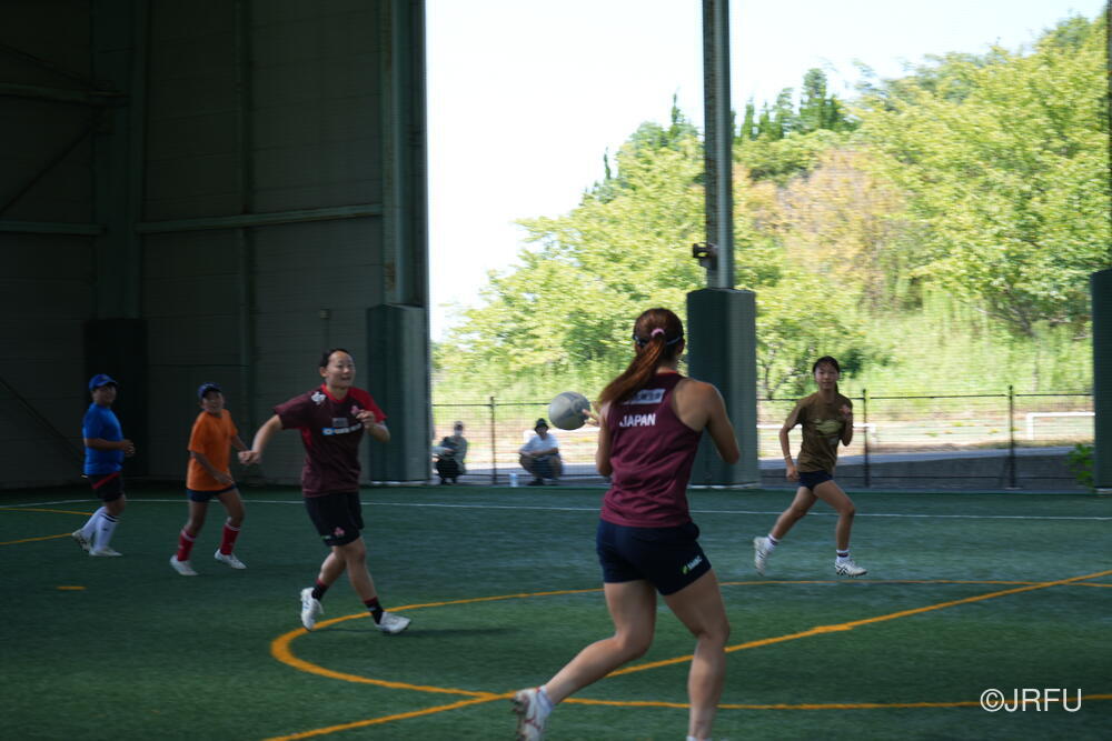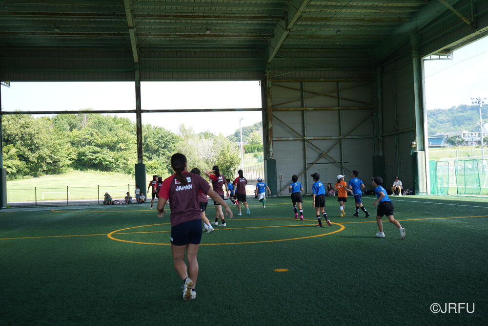日陰でアイスブレイクを入れた後、7対7です。合宿前半にやってきたことにチャレンジし、トライまで粘り強くボールを繋ぐ場面が多くみられました。