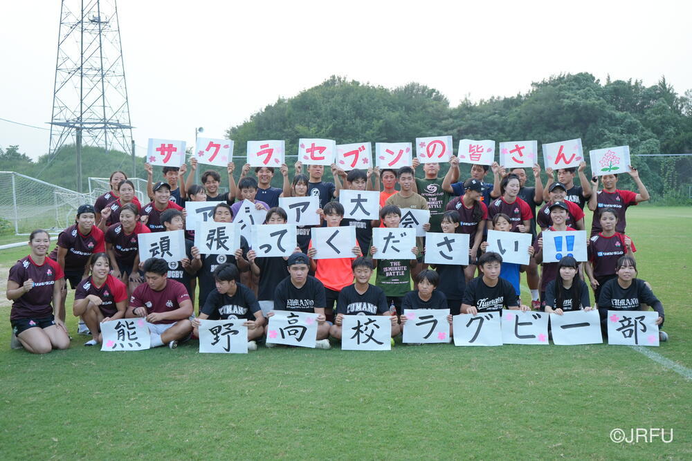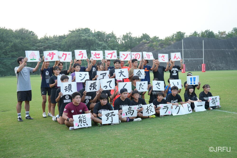 練習後、SDSの選手たちが片づけをしていると、遠くからこちらに向かって走ってくる集団が見えました。先日、フィールド練習の見学にいらっしゃった熊野高校ラグビー部の皆さんです!サプライズで手作りのプラカードを持って応援メッセージを届けにきてくださいました‼熊野高校ラグビー部の皆さん、和歌山県の皆さん、合宿最後までたくさんの応援をありがとうございました!