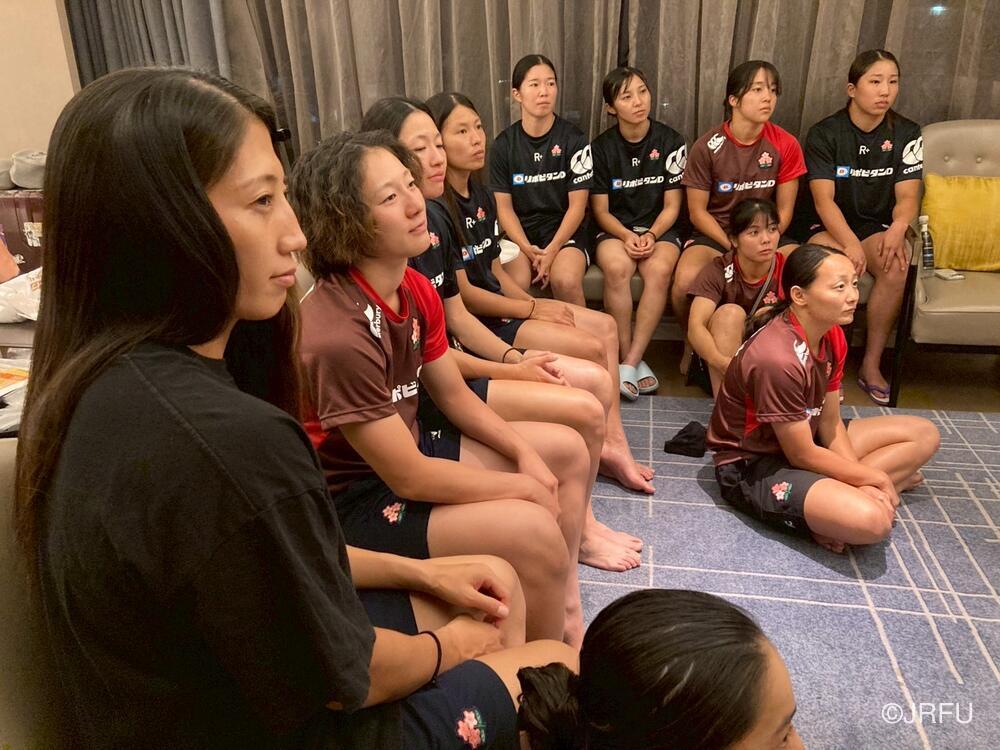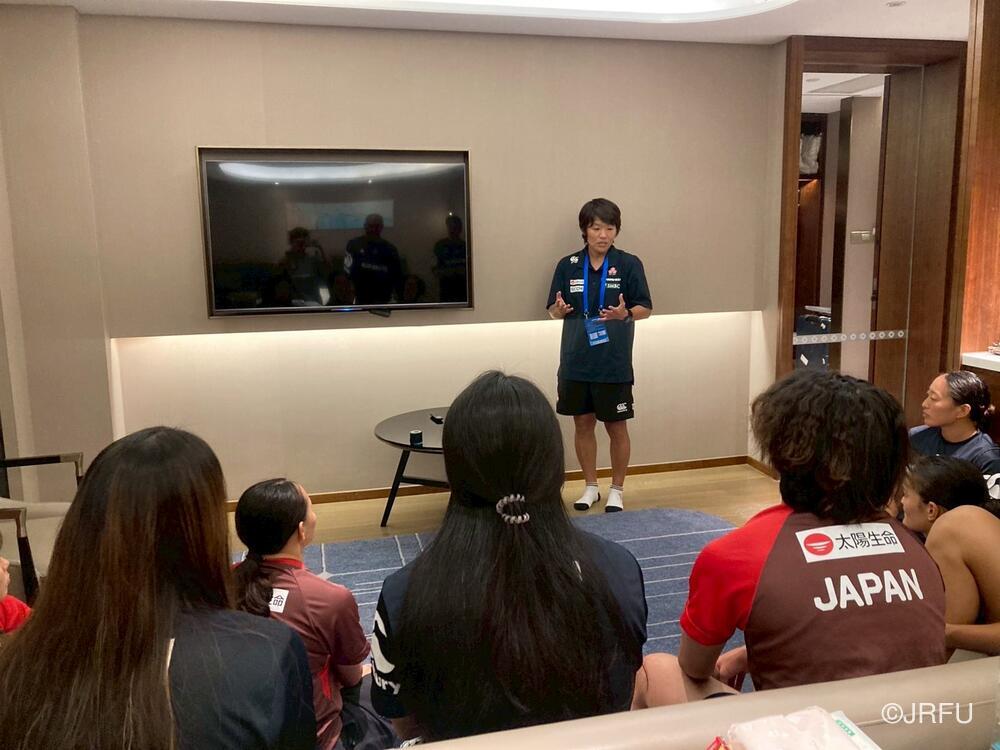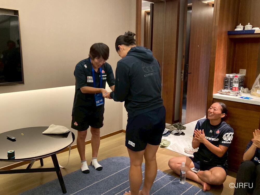 昼食後、ジャージプレゼンテーションを行いました。今大会のサクラセブンズは初キャップメンバー3名、復帰メンバー5名、昨シーズンから繋いでくれた5名で構成されています。ジャージは小出キャプテンから始まり、選手から選手へと繋ぎ渡され、それぞれジャージを受け取る選手へハートフルな言葉をかけていました。とても心が温かくなるジャージプレゼンテーションになりました。