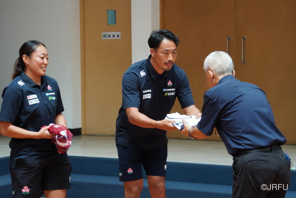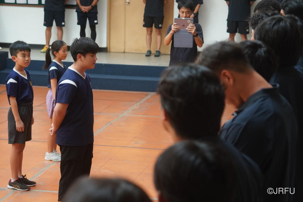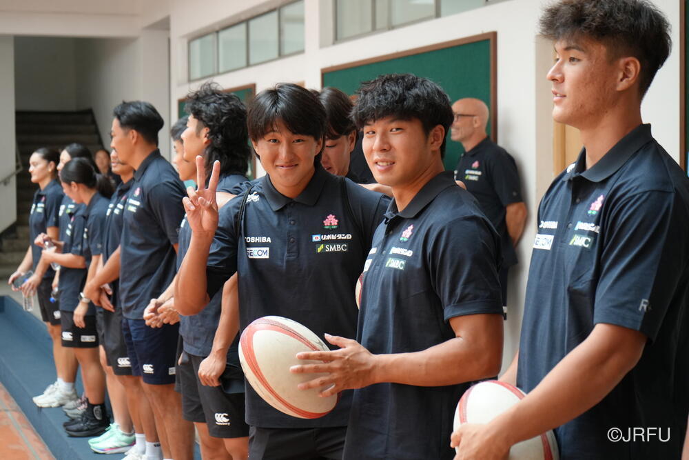 午後は男女セブンズ合同で、コロンボ日本人学校を訪問。子どもたちからの温かい出迎えと激励の言葉に、選手たちも大きな元気をもらいました。