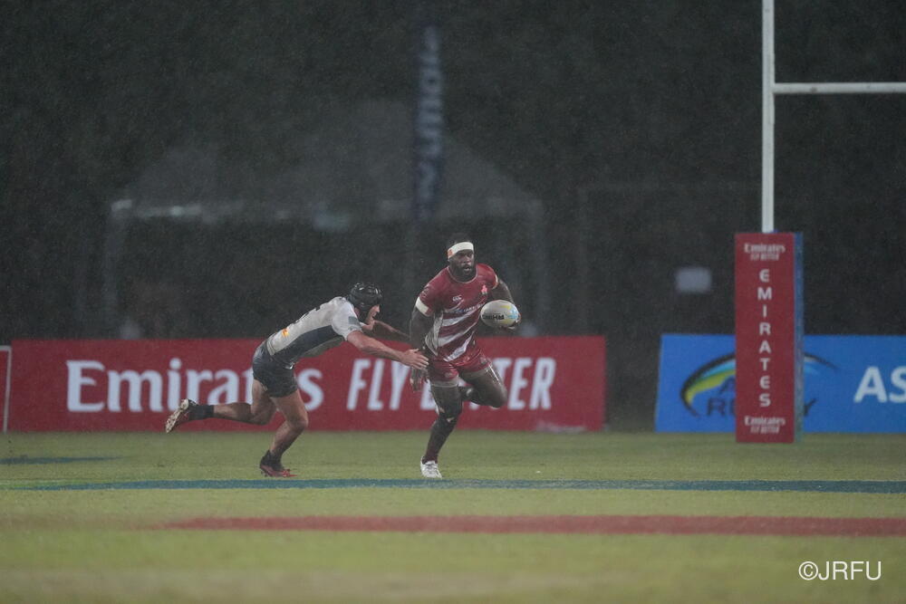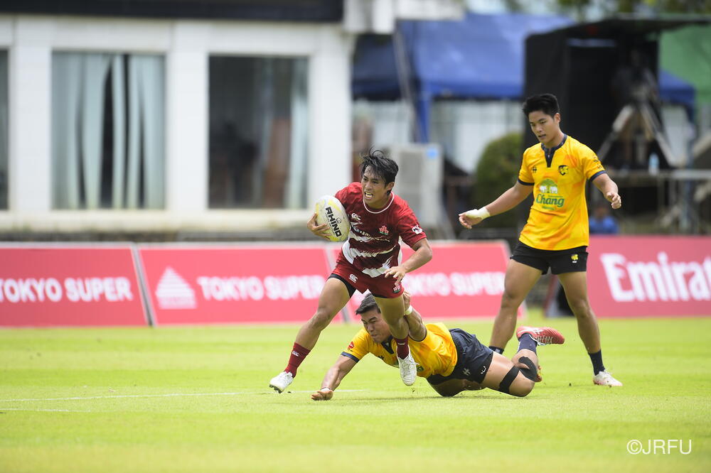 初戦はタイ戦。序盤にトライを奪うも、やや攻めあぐねる時間帯もありましたが、連続トライで流れをつかみ勝利。