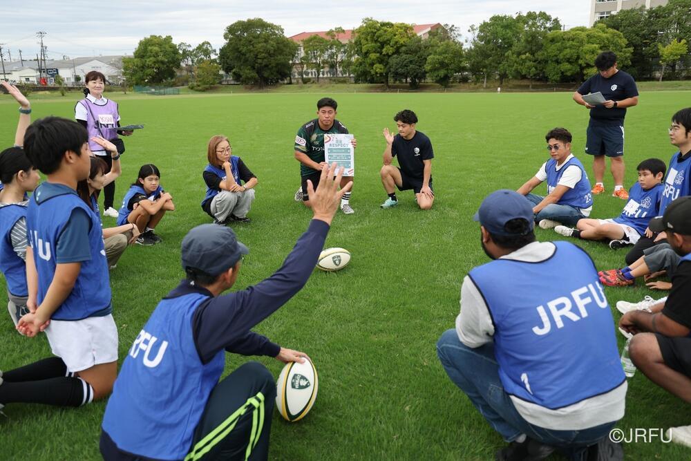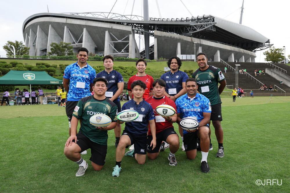 このイベントは、(公財)日本ラグビーフットボール協会(JRFU)、ジャパンラグビー リーグワン(JRLO)、国際協力機構(JICA)による三者連携協定に基づき、豊田市後援のもとに実施され、トヨタヴェルブリッツ(トヨタV)、豊田自動織機シャトルズ愛知(S愛知)をはじめ、リーグの垣根を越えて、同エリアを拠点とする豊田通商ブルーウィング、中部電力ラグビー部のスタッフ・選手が参加。当日は約100名の参加者が集まり、日本のみならず、そのうち約30名はニュージーランド、台湾、スリランカ、ブラジルなど、多彩な国籍の方々にご参加いただき、会場は終始、笑顔と活気に包まれ、ラグビーを通じて、国籍や年齢、性別を超えてつながる温かい交流の輪が広がりました。
