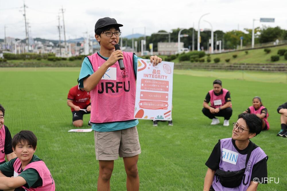 イベントは、ラグビーのコアバリュー(品位・情熱・結束・規律・尊重)をテーマとして行われました。まずはクイズ形式でコアバリューを楽しく学び、その後、それぞれの価値をモチーフにしたチームに分かれて、「自分たちが今日1日チームで大切にしたいこと」について話し合いました。