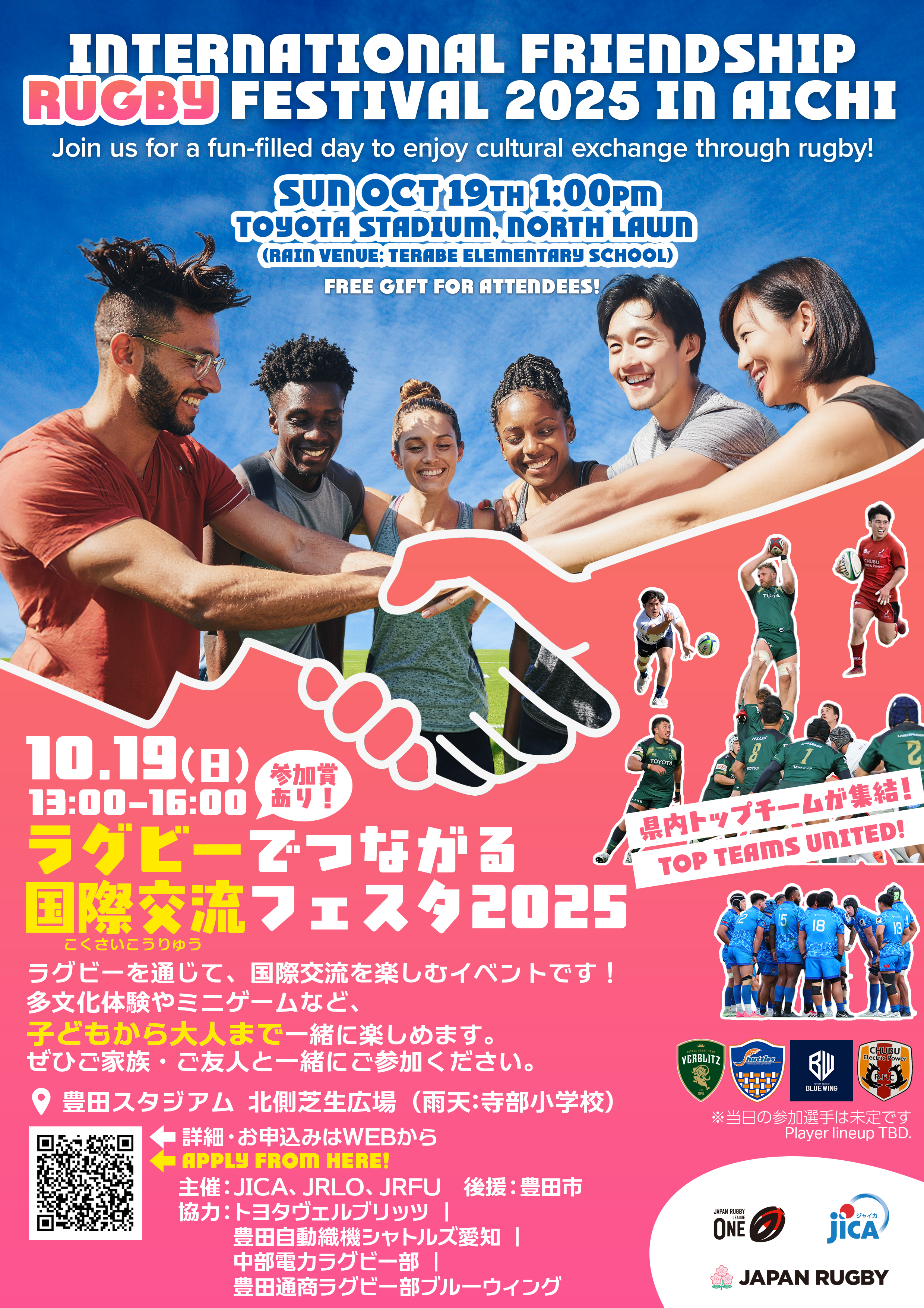 2025年10月19日(日)、愛知県豊田市の豊田スタジアム 北側芝生広場にて、「ラグビーでつながる 国際交流フェスタ2025」in 豊田市を開催しました。