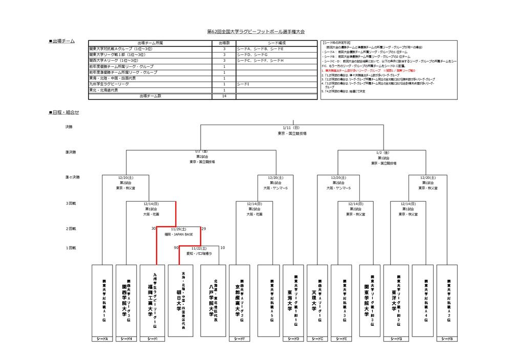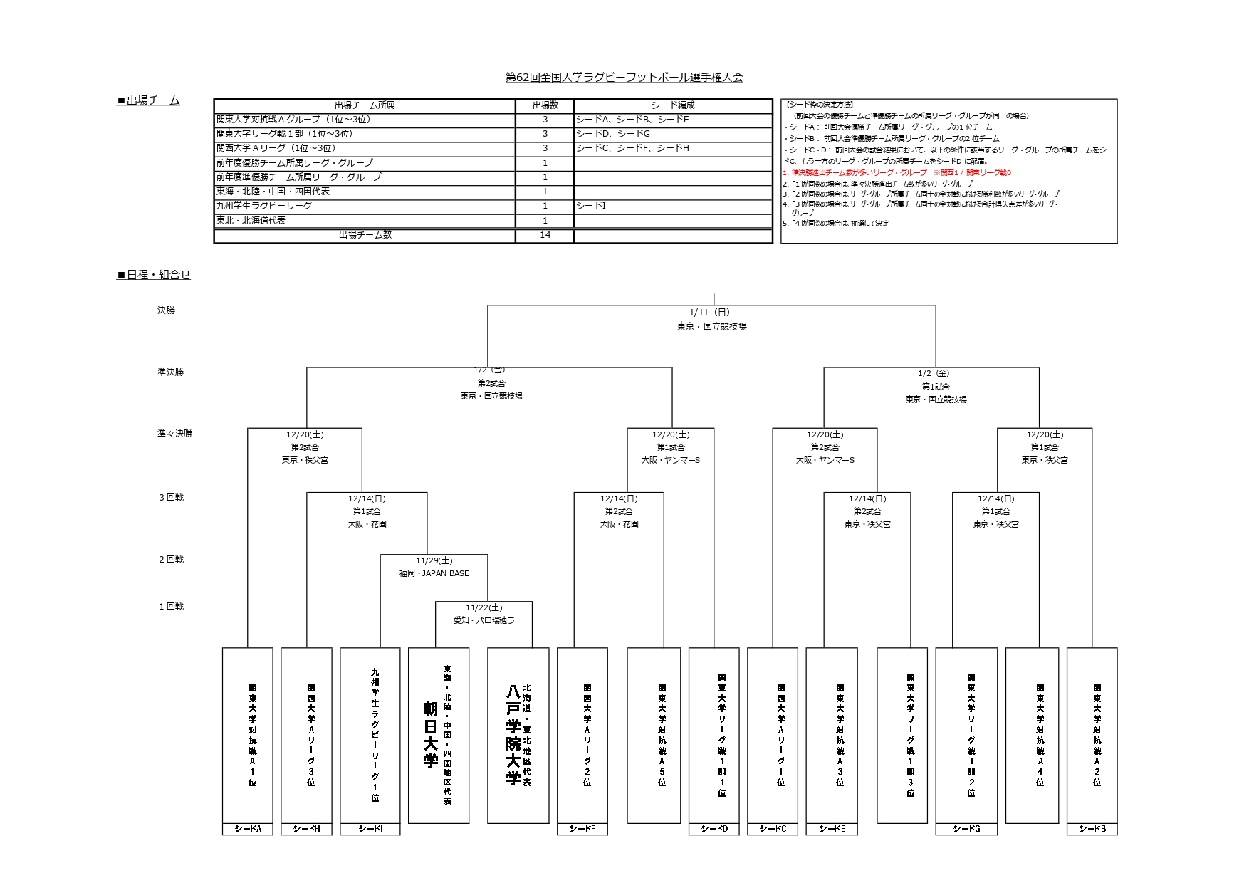・シードF:関東大学対抗戦A、関東大学リーグ戦1部、関西大学Aリーグの各2位チームの内、シードA~Eに含まれないチーム