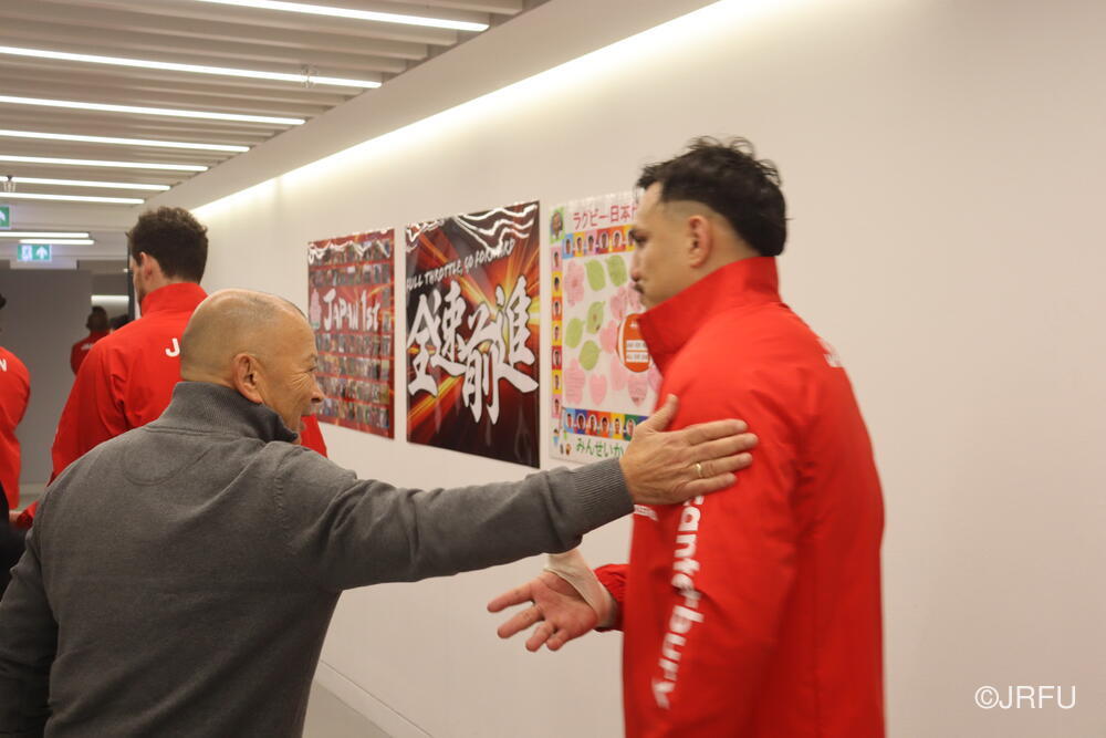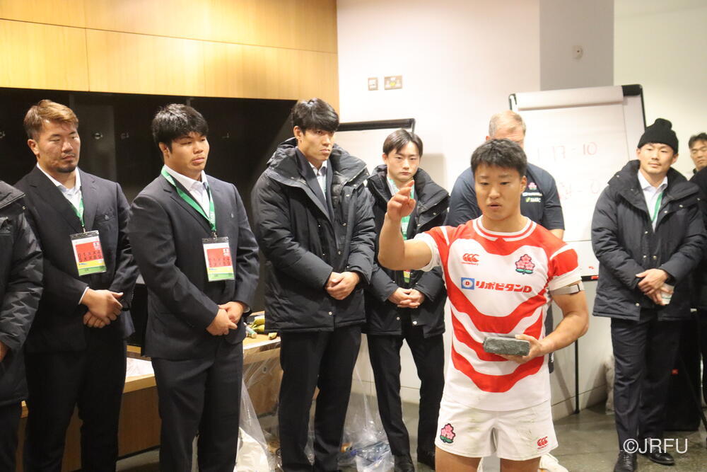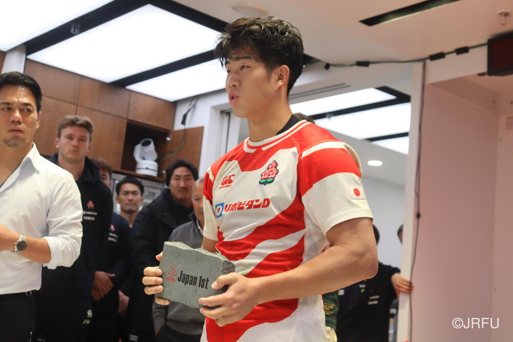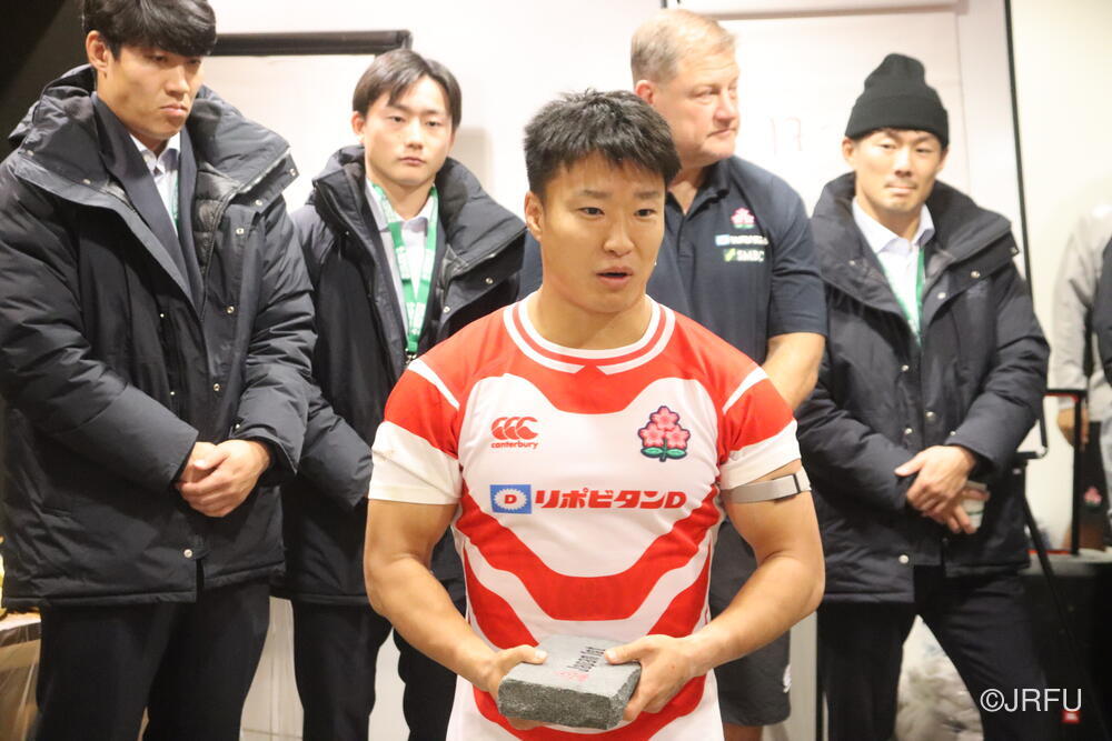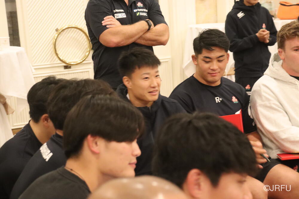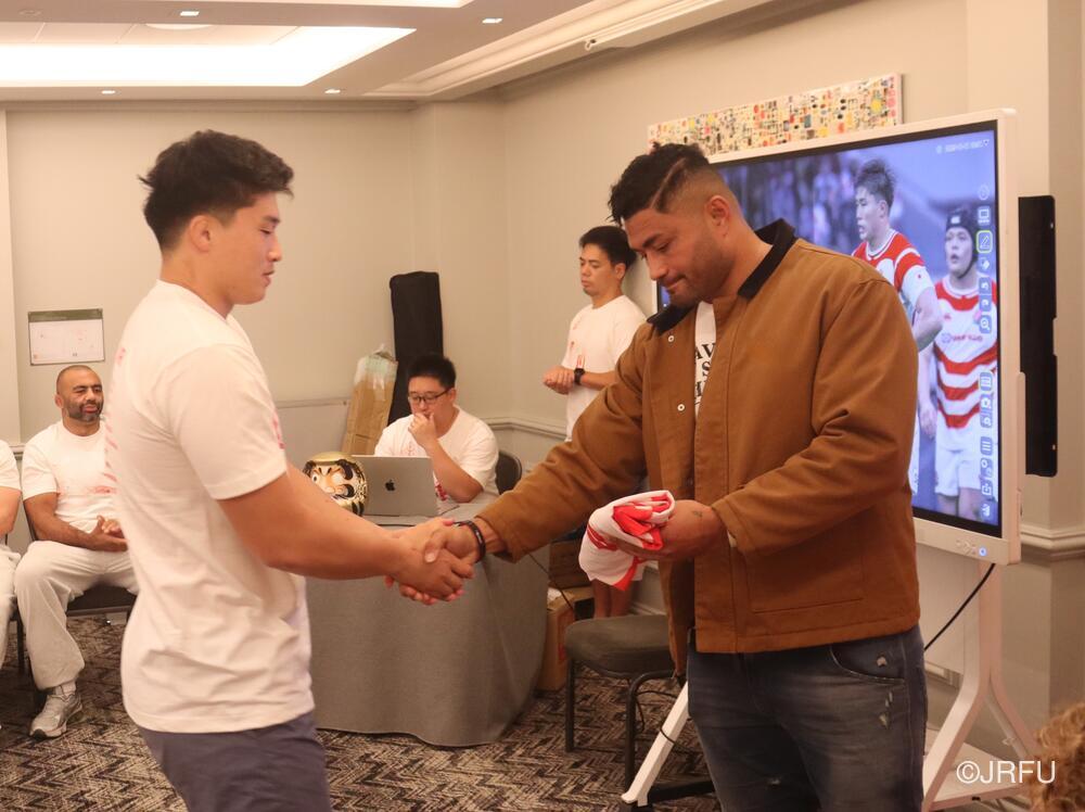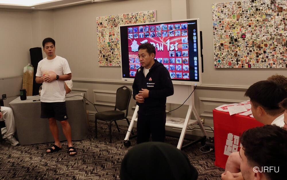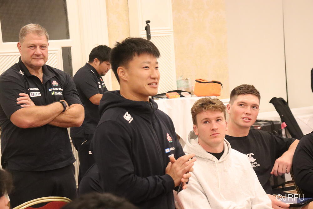 「今ここにいられて光栄です。10年前は、みんなと同じようにこのジャージを受け取って、同じような緊張感を持っていました。世界の強豪と対決するということで、南アフリカと対戦するときに、チームの外では無理じゃないかと思われていましたが、チーム内では自分たちのやってきた準備を信じていたし、JAPANは勝てると信じていました。明日は同じようなチャンスがあります。世間はそう思っていないかもしれないけれど、自分たちはできる。誰がどう思おうが、大事なのは自分自身がどう思っているか。明日出たら、自分自身を代表するだけではなく、このジャージを着てきた人たちの思いや責任も果たさないといけない。信じてくれているファン、そして日本でラグビー選手になりたいと夢を持っている子供達のために。頑張ってください!」