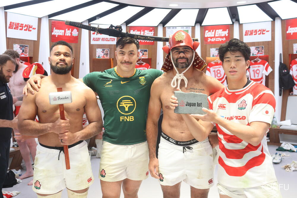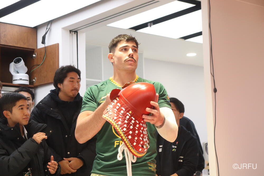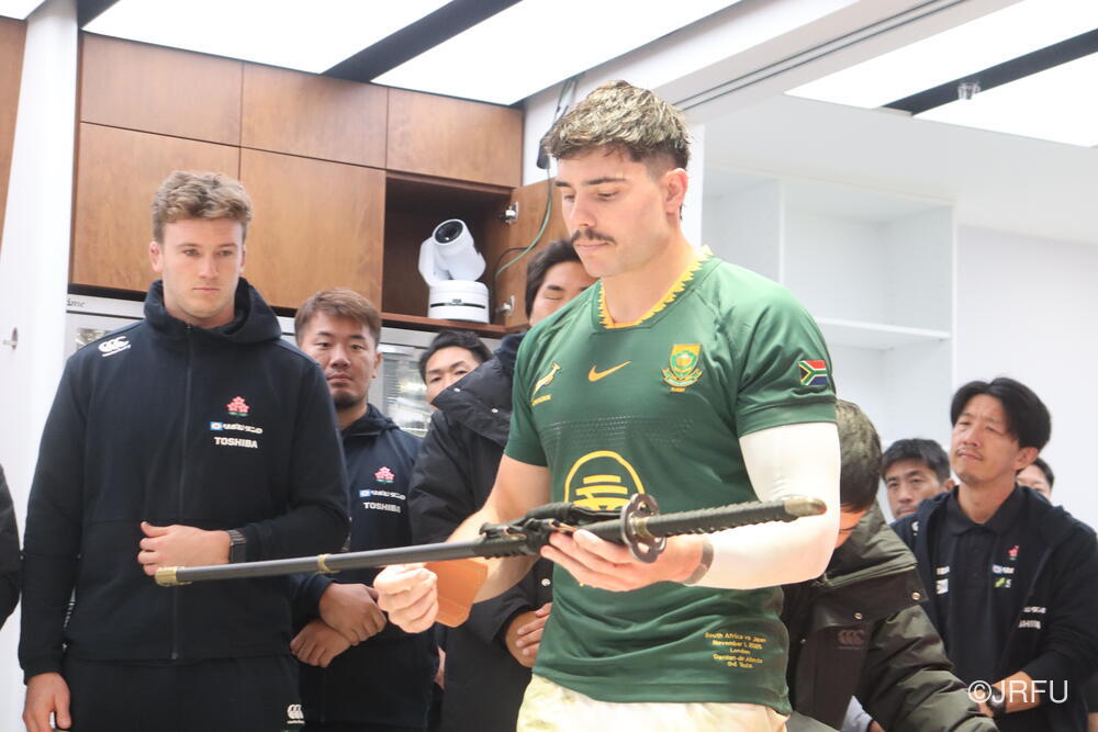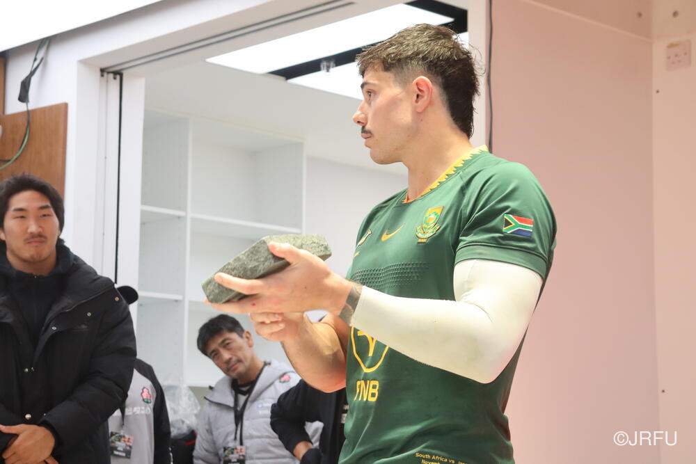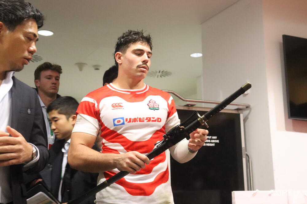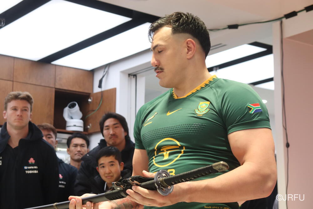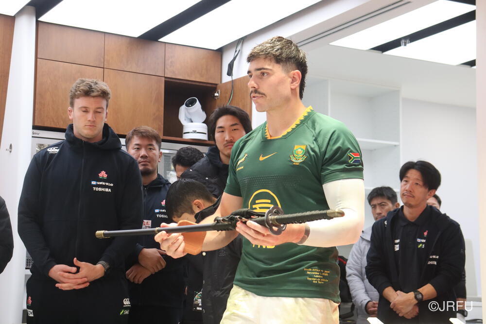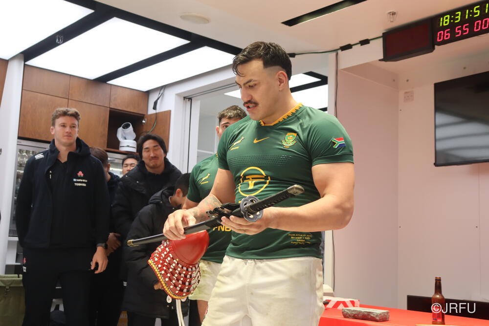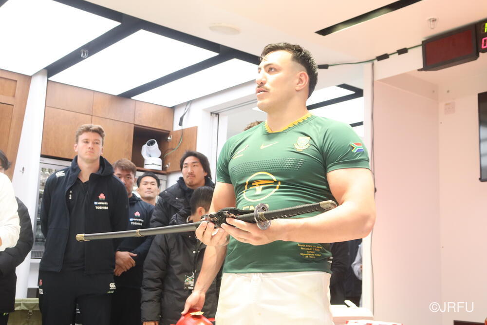 まずは日本刀の表彰から。こちらは、出場していない選手達が選ぶMVPで、選手に認められた選手という名誉ある賞です。(ちなみに試合後にジャージを交換して南アフリカのジャージを着用しています)