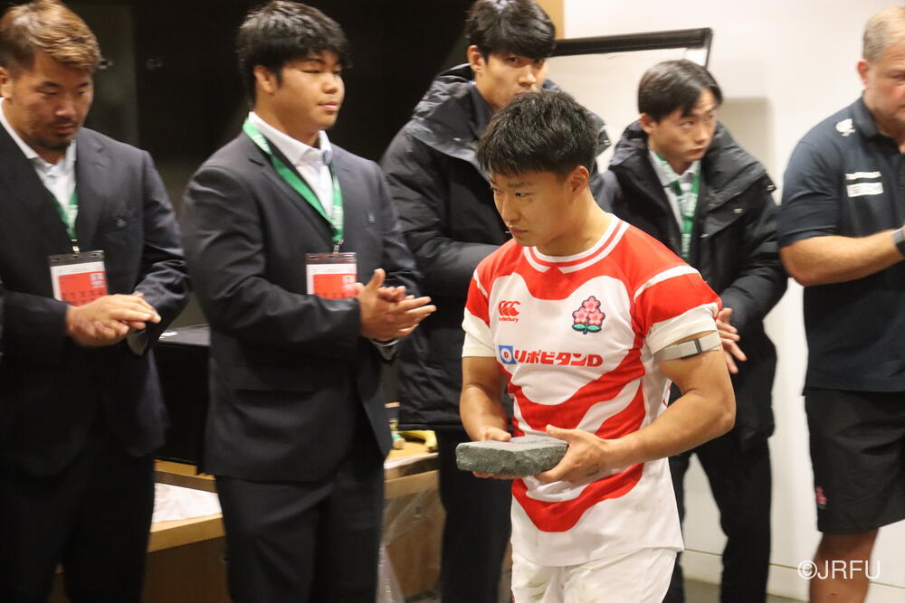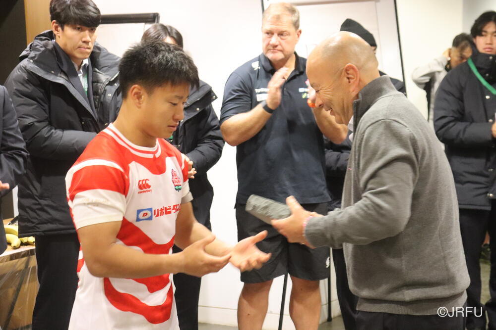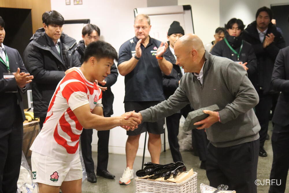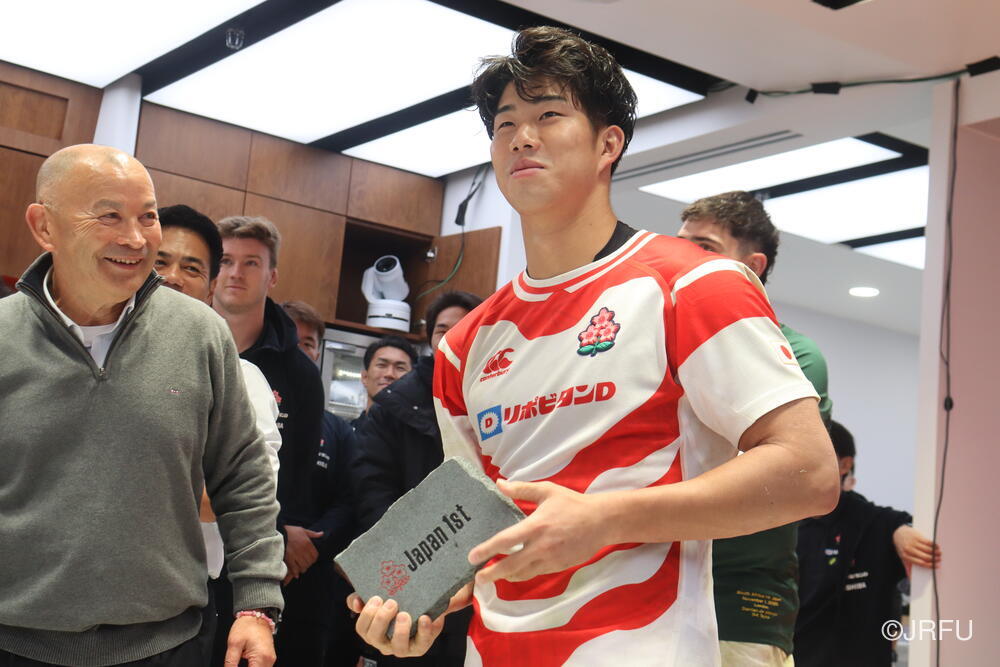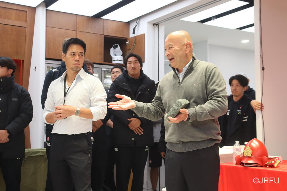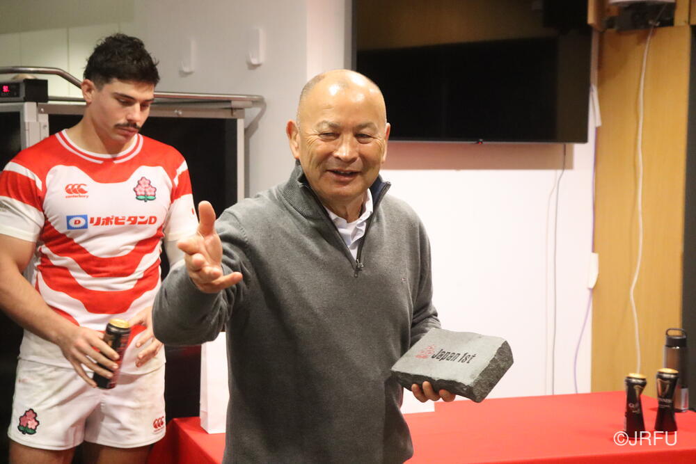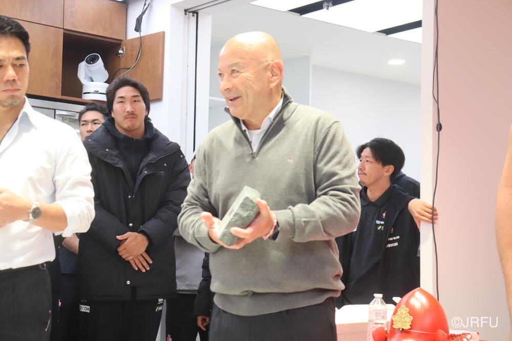 最後にエディー・ジョーンズHCから、今回チームに貢献した選手に贈られるジャパンファーストの研ぎ石を・・・