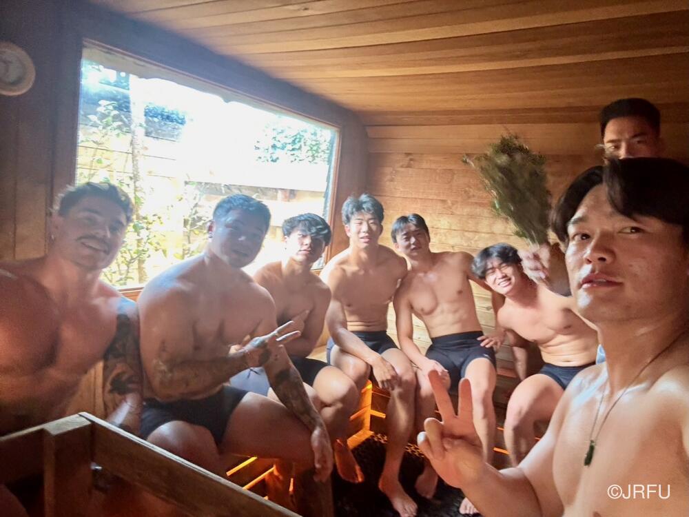 海辺のサウナでリカバリーする選手達。