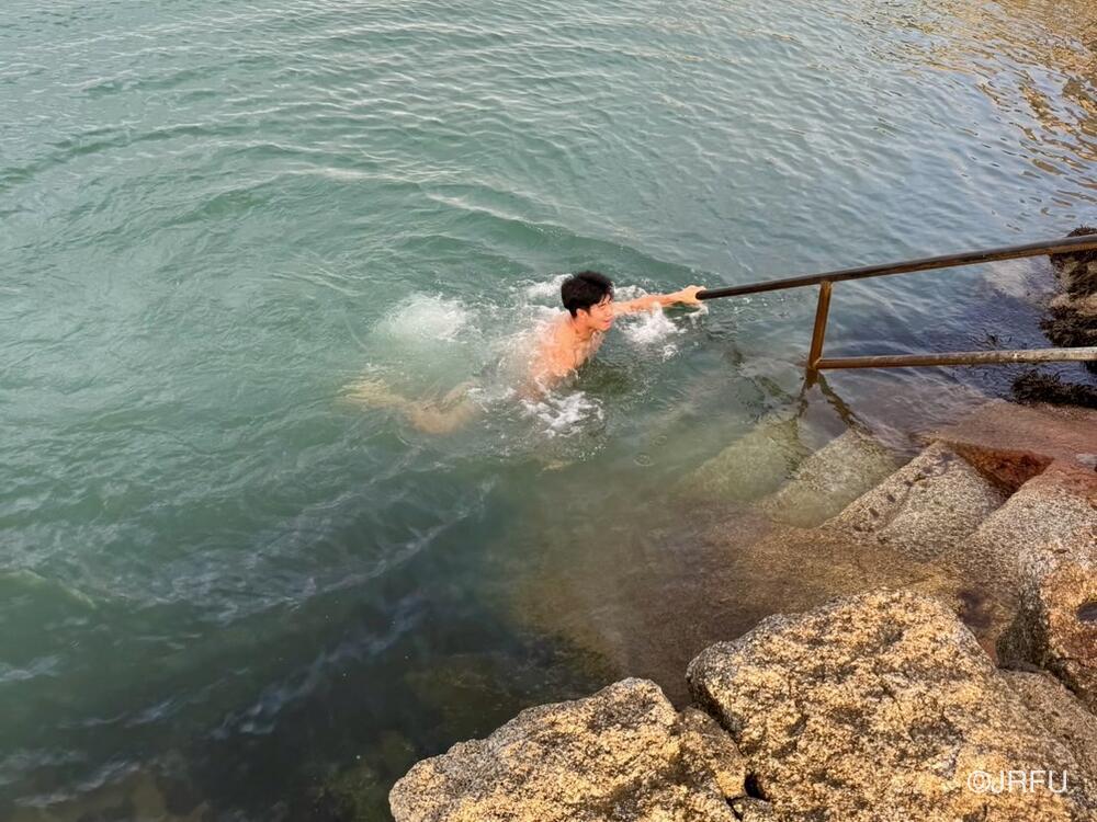 サウナで温まった後は、冷たい海水に浸かりにいきました。天然アイスバスです。