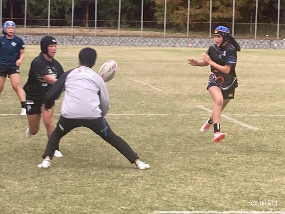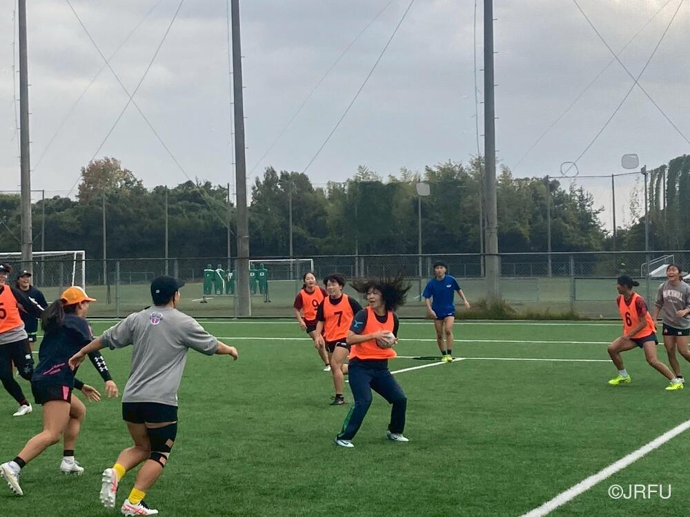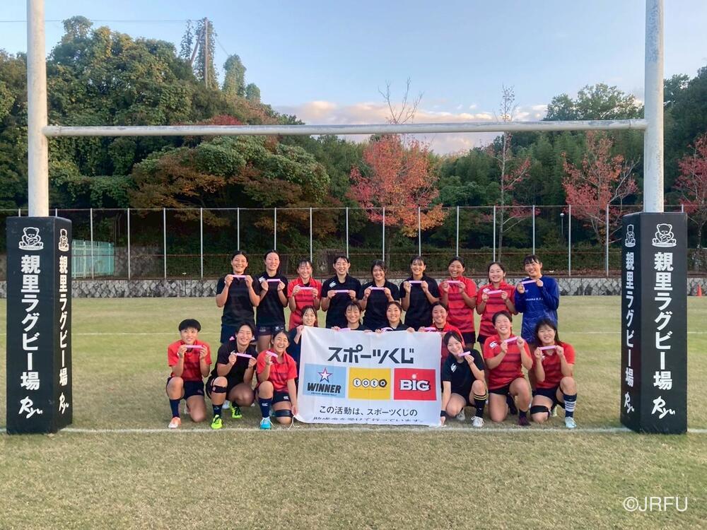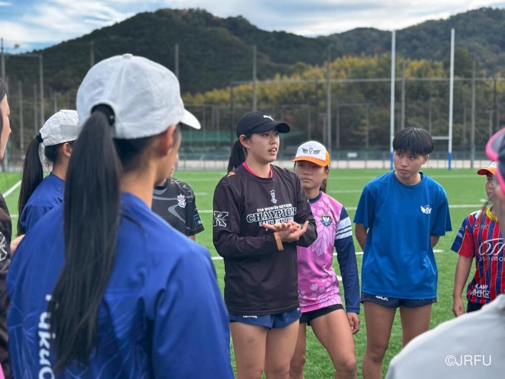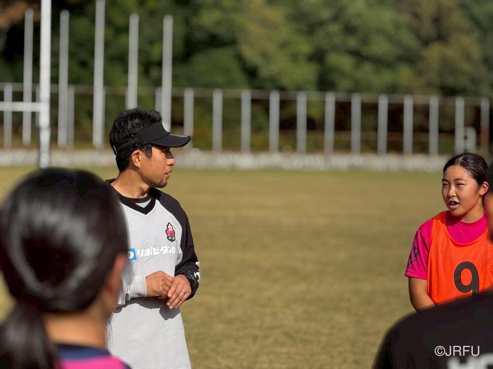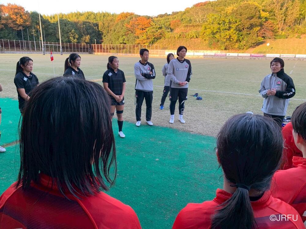 本日の試合には女子セブンズ日本代表チームの兼松由香ヘッドコーチが来てくださり、来月に向けて激励をいただきました。さらに、女子セブンズファミリーの証として、トップ代表選手も持つリボンを兼松ヘッドコーチから1人ひとりが受け取りました。