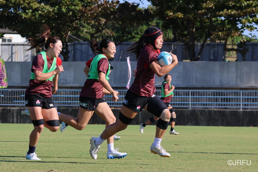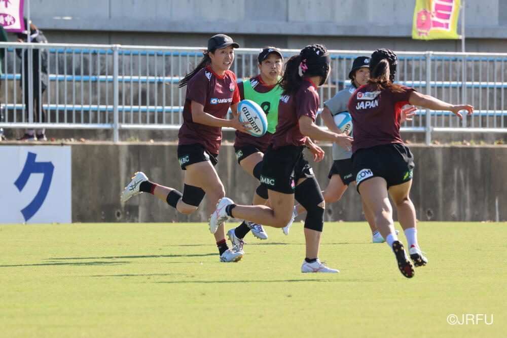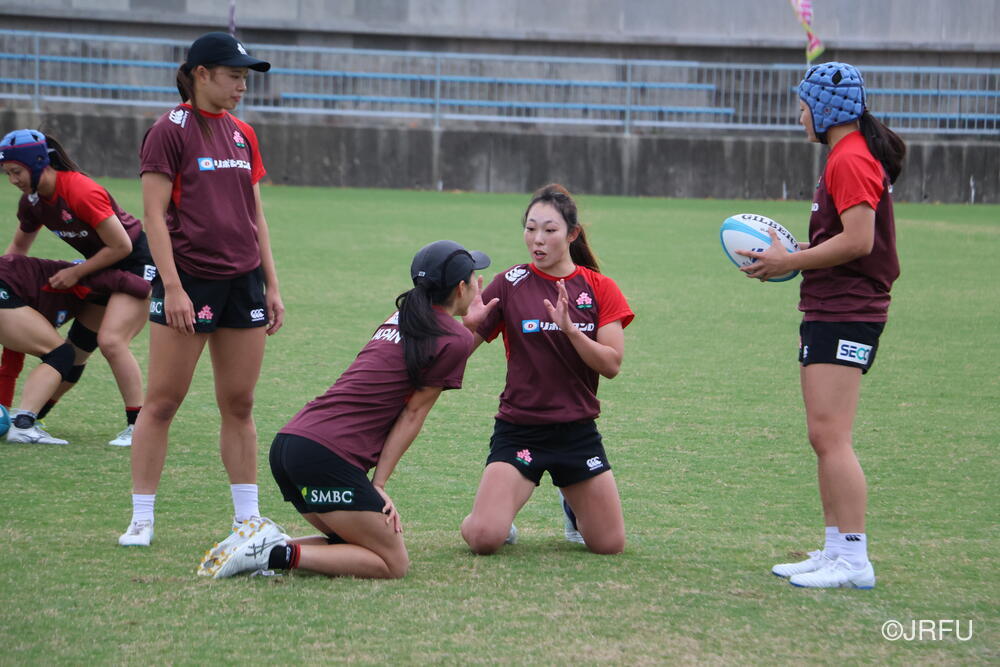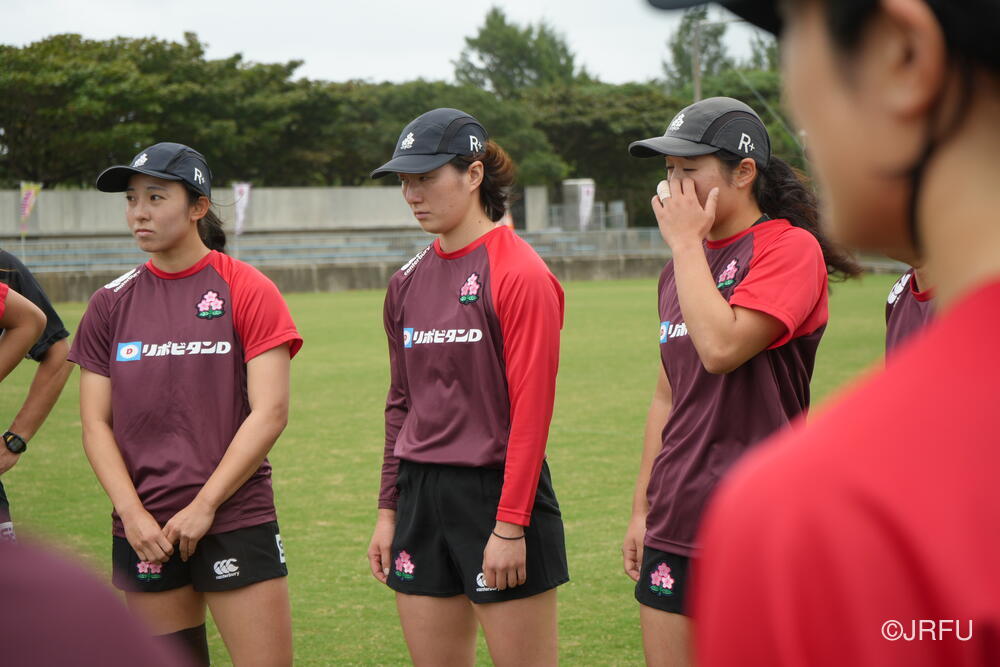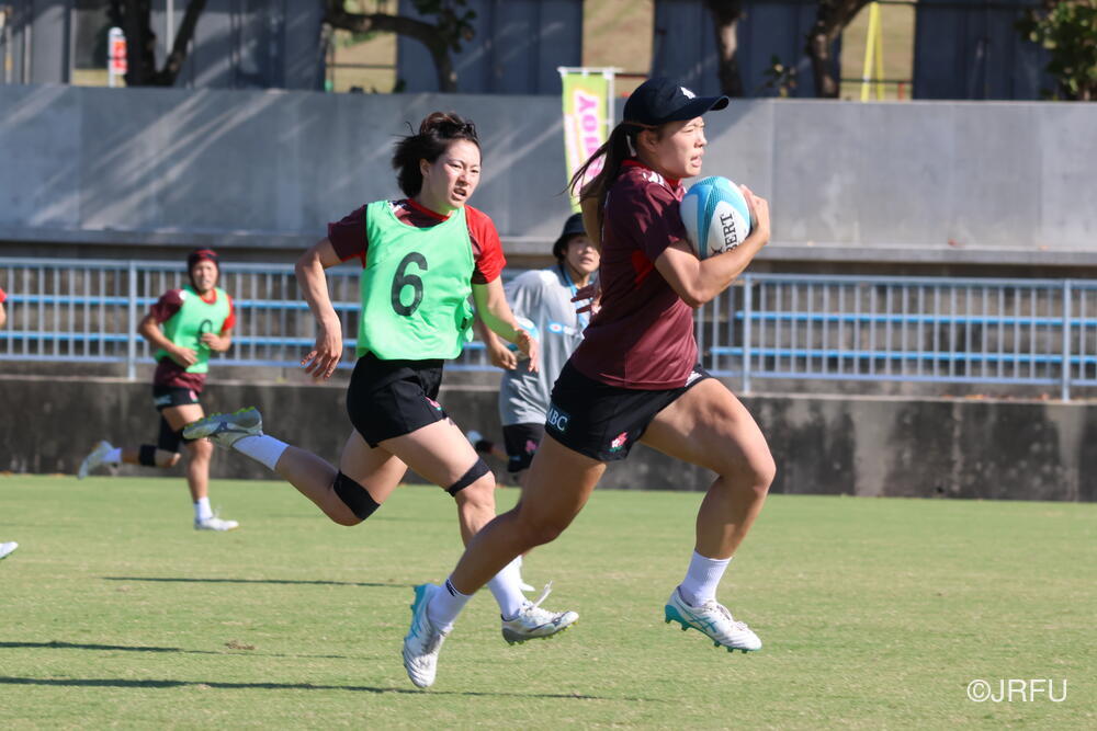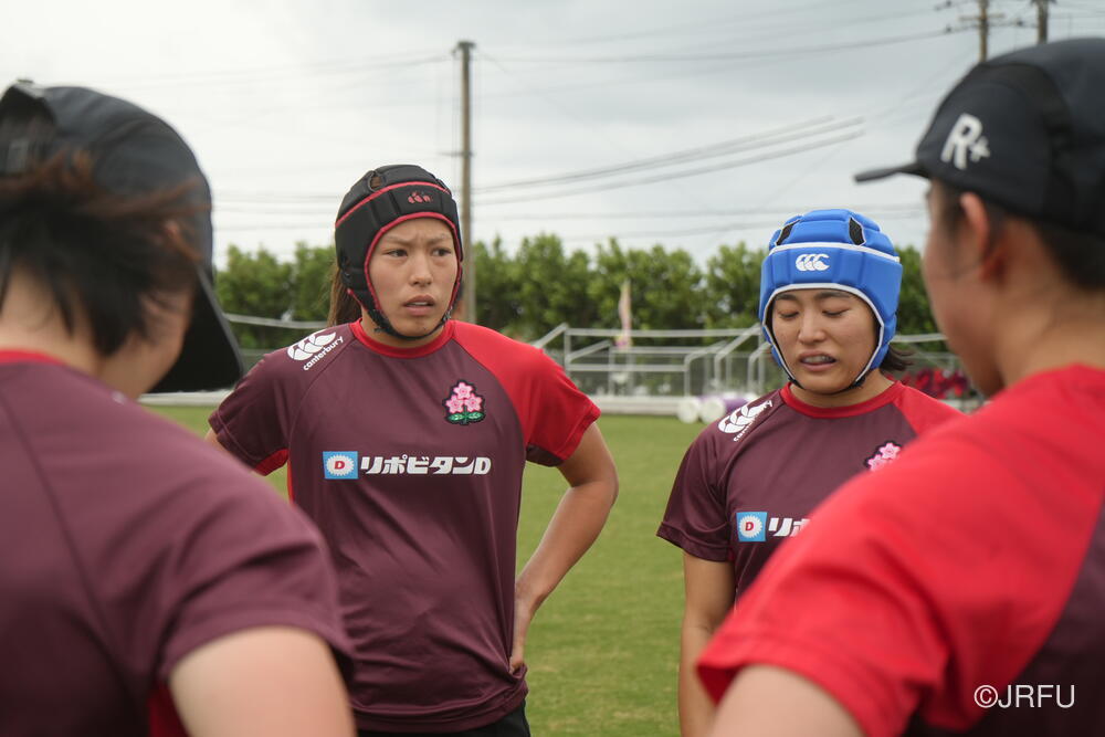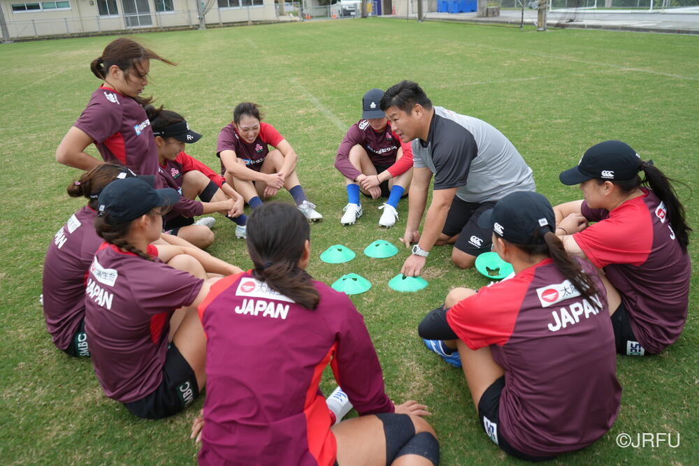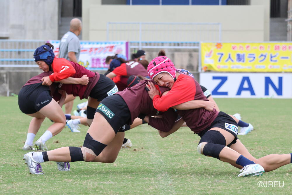 その後、ゲーム前のウォーミングアップから始まり、ドバイ大会の1試合目と2試合目を想定した、オリジナルルールの7対7を行いました。合宿前半に取り組んできたことにチャレンジし、敵味方関係なく、17人全員がサクラセブンズのラグビーを体現しようとする姿勢が見られました。