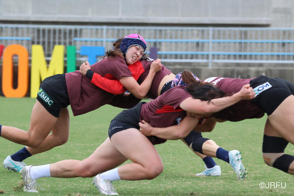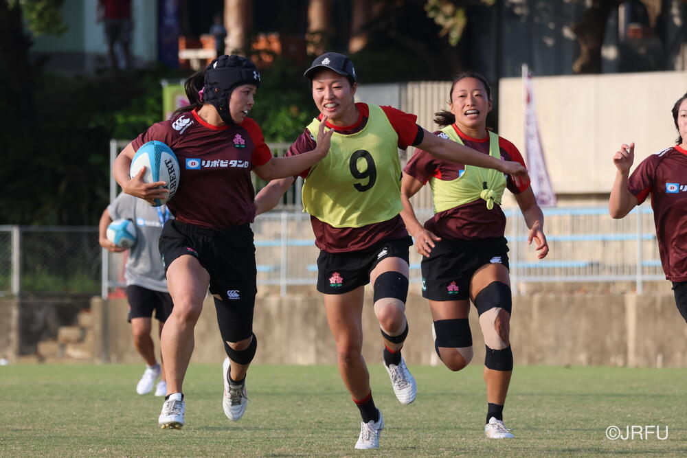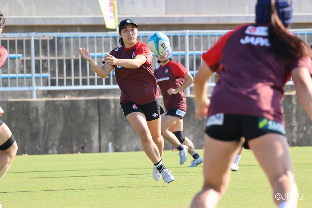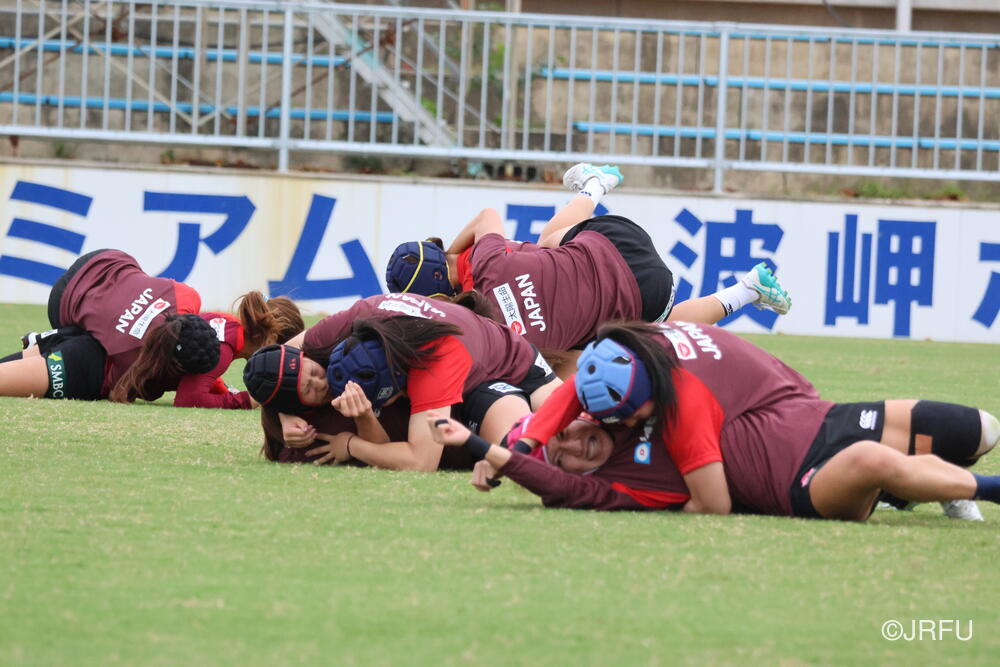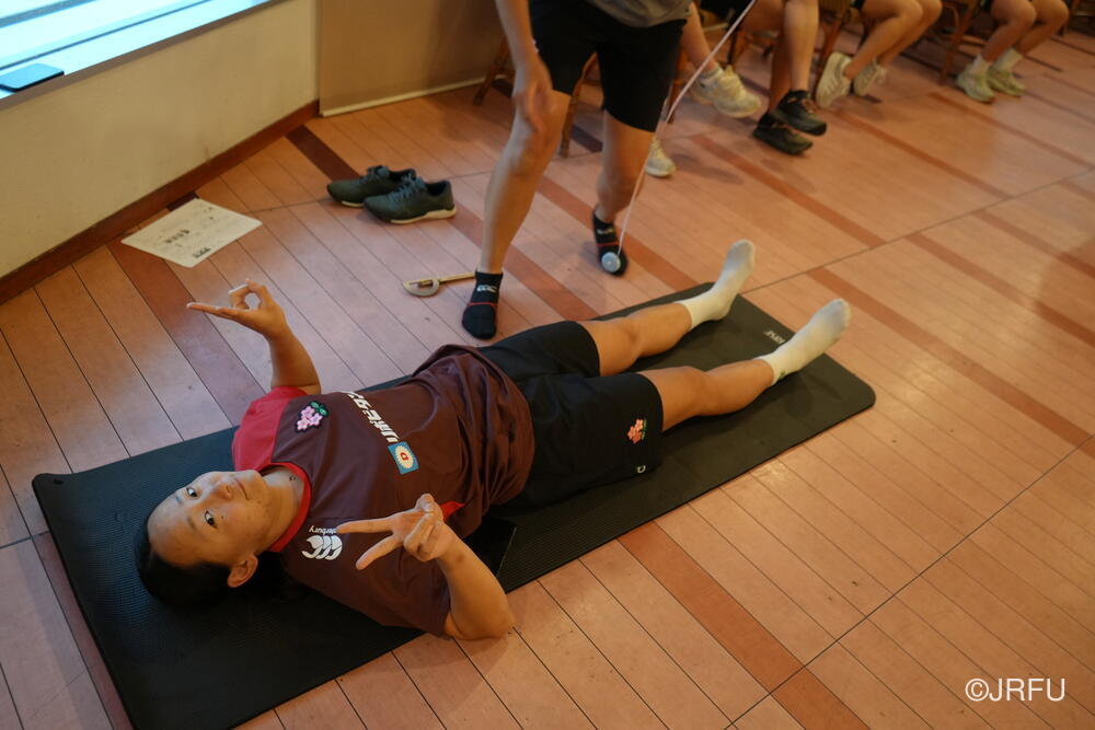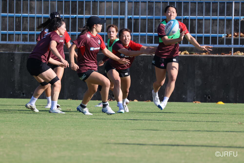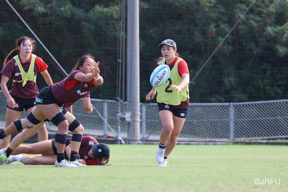 その後、ゲーム前のウォーミングアップから始まり、ドバイ大会の1試合目と2試合目を想定した、オリジナルルールの7対7を行いました。合宿前半に取り組んできたことにチャレンジし、敵味方関係なく、17人全員がサクラセブンズのラグビーを体現しようとする姿勢が見られました。