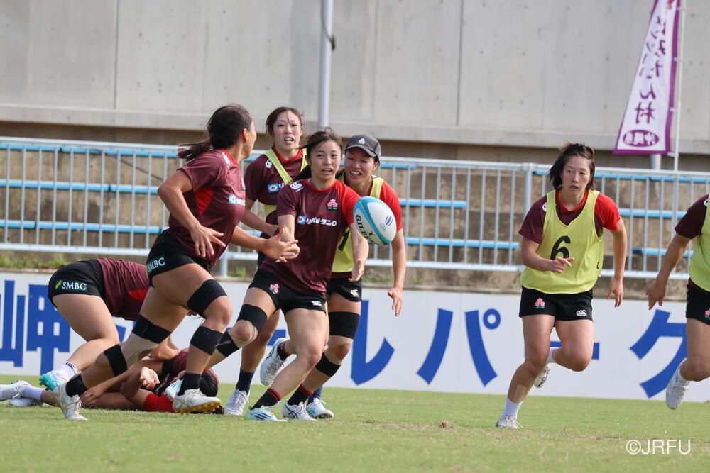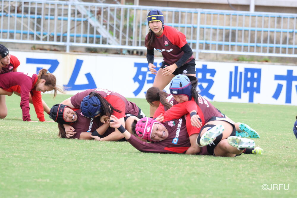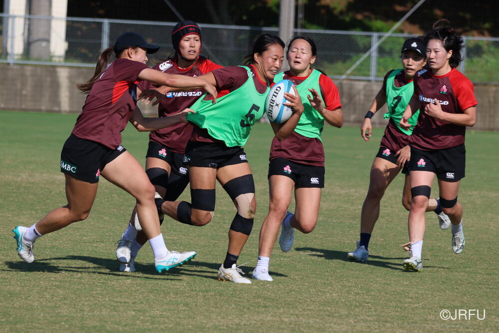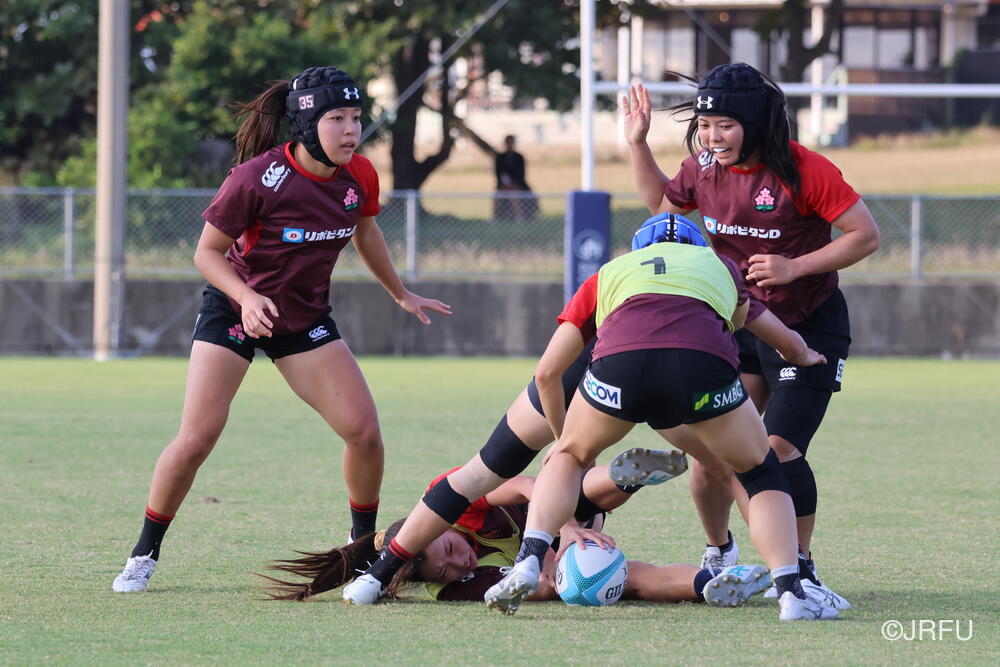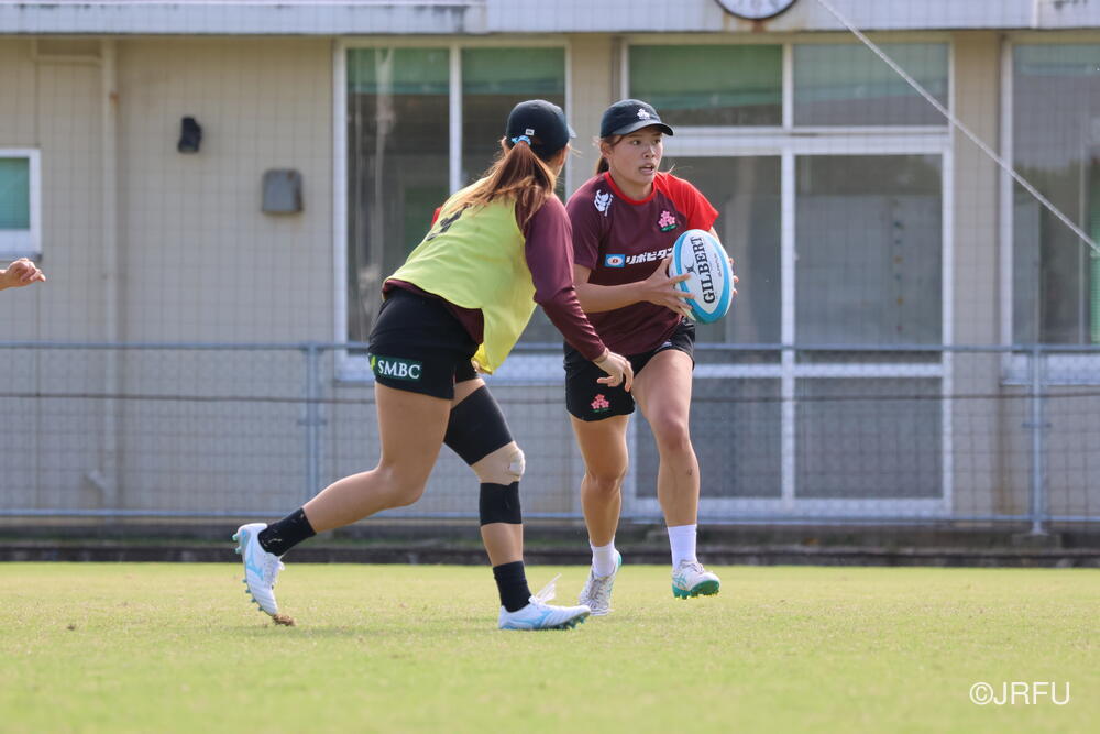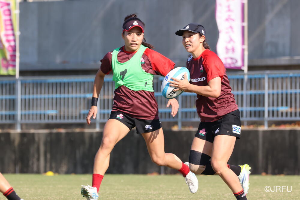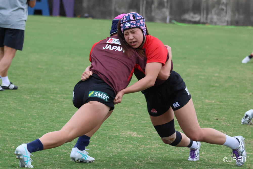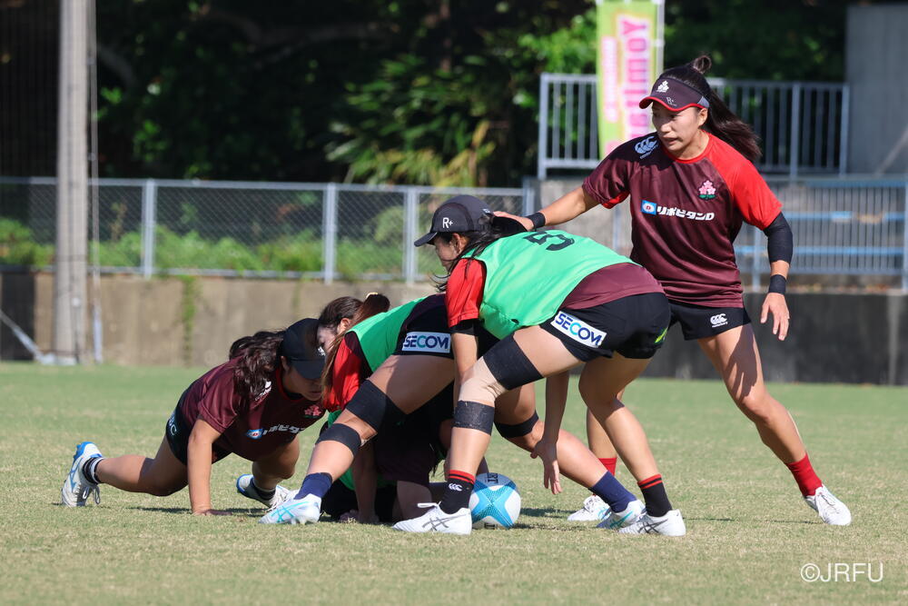 その後、ゲーム前のウォーミングアップから始まり、ドバイ大会の1試合目と2試合目を想定した、オリジナルルールの7対7を行いました。合宿前半に取り組んできたことにチャレンジし、敵味方関係なく、17人全員がサクラセブンズのラグビーを体現しようとする姿勢が見られました。
