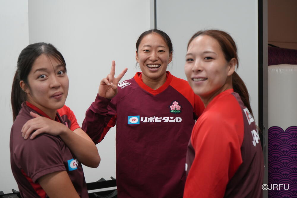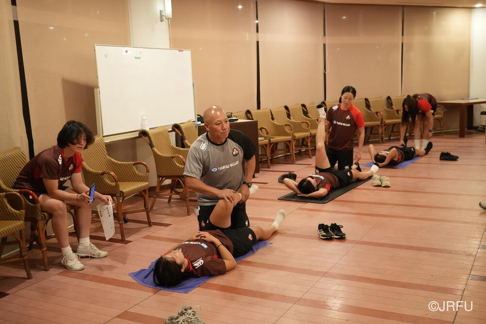 昨夜のミーティングで選手たちから提案されたことを採用するため、ゲームウォーミングアップ前に丁寧に確認しました。その後、全員でサクラセブンズにとって大切なことを一つ一つ意識しながらウォーミングアップを行いました。