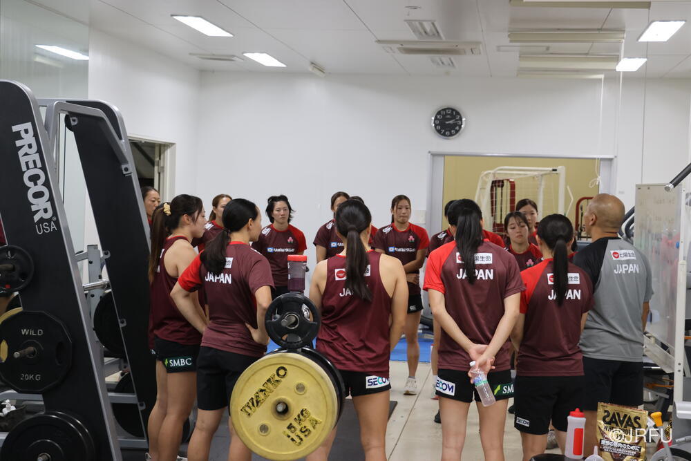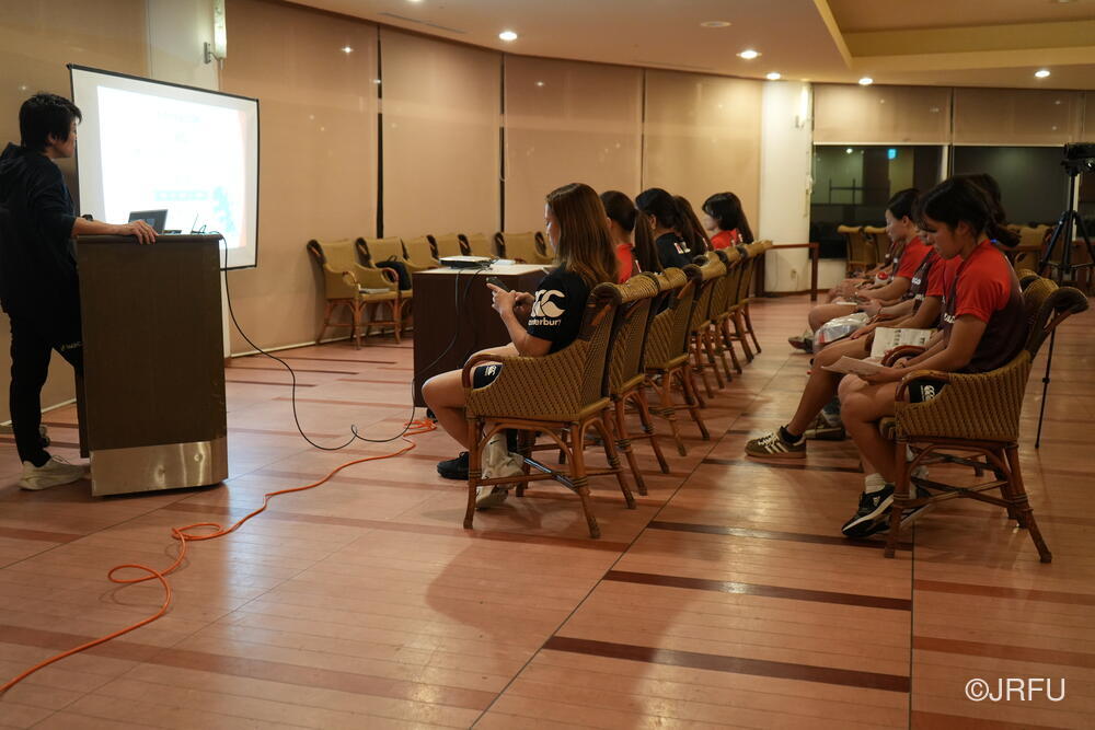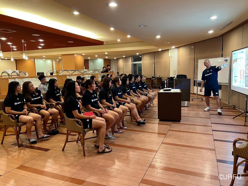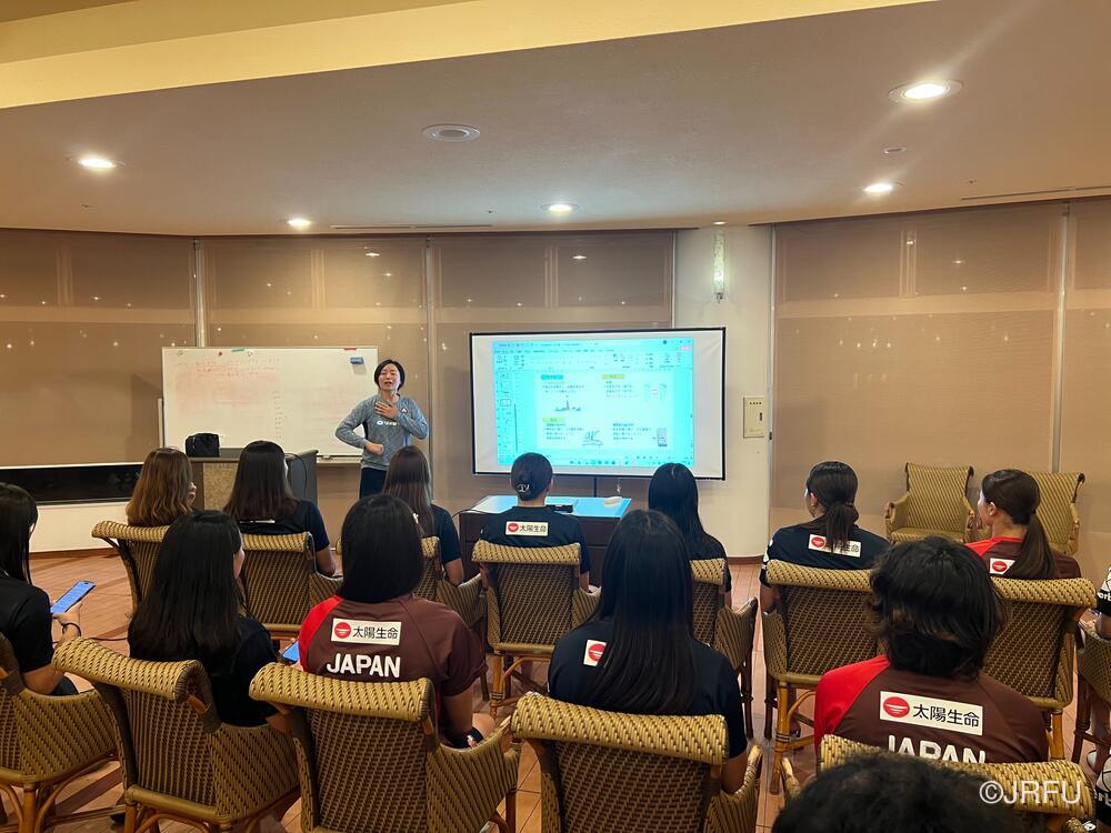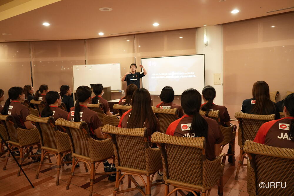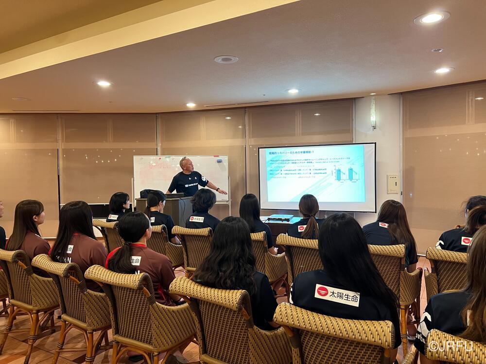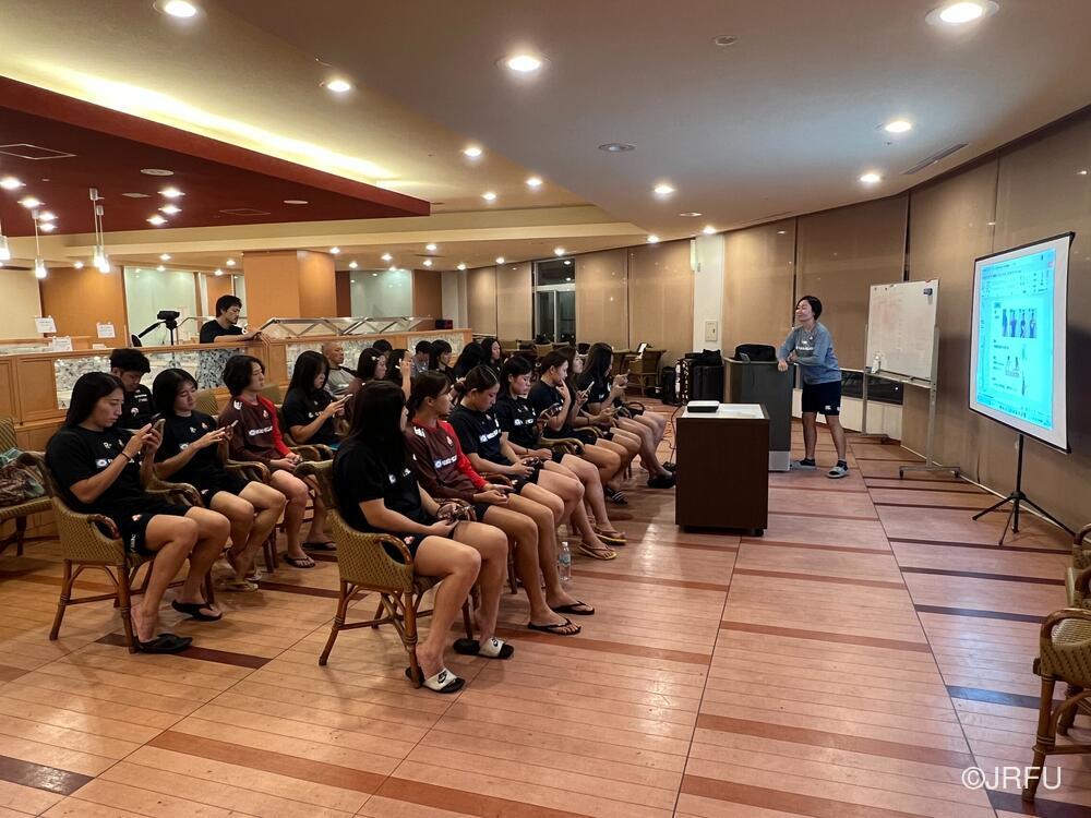 最後に坂田S&Cコーチから海外遠征時の栄養管理についてレクチャーしていただきました。これから始まる9つの世界大会で最後までベストコンディションでベストパフォーマンスを発揮できるよう、どの国へ訪れても現地の食べ物を工夫しながら栄養摂取していきます。