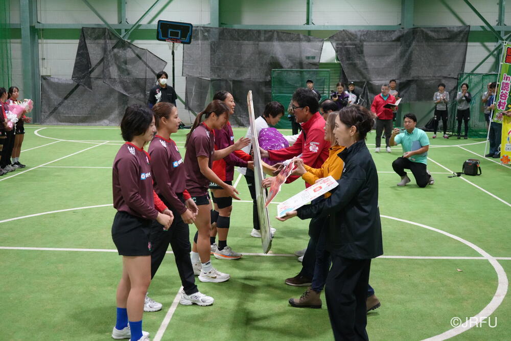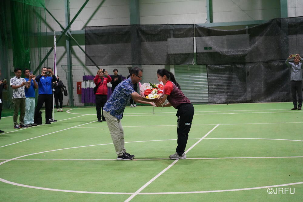 読谷村の方々から、激励のお言葉と花束、そしてたくさんの特産品を贈呈していただきました。SDSを代表して矢崎選手が、いつも温かく迎え入れてくださる読谷村の方々への感謝の気持ちとドバイ大会への意気込みを込めてご挨拶しました。