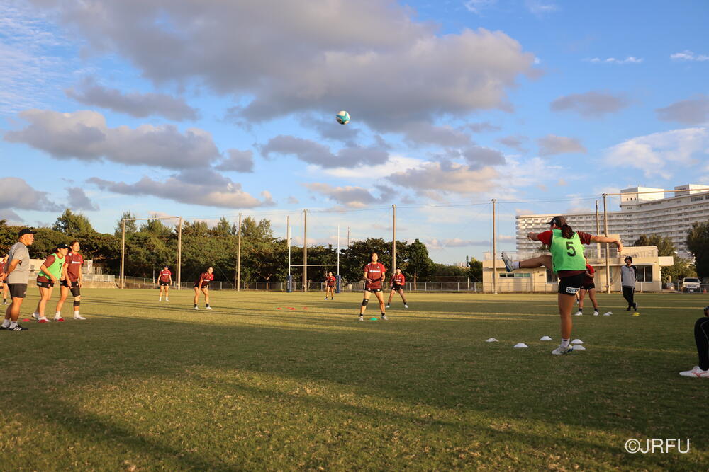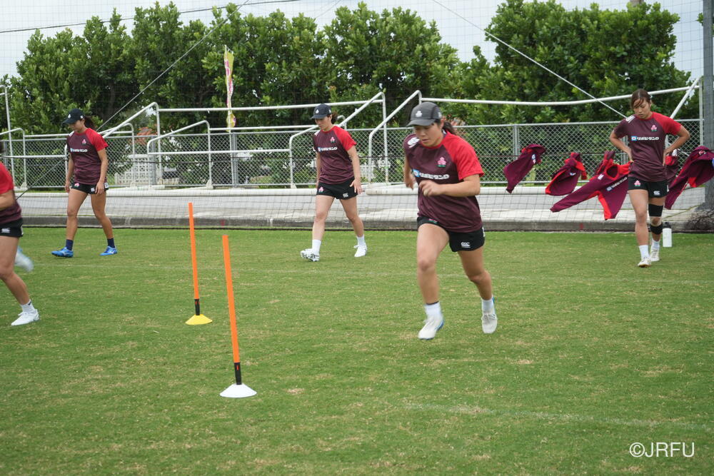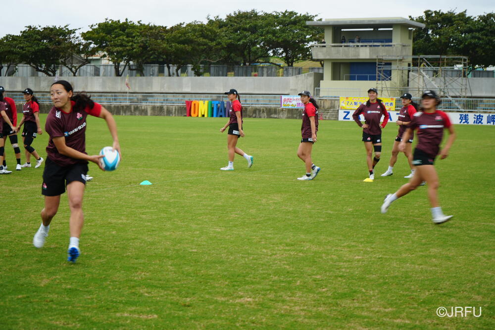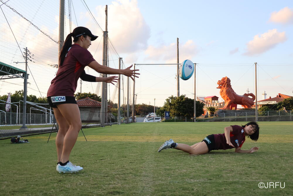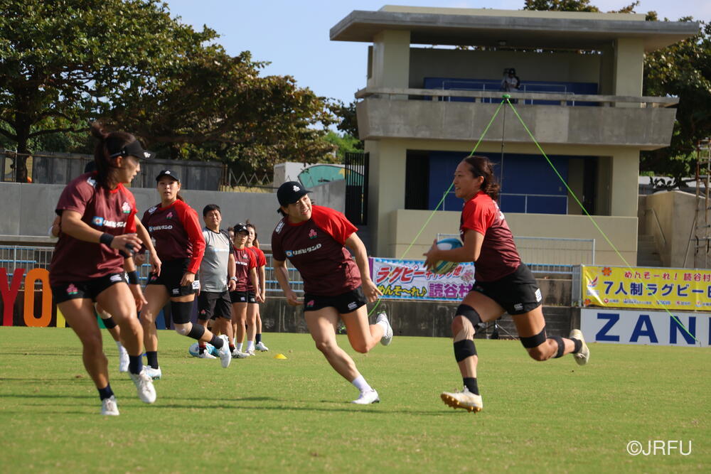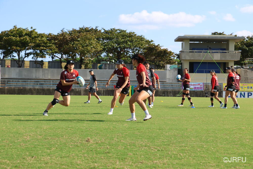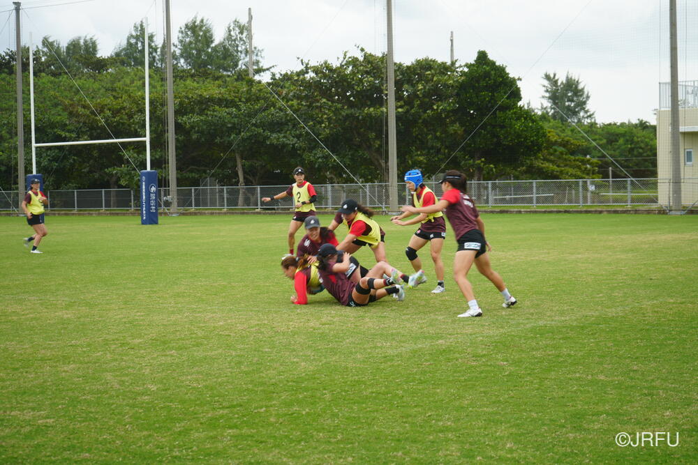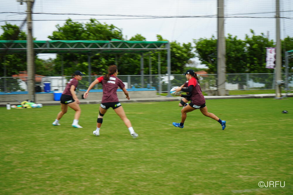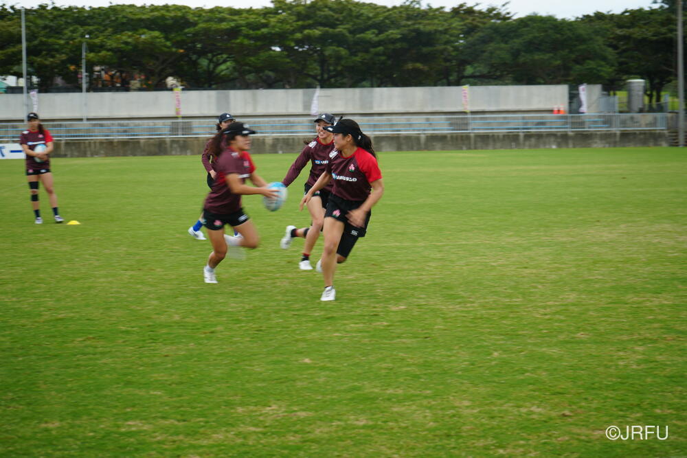 沖縄に来てから初めて青空が見え、温かい1日が始まりました。午前中は昨夜のミーティングで振り返ったことを思い出しながら、はじめのキックオフから、サクラセブンズのアタックとディフェンスのキーファクターを意識して取り組みました。全員で動き続け、3日間で1番質も強度も高い練習となりました。