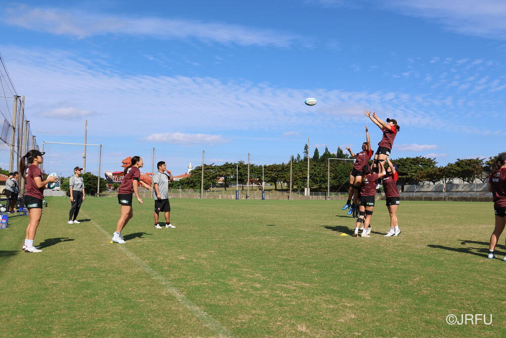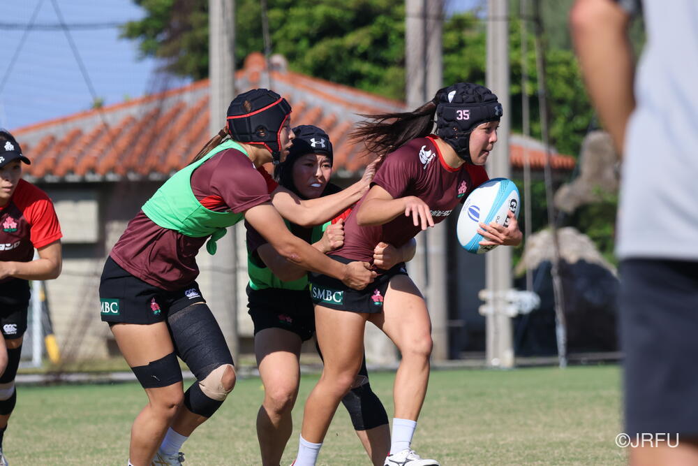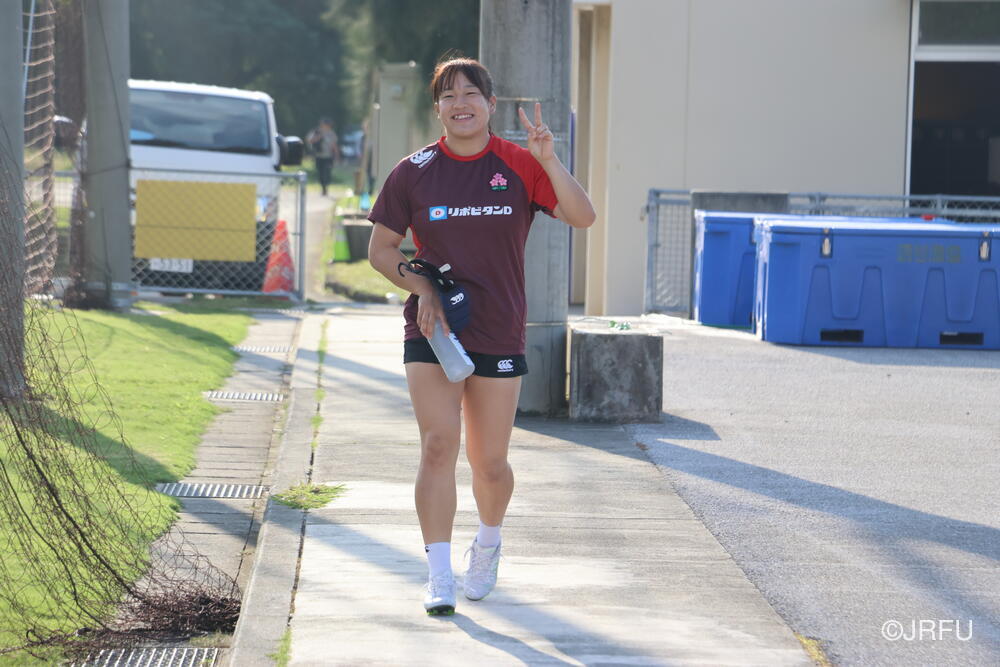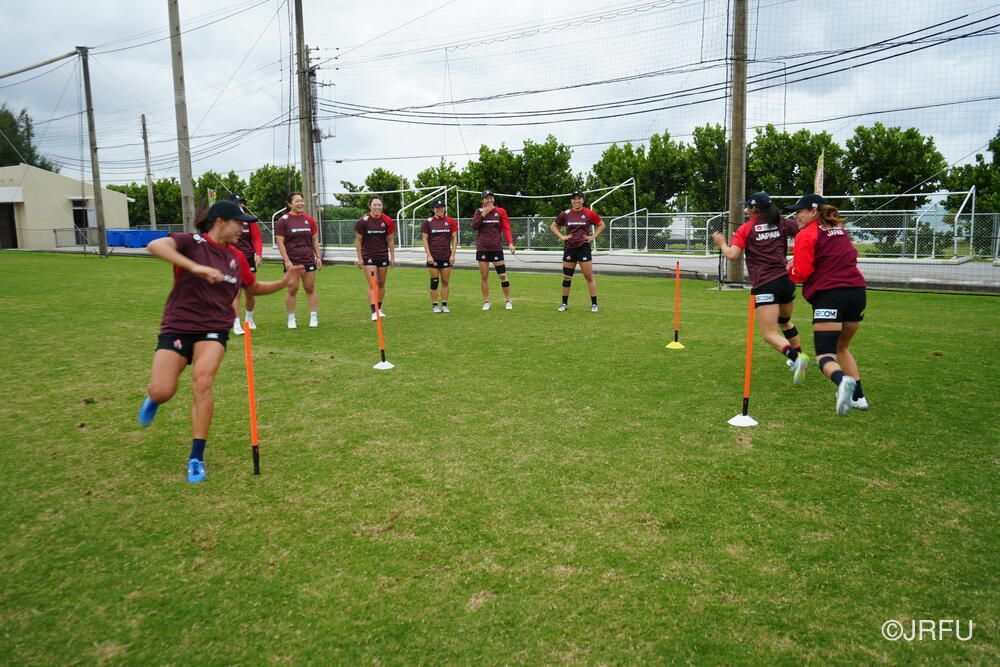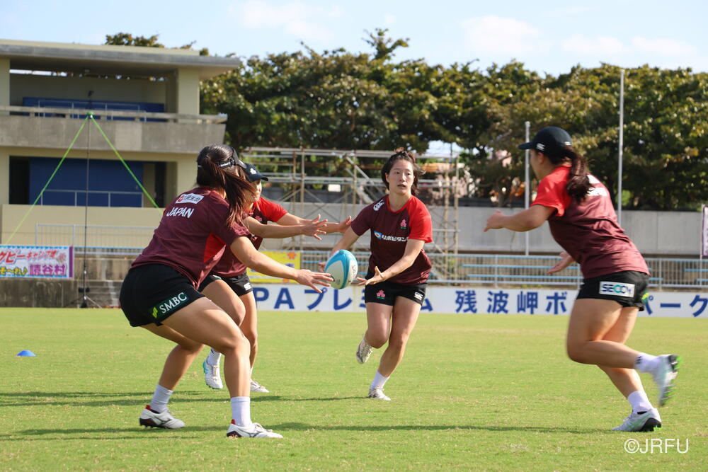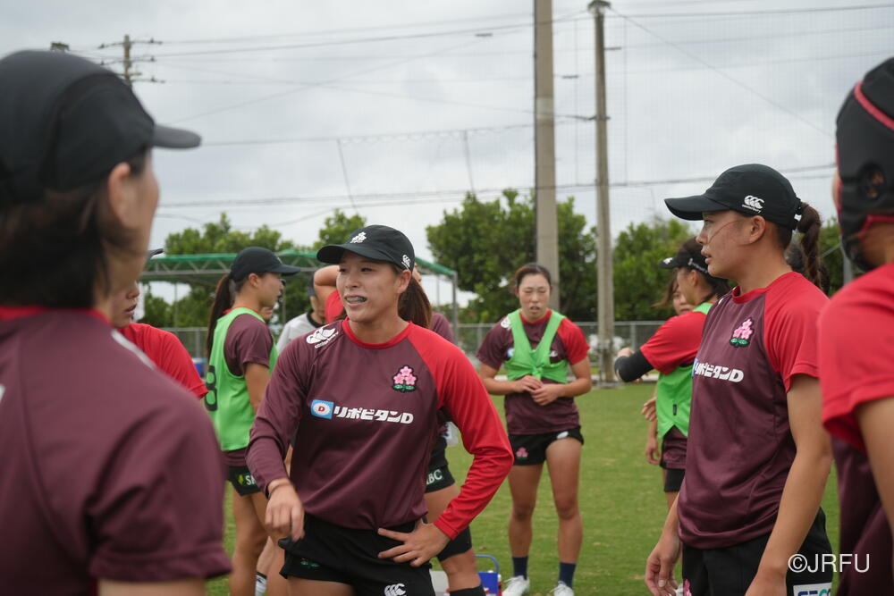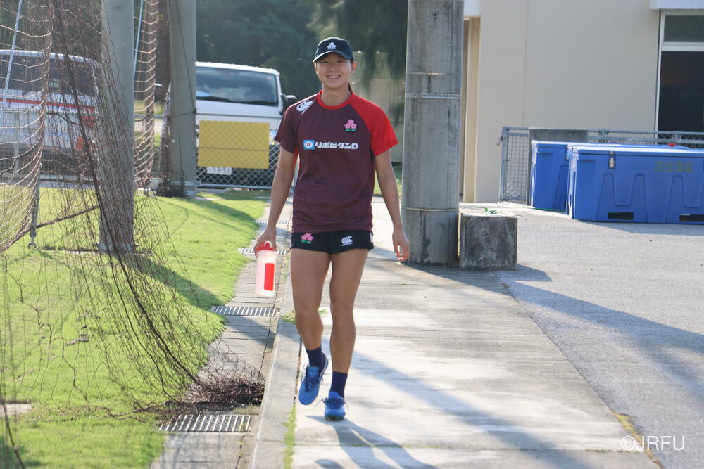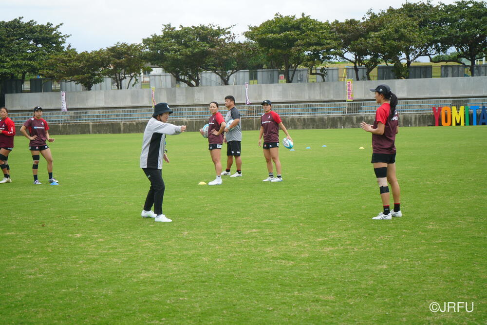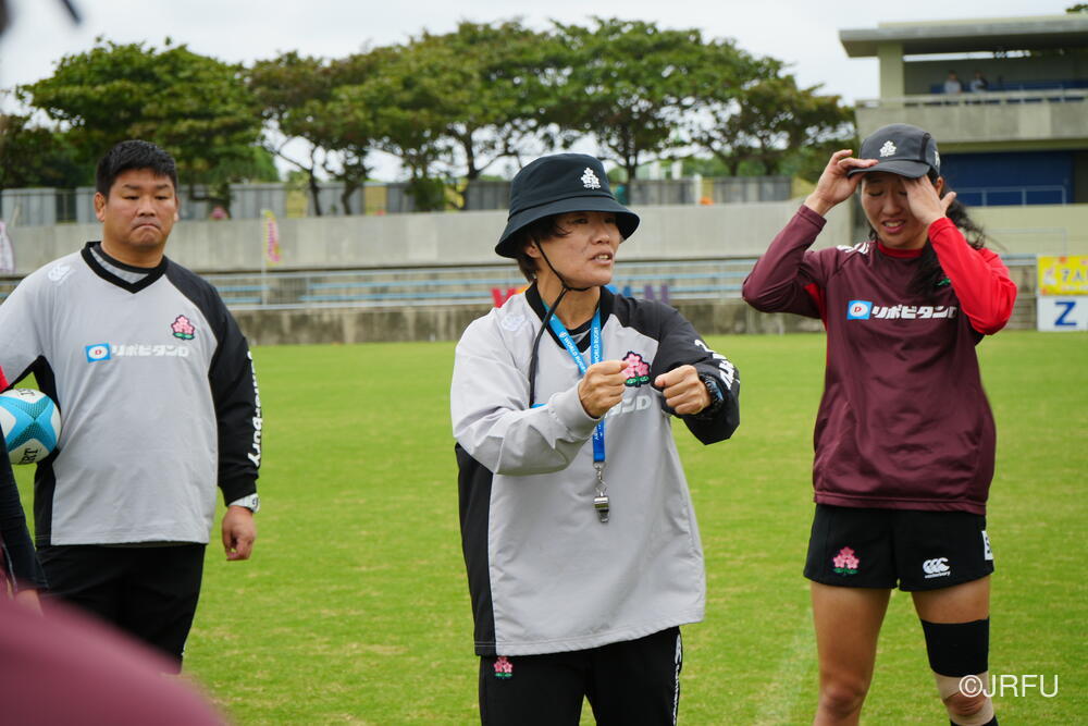 沖縄に来てから初めて青空が見え、温かい1日が始まりました。午前中は昨夜のミーティングで振り返ったことを思い出しながら、はじめのキックオフから、サクラセブンズのアタックとディフェンスのキーファクターを意識して取り組みました。全員で動き続け、3日間で1番質も強度も高い練習となりました。