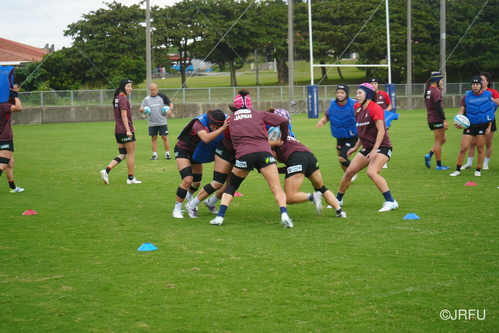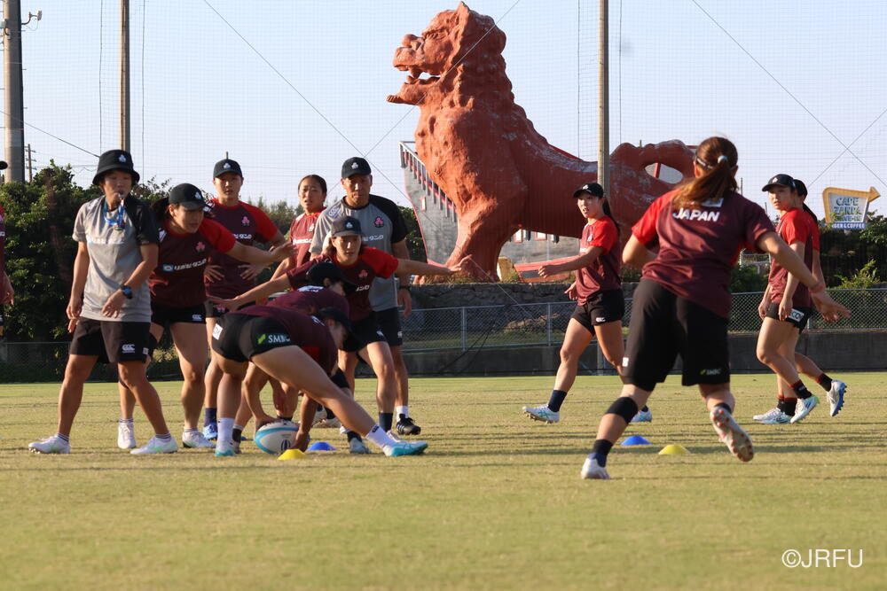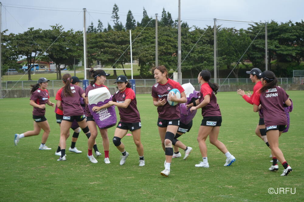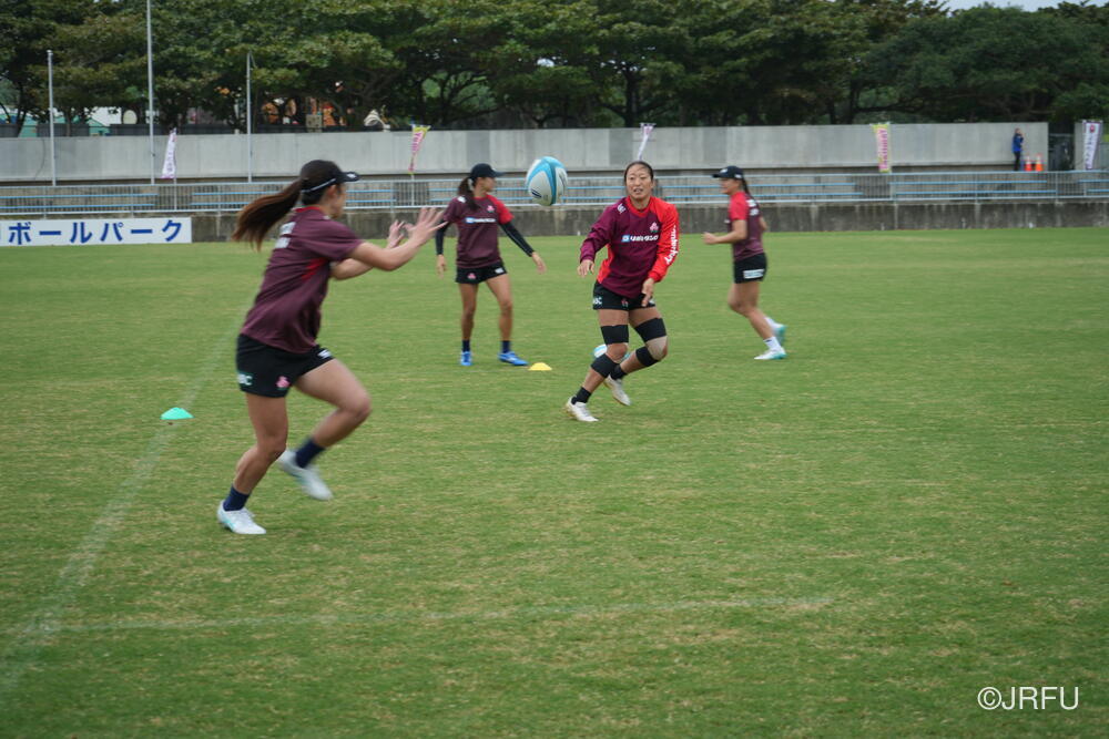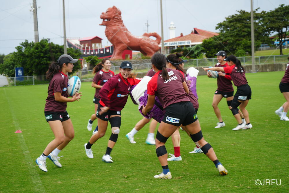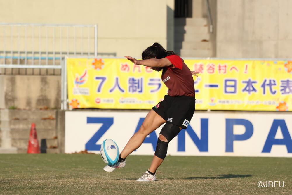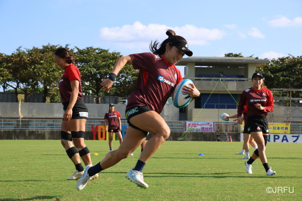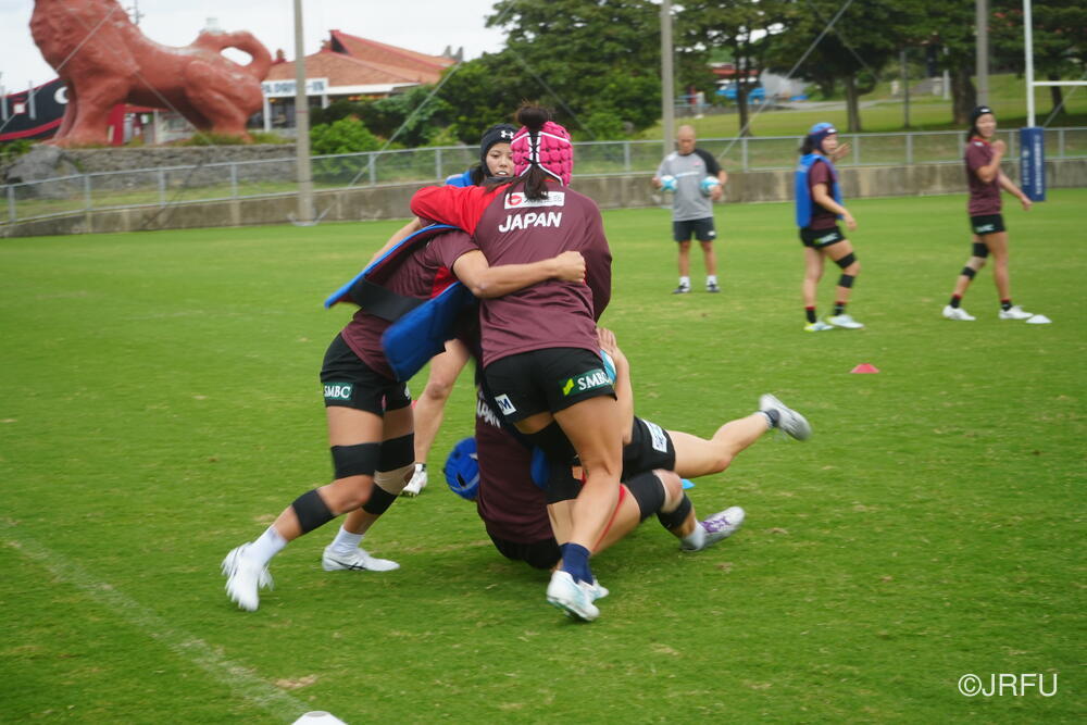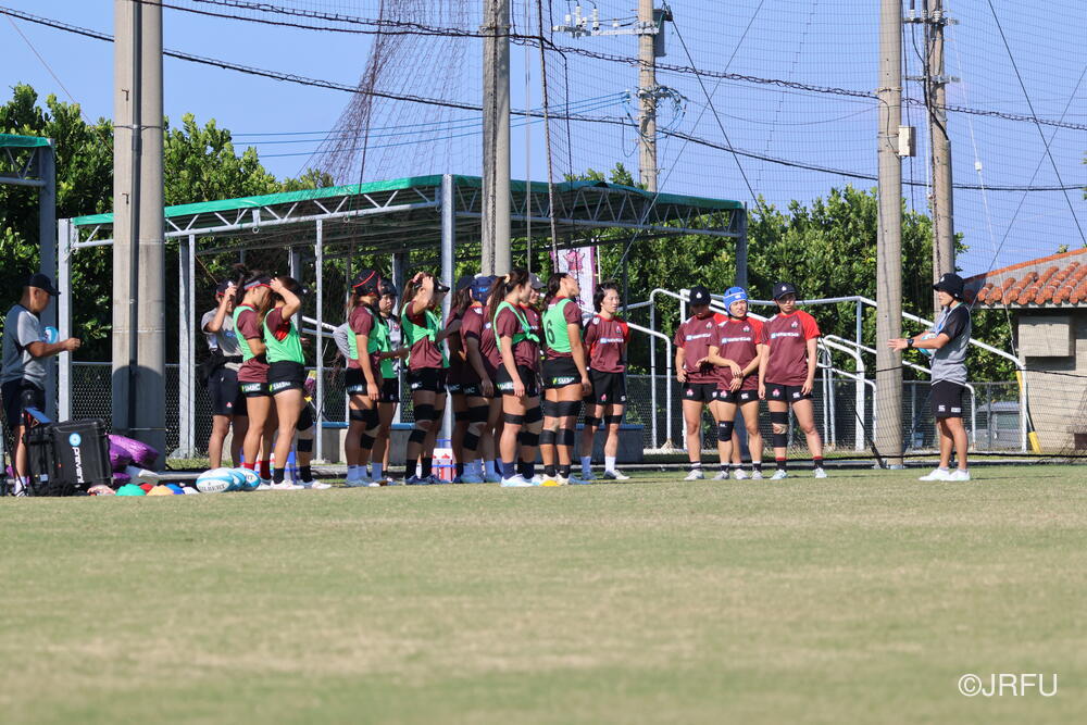 沖縄に来てから初めて青空が見え、温かい1日が始まりました。午前中は昨夜のミーティングで振り返ったことを思い出しながら、はじめのキックオフから、サクラセブンズのアタックとディフェンスのキーファクターを意識して取り組みました。全員で動き続け、3日間で1番質も強度も高い練習となりました。