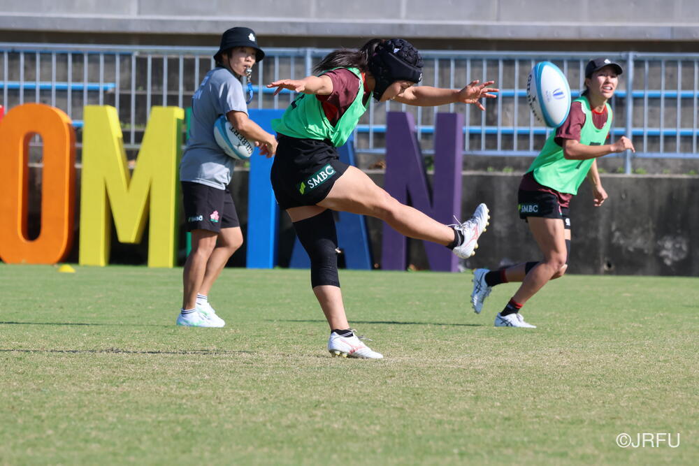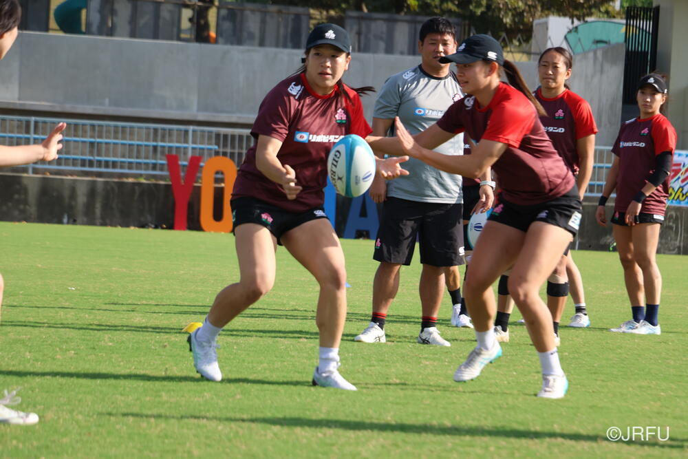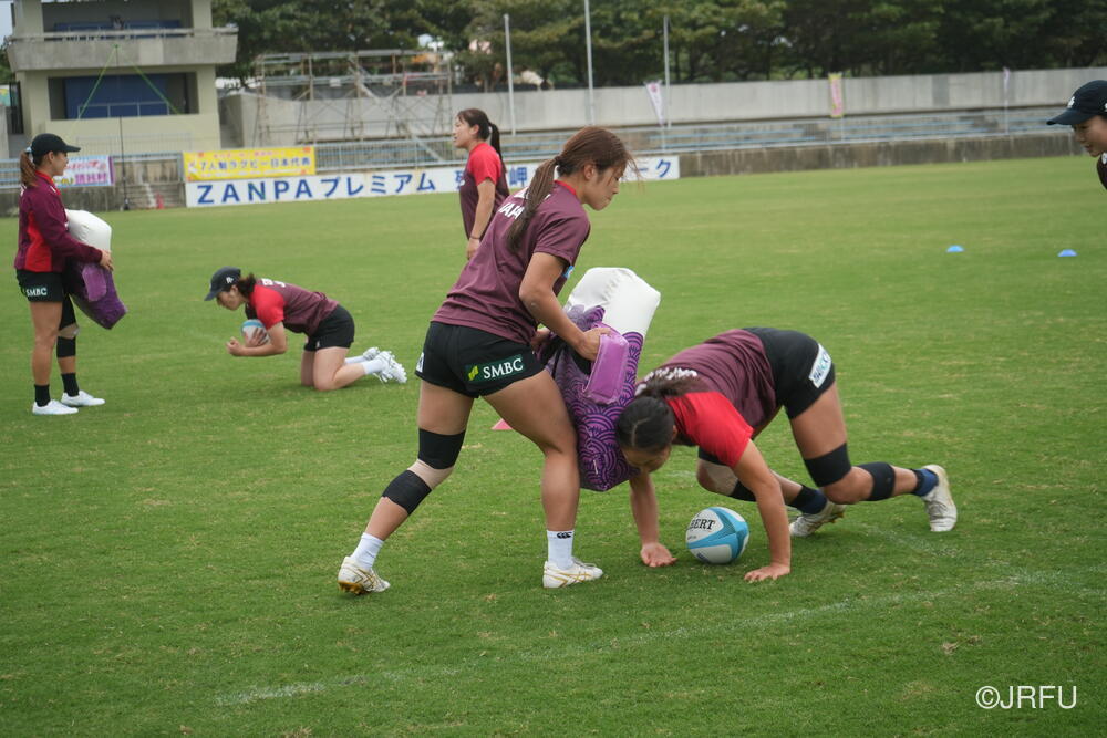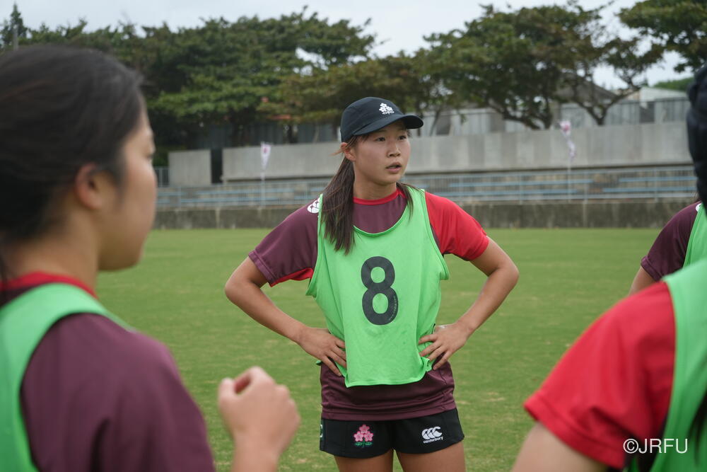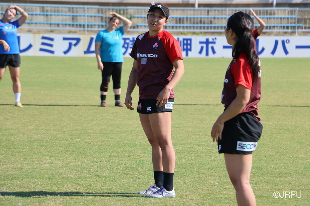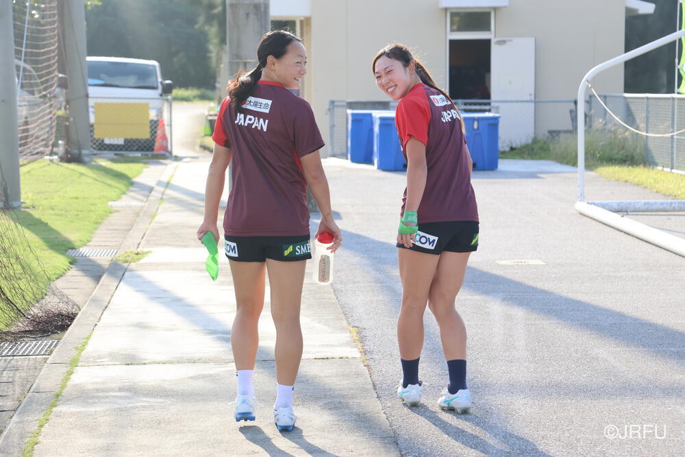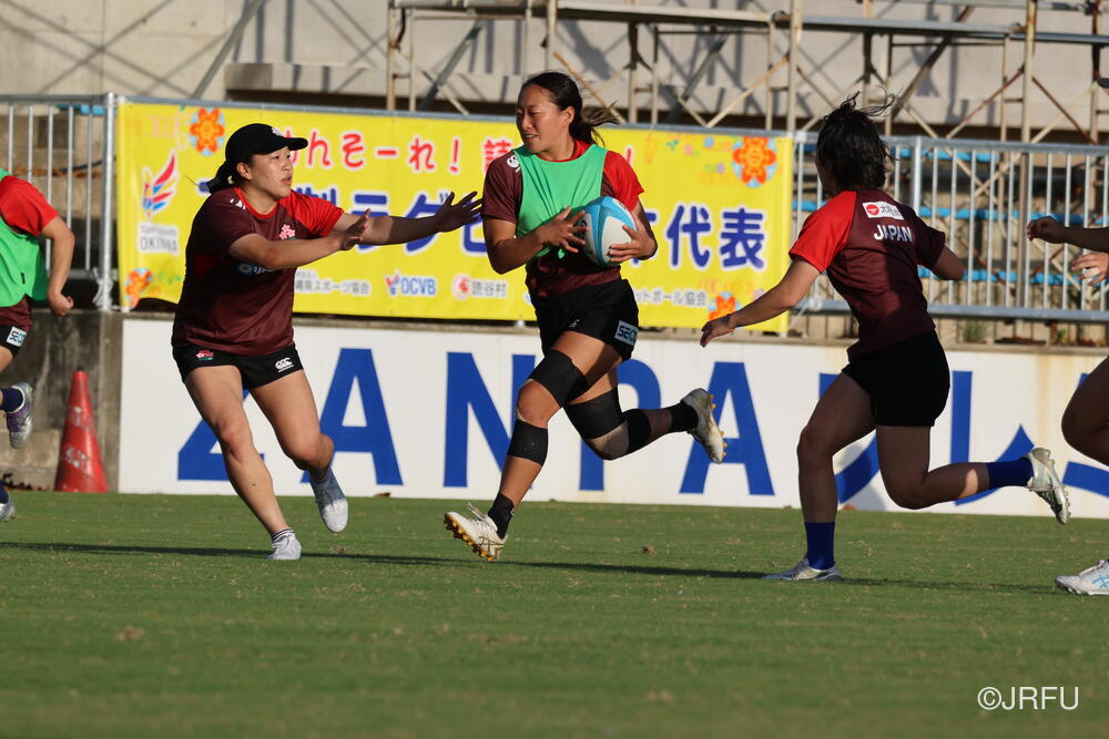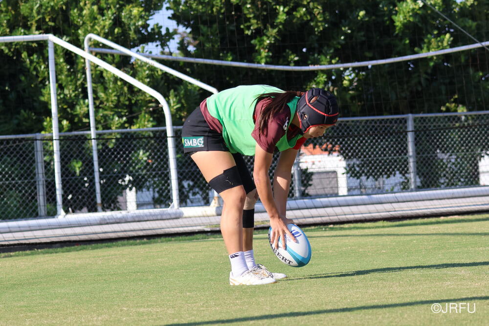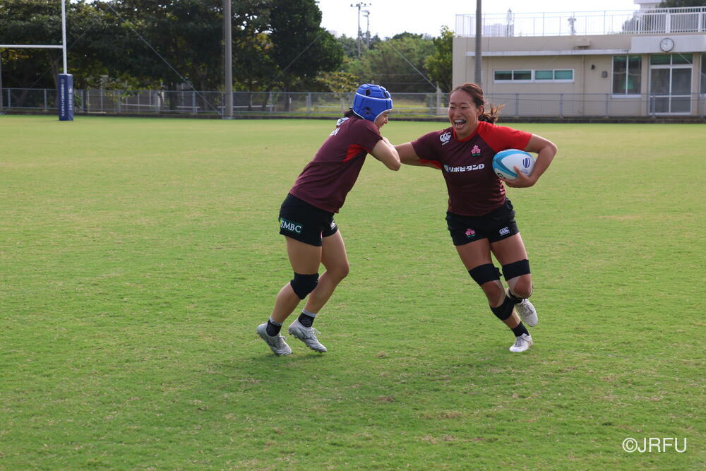沖縄に来てから初めて青空が見え、温かい1日が始まりました。午前中は昨夜のミーティングで振り返ったことを思い出しながら、はじめのキックオフから、サクラセブンズのアタックとディフェンスのキーファクターを意識して取り組みました。全員で動き続け、3日間で1番質も強度も高い練習となりました。