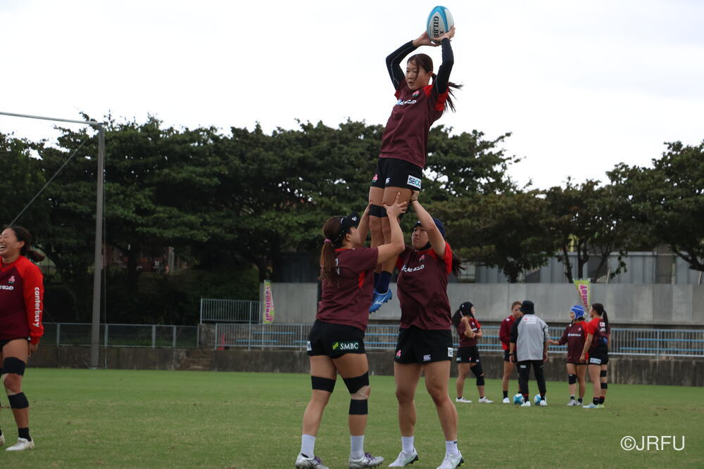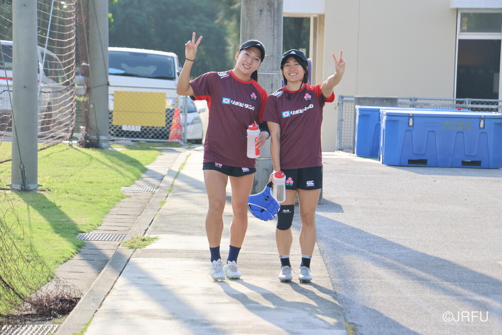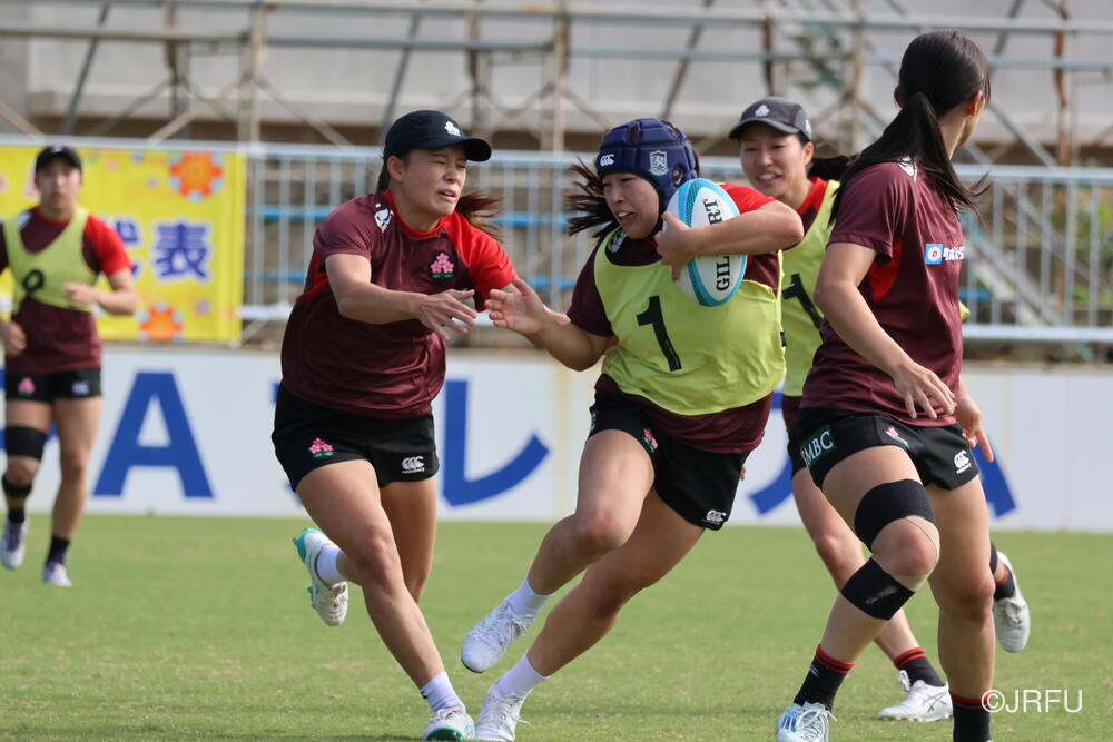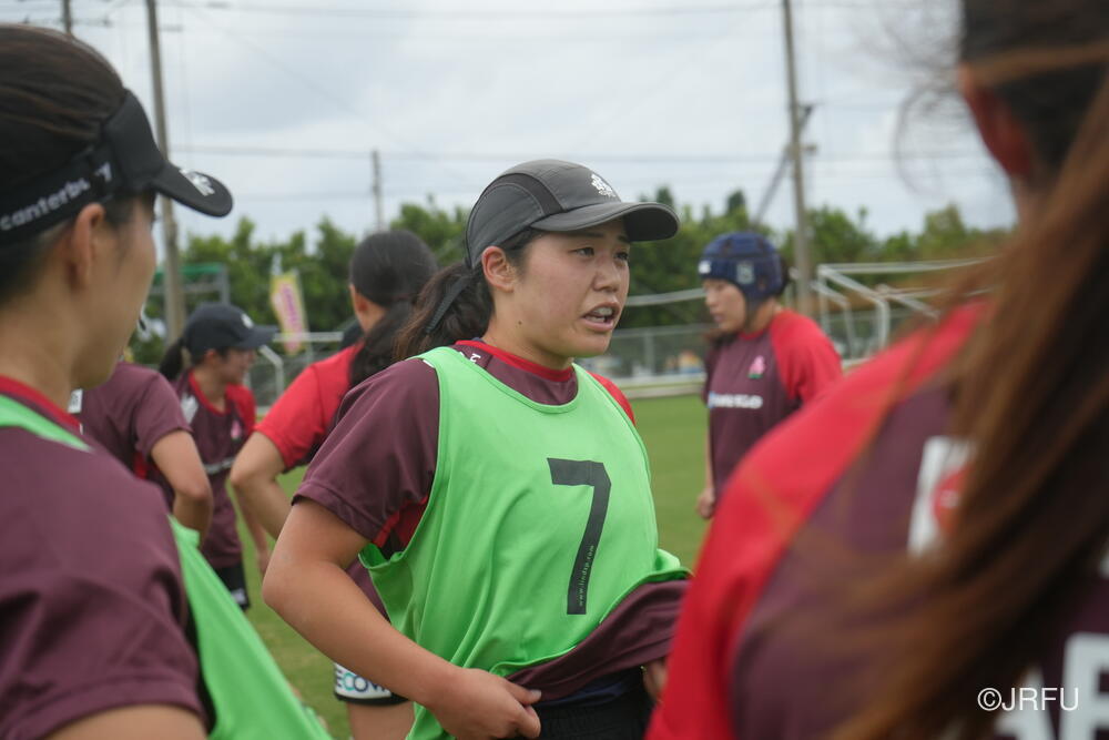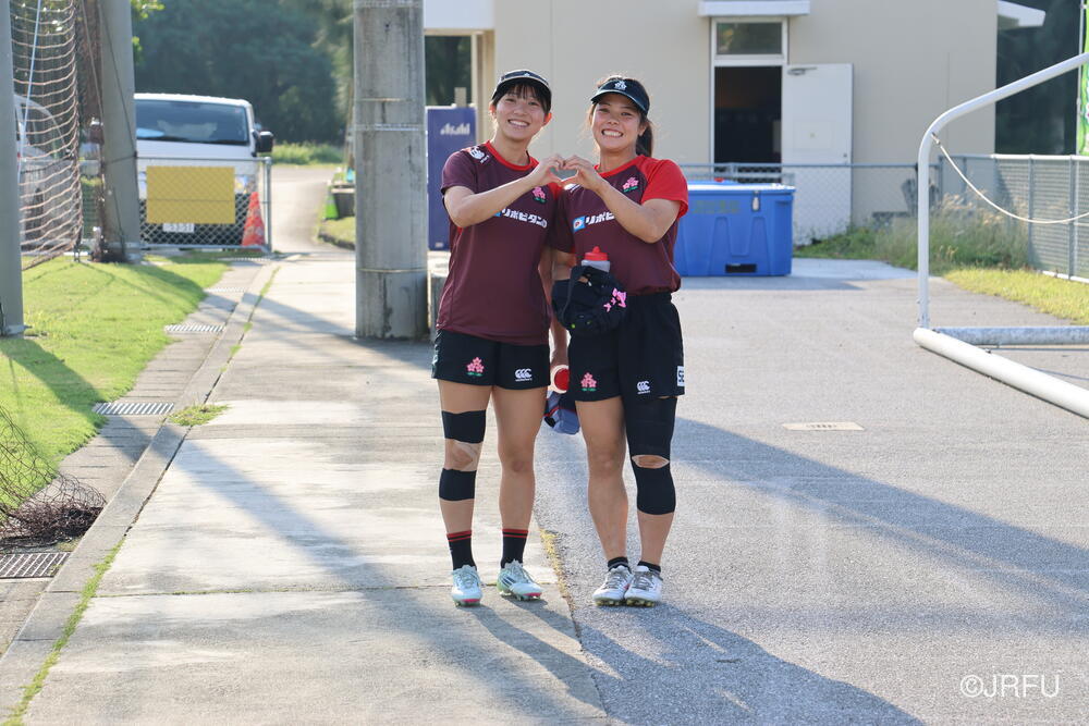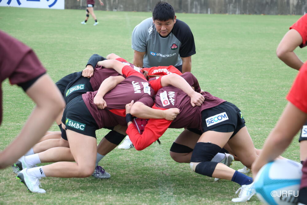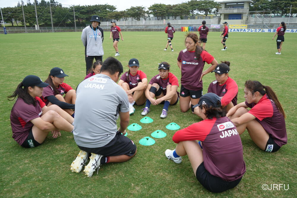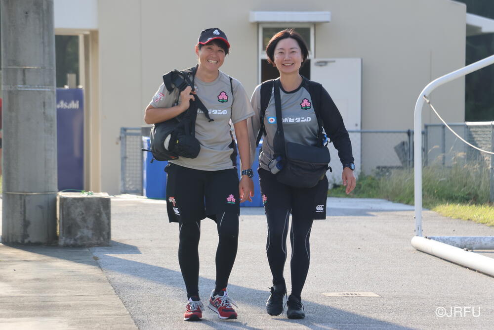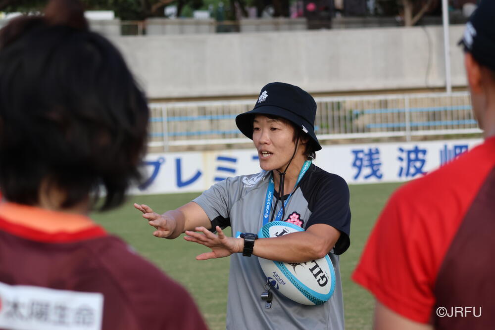 沖縄に来てから初めて青空が見え、温かい1日が始まりました。午前中は昨夜のミーティングで振り返ったことを思い出しながら、はじめのキックオフから、サクラセブンズのアタックとディフェンスのキーファクターを意識して取り組みました。全員で動き続け、3日間で1番質も強度も高い練習となりました。