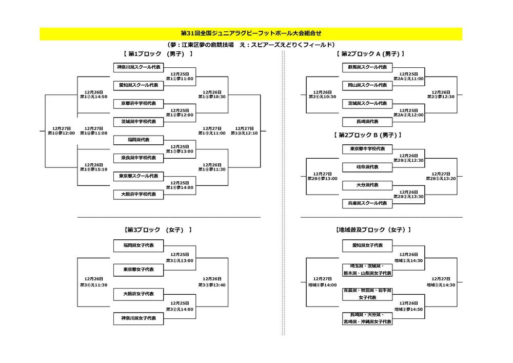 「第31回全国ジュニア・ラグビーフットボール大会」の大会組み合わせが決まりましたので、ご案内いたします。