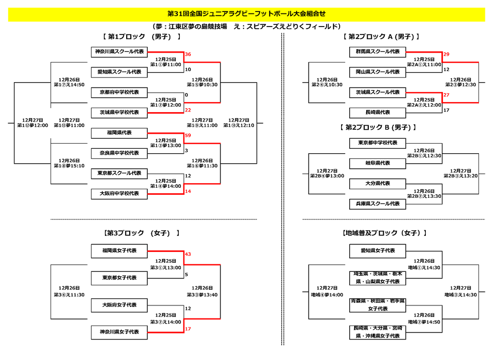 12月25日に行われた大会第1日目の試合結果を反映したトーナメント表をご案内いたします。