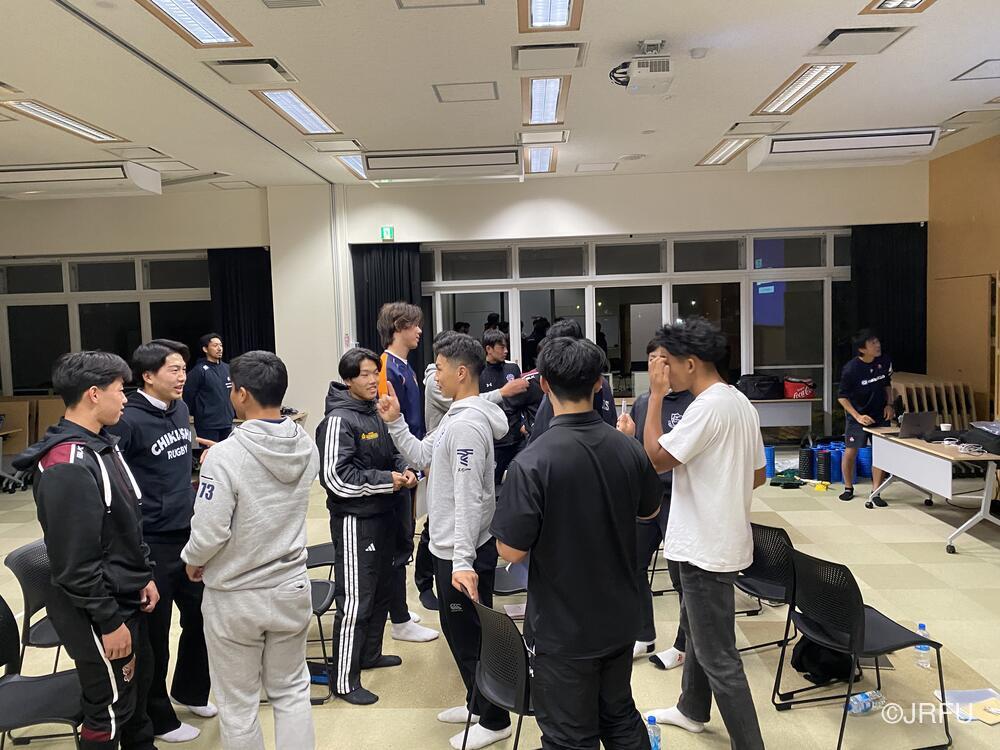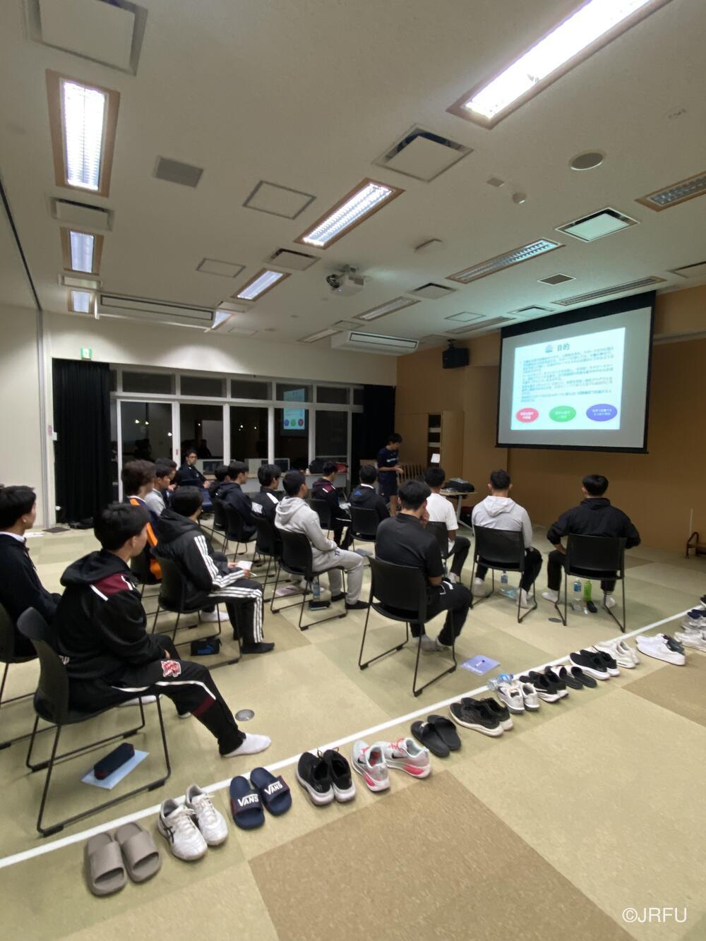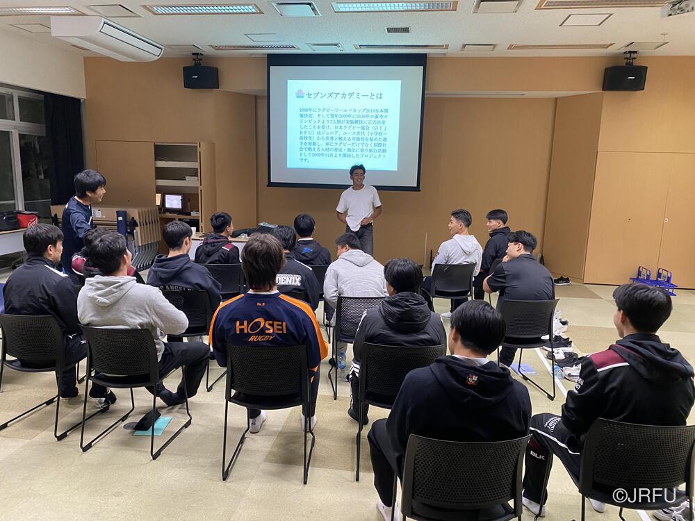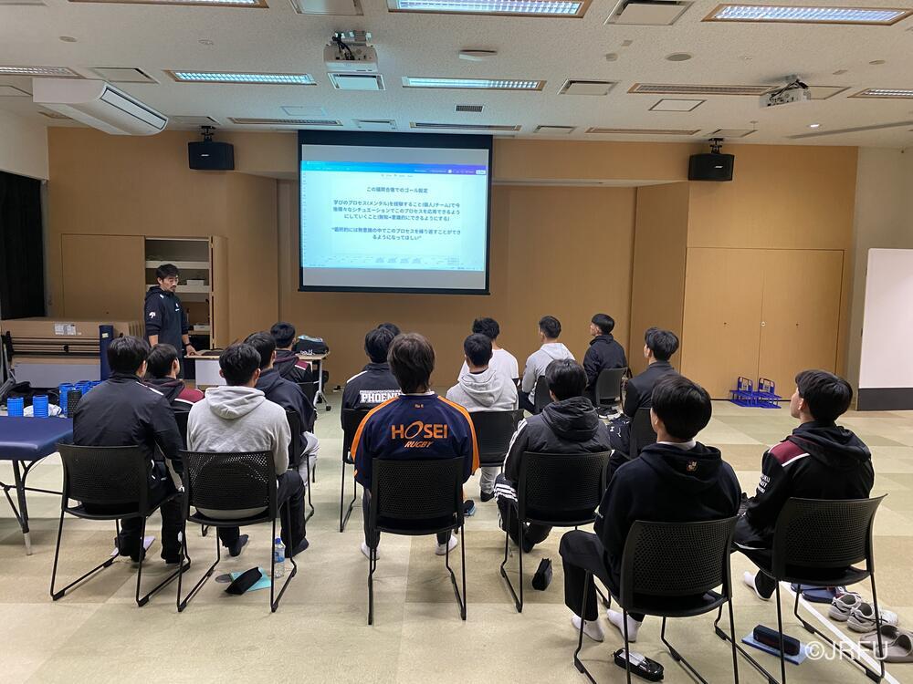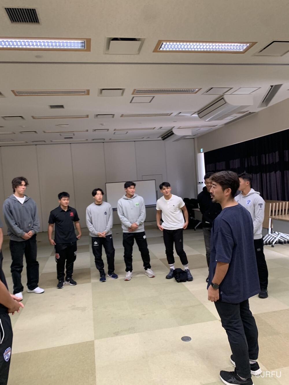 今回初めて参加する選手もいることから、改めて自己紹介の時間を持ちアイスブレーキングを行ったあと、梅田 紘一 男女セブンズ日本代表チームディレクターよりセブンズアカデミーの目的などレクチャーがあり、みんなで共通認識を持ちました。