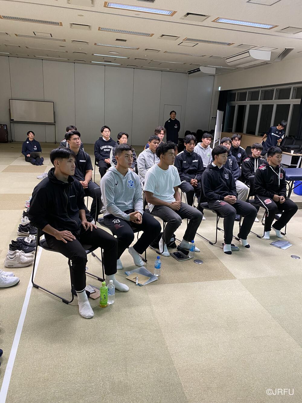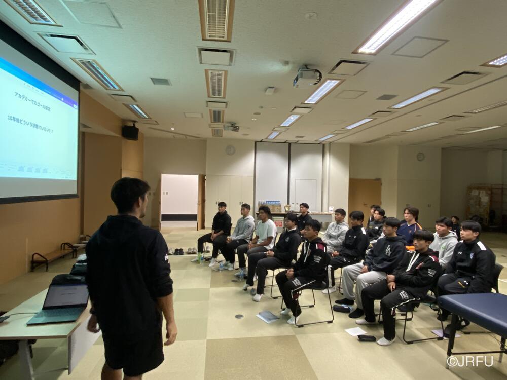 といったメッセージを選手に伝えた後、この合宿の学びが深まることを目的に皆でゴール設定をしてみよう!と投げかけ本日1日目は終了しました。