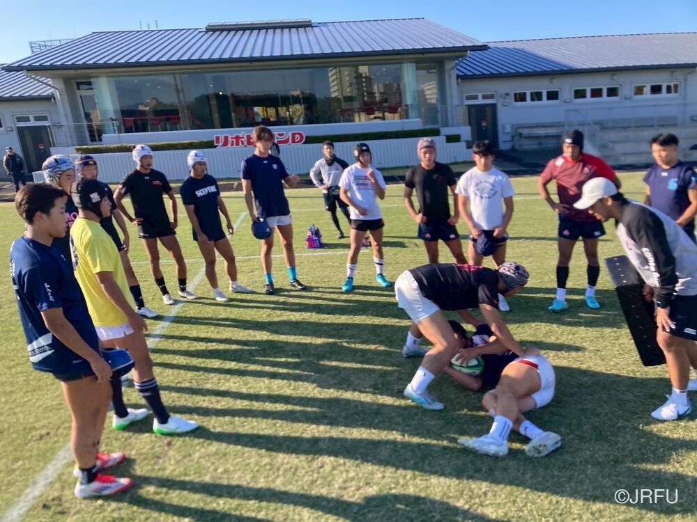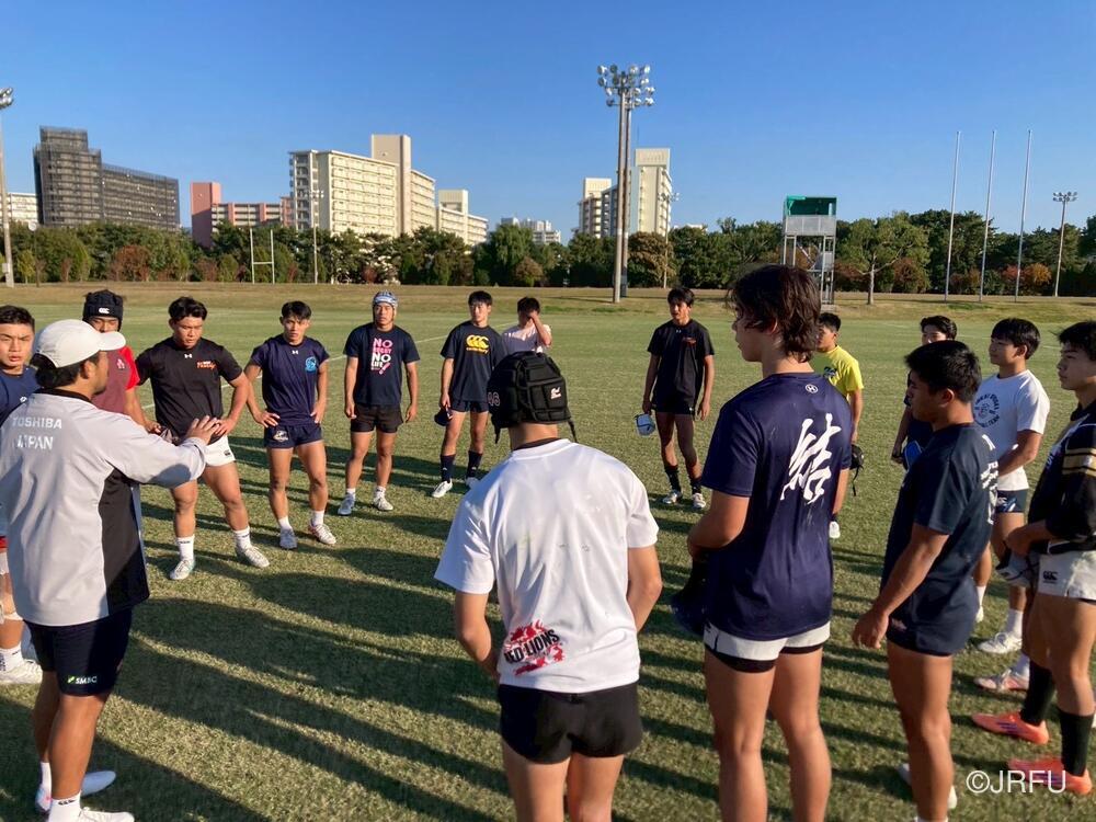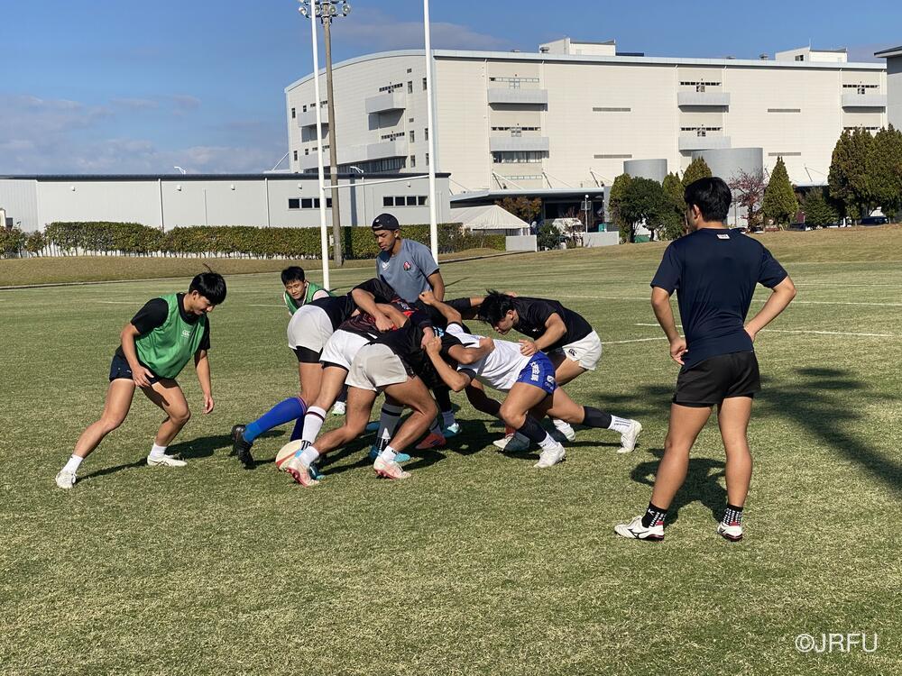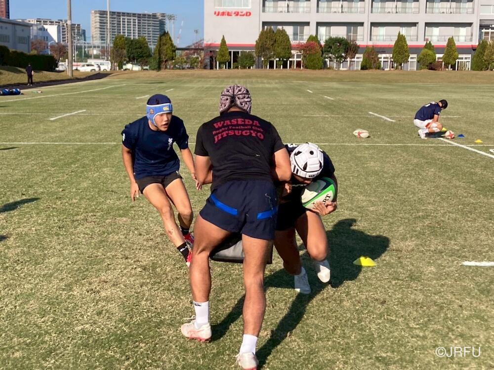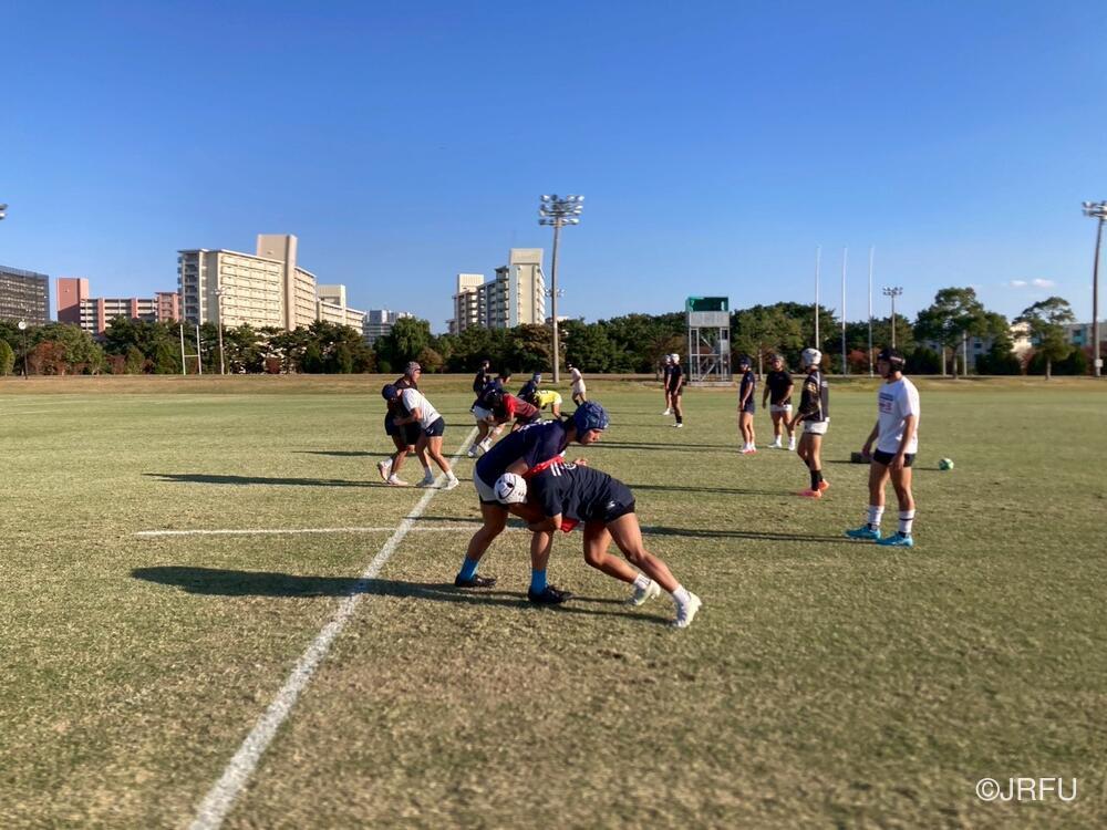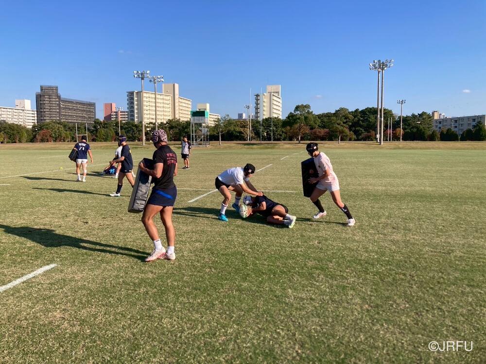 午後の練習では、コンタクトプレーにフォーカスしてブレイクダウン・タックルのセッションを行いました。コンタクト時の姿勢や頭の位置、目線を上げることなどコーチからだけでなく、選手間でも積極的に意見交換を行いました。