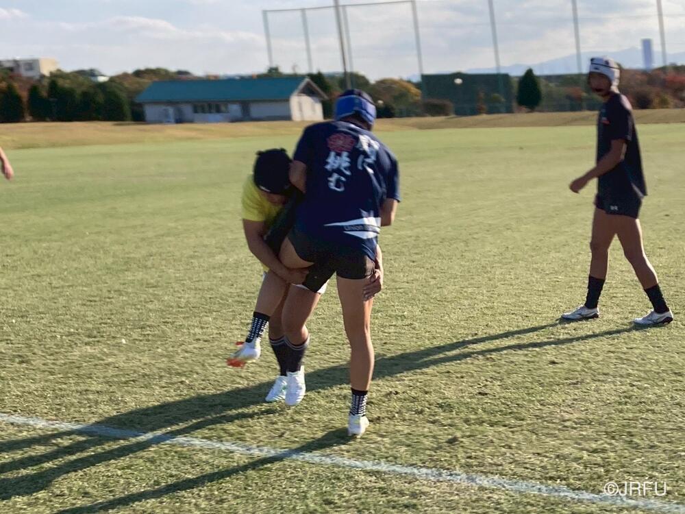 後半にはタッチ形式で7対7のセッションを行い、セットプレーからのアタックとディフェンスを確認しました。アタックではスピードやアジリティーといったそれぞれのポテンシャルを発揮しながら、コーチのアドバイスを受けることでセブンズラグビーに近づけていきます。