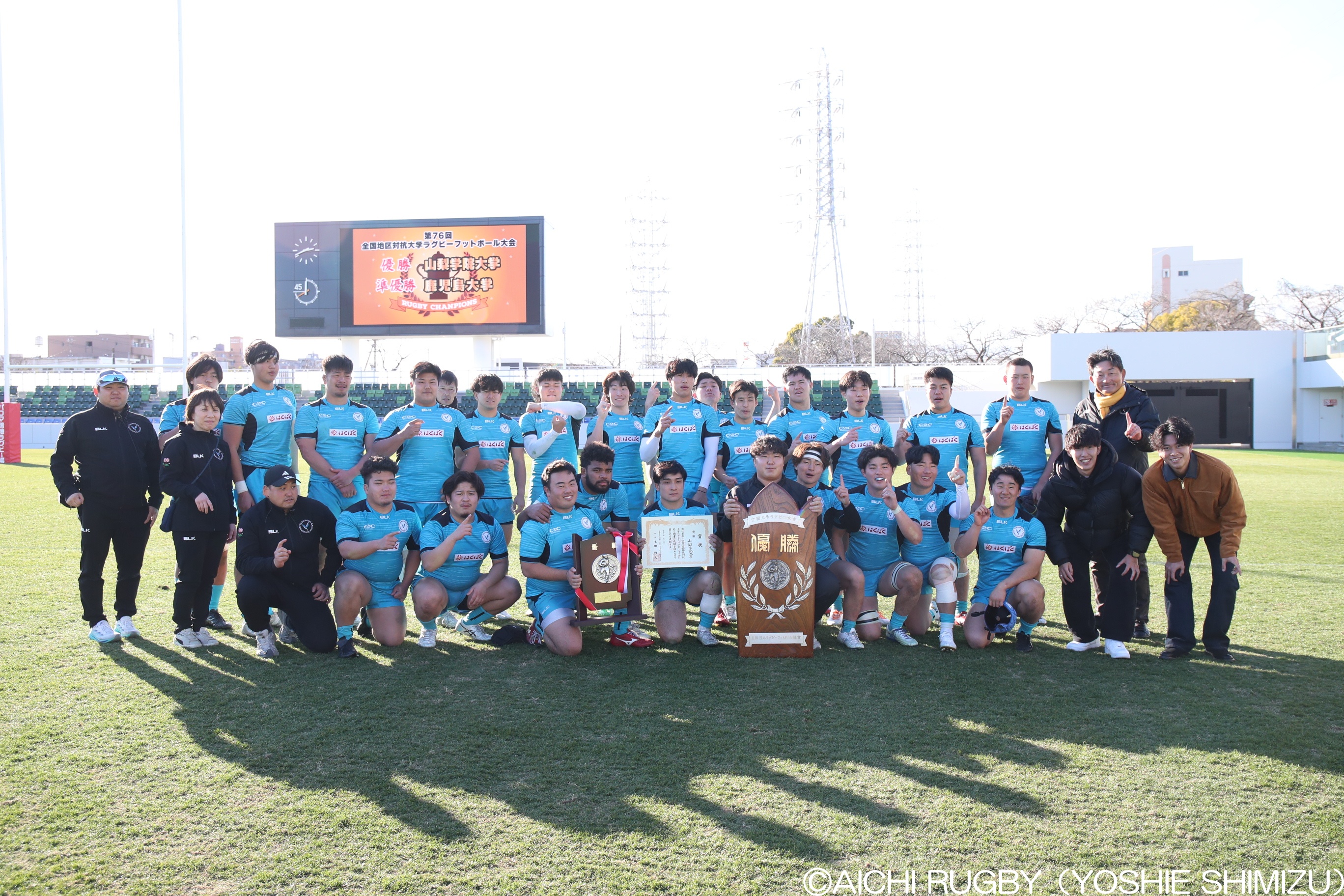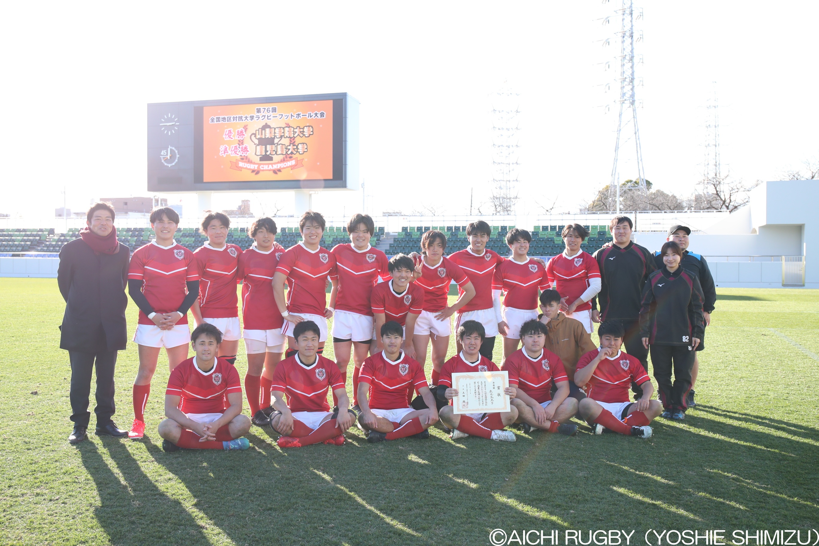 「第76回全国地区対抗大学ラグビーフットボール大会」の決勝戦が1月6日(火)に愛知県・パロマ瑞穂ラグビー場で開催され、山梨学院大学が鹿児島大学に50-0で勝利し、山梨学院大学が優勝いたしましたので、お知らせいたします。山梨学院大学の本大会優勝は初めてとなります。