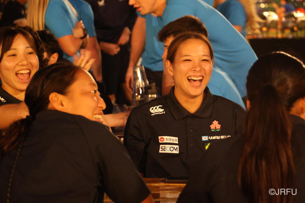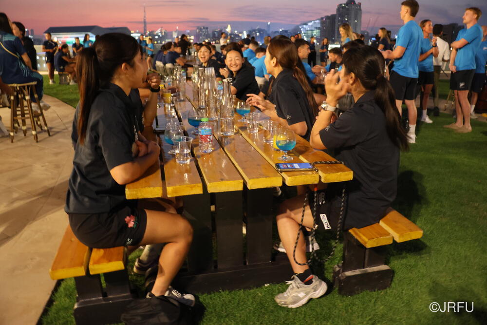 ドバイの美しい夜景が広がるテラスにワールドシリーズディビジョン1の男女全チームが集まり、歓迎セレモニーの後、楽しく夕食をとりました。