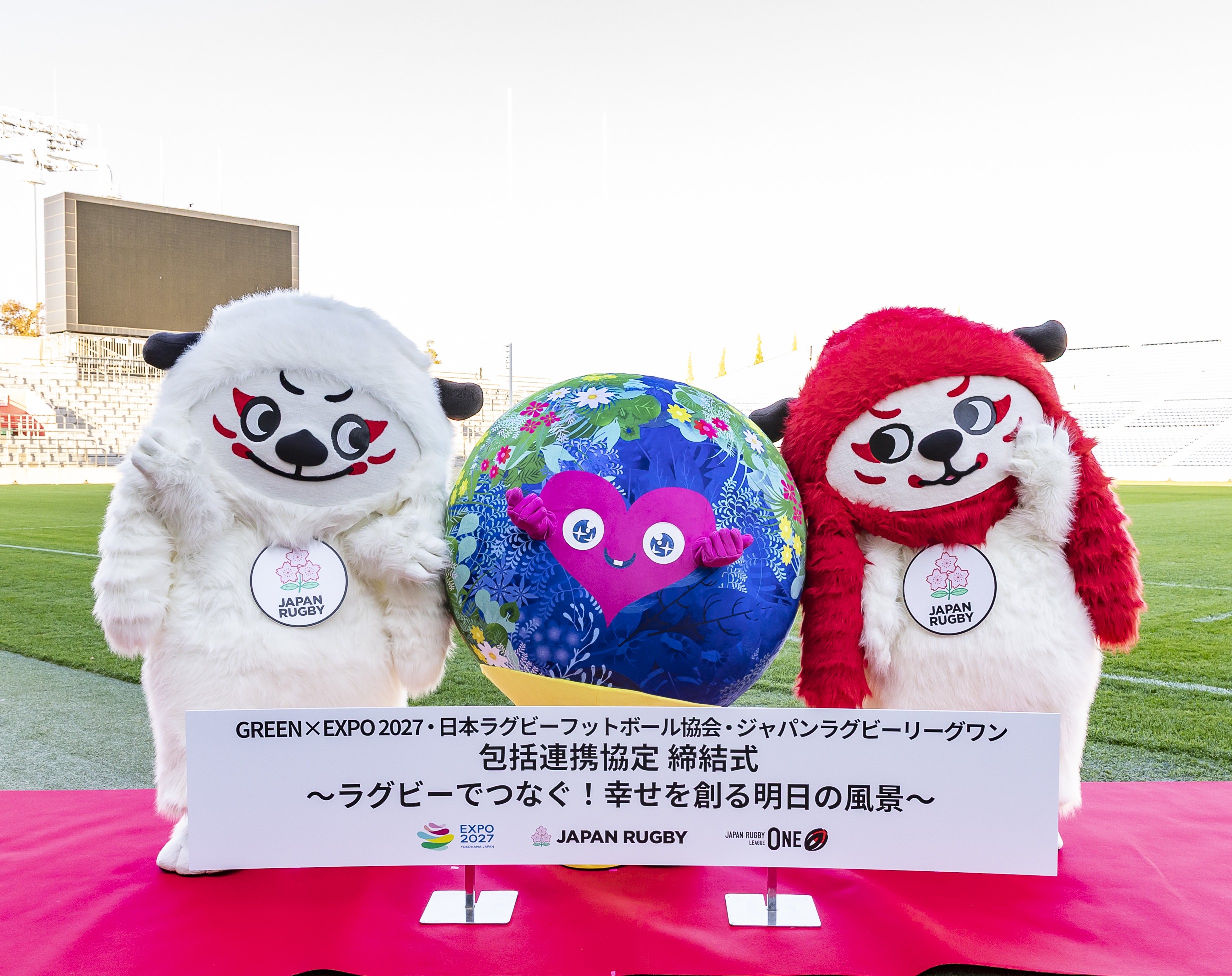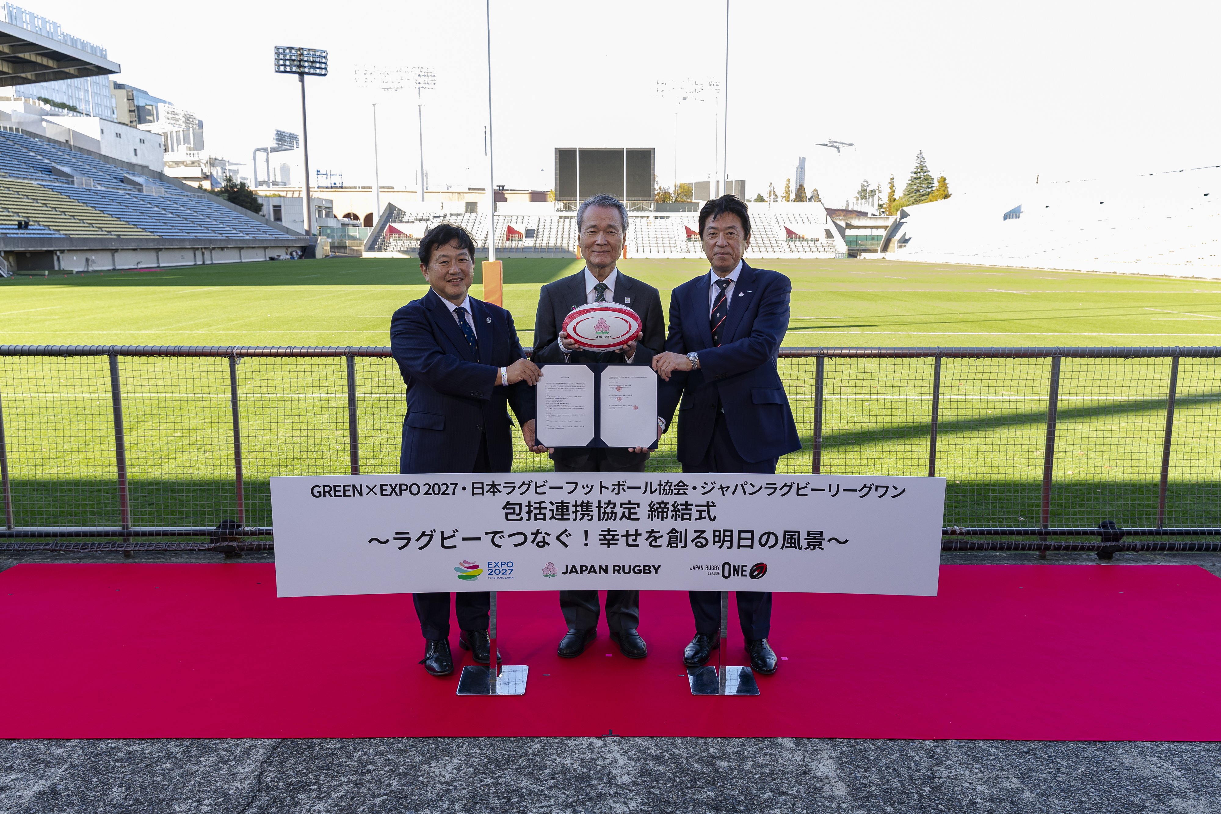 公益財団法人日本ラグビーフットボール協会(会長:土田雅人、東京都港区)は、2025年11月28日(金)秩父宮ラグビー場(東京)にて、公益社団法人2027年国際園芸博覧会協会(会長:筒井義信、神奈川県横浜市)および一般社団法人ジャパンラグビーリーグワン(理事長:玉塚元一、東京都港区)と共に、持続可能な社会環境づくりを目指す包括連携協定を締結しました。