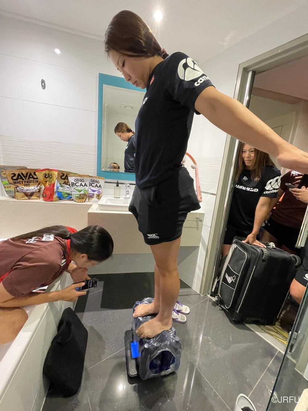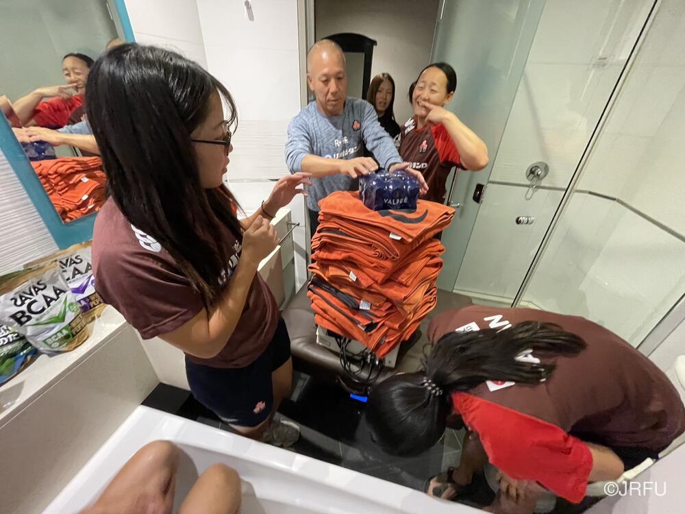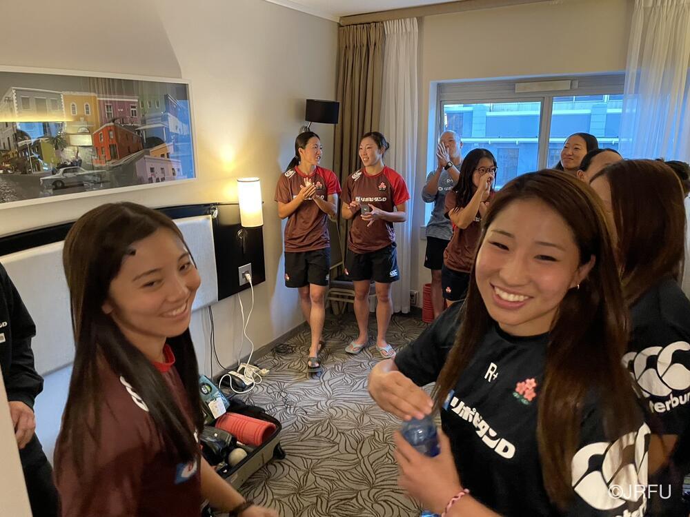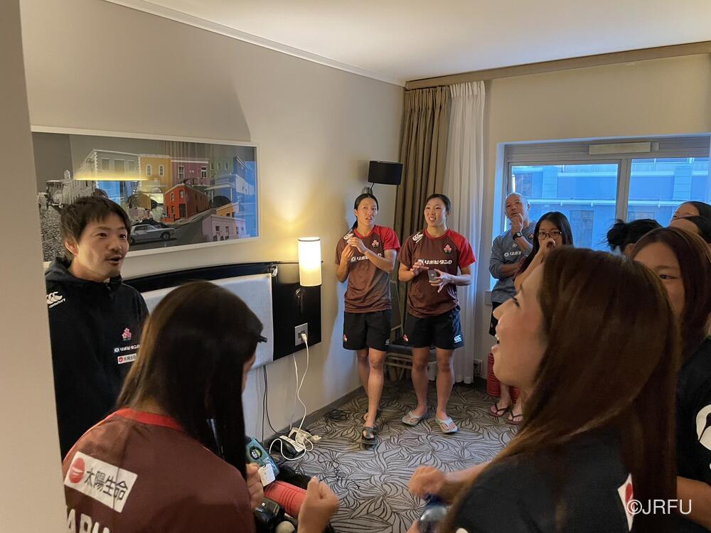 夕方、チームミーティングを行いました。遠征のスケジュールを確認し、まずはみんなでリラックスしよう!という話しになりました。そこで、選手たち主導のチームアクティビティ!・・・の前に、選手たちのサプライズコントの披露があり、みんな笑顔になりました。