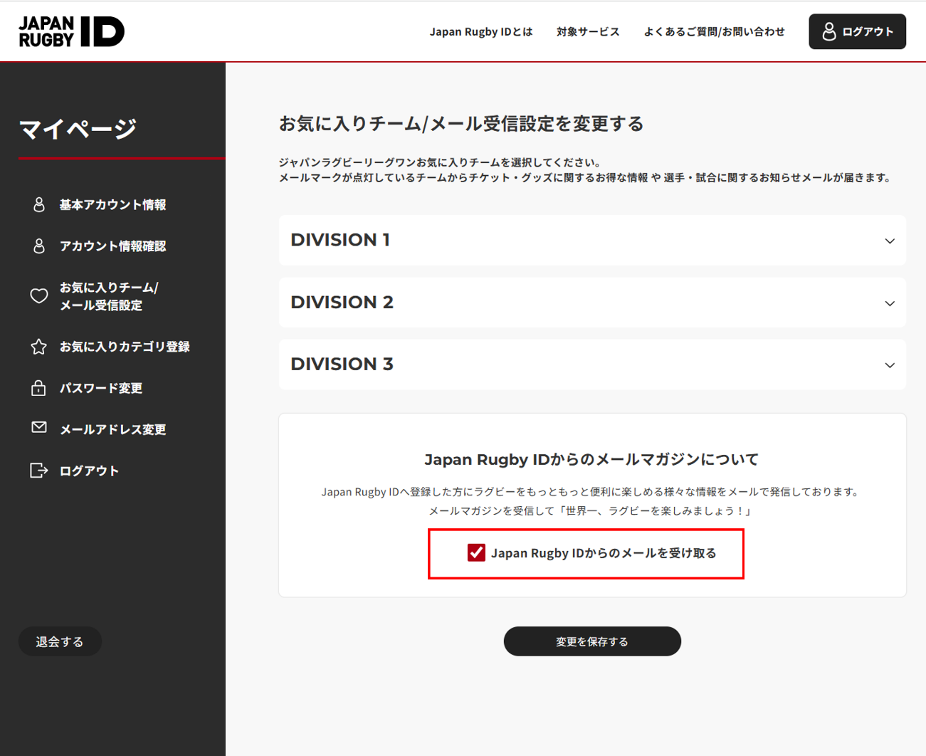 ①Japan Rugby IDにログインの上で、「お気に入りチーム/メール受信設定」をクリック