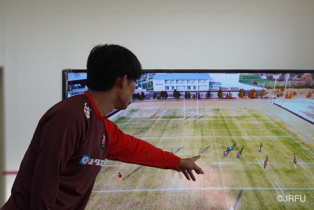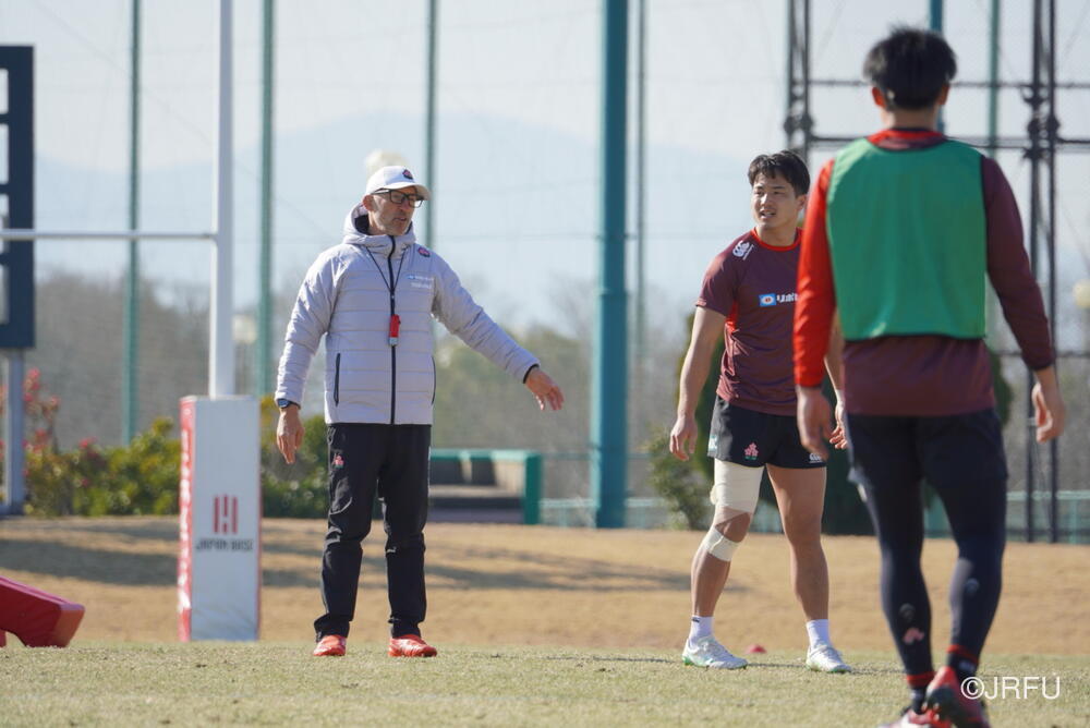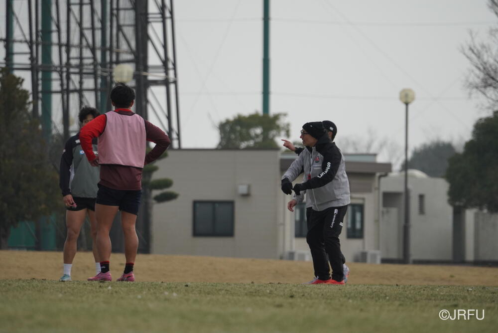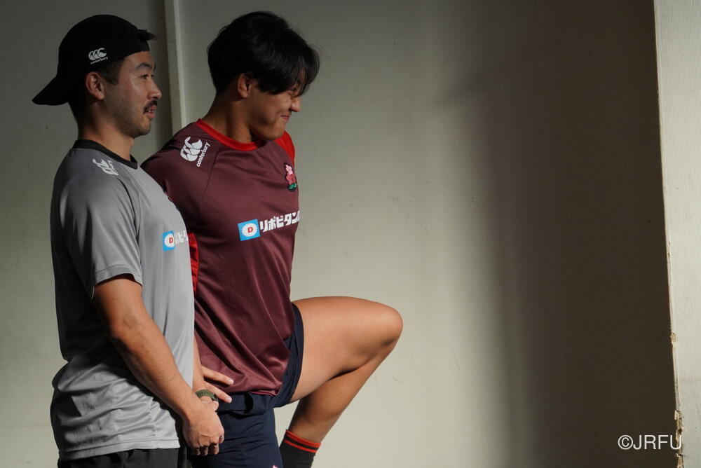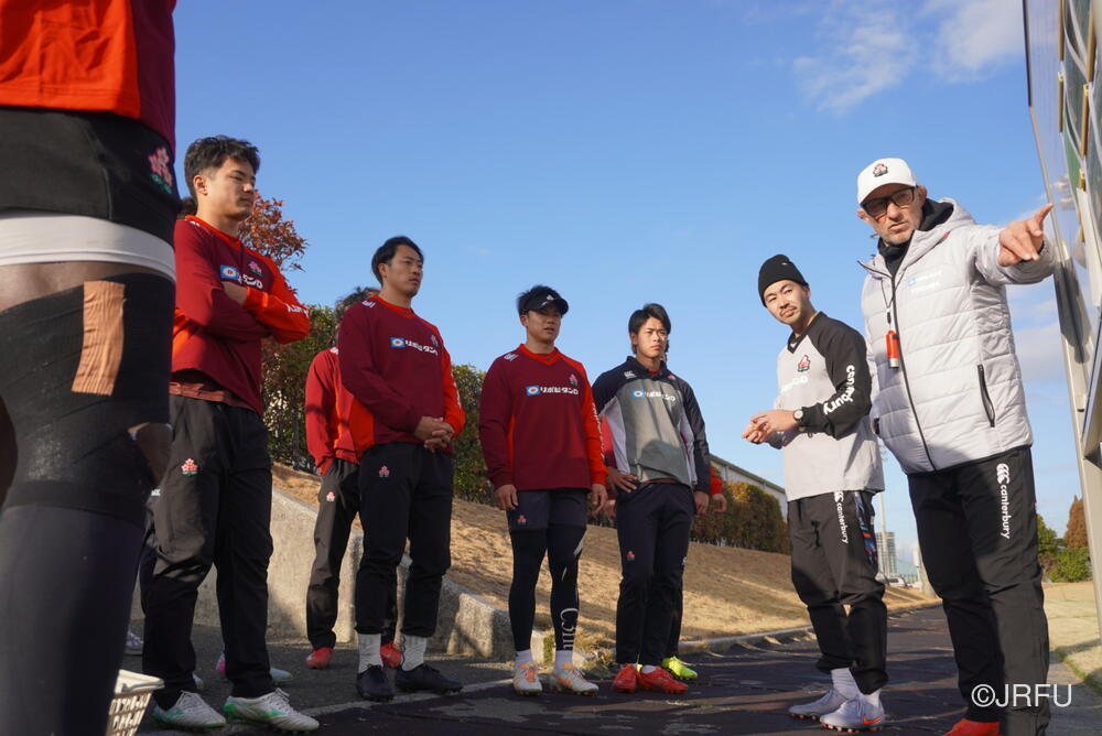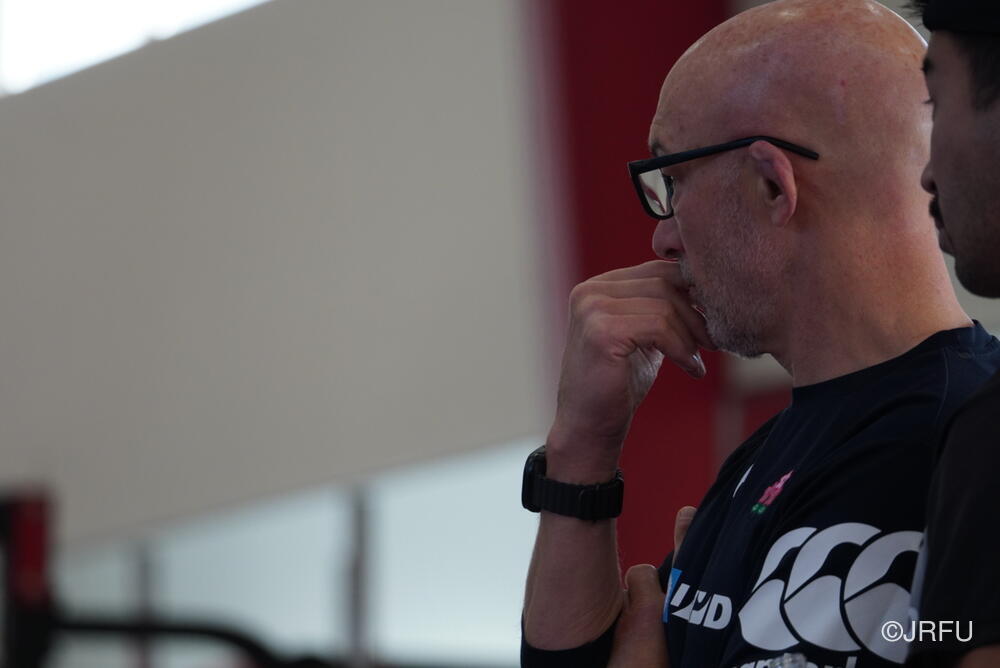 続いてグラウンドへ移動し、キックオフの布陣やラインアウトのセットプレーをジョグ程度のスピードで確認。細かな連携の精度を高める作業を行いました。
