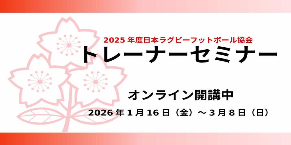 公益財団法人日本ラグビーフットボール協会(会長・土田雅人、東京都港区)では、ラグビーに携わるトレーナーの育成を目的として、2005年よりトレーナーセミナーを開催してまいりました。このたび、2025年度のトレーナーセミナーをオンライン形式にて開催いたします。本セミナーは、メディカル委員会トレーナー部門が主体となり実施いたします。全課程を修了された方には修了証が発行されます。また、修了者にはご登録いただいたメールアドレス宛に、トレーナー研修会のご案内や、日本代表事業におけるトレーナー活動に関する情報等を送らせて頂きます。本セミナーは、現在ラグビー現場で活動されている方はもちろん、これからラグビーのサポート業務に携わりたいと考えている方々にも広くご参加いただける内容となっております。ラグビーに携わるトレーナーの皆様、ならびにラグビー現場でメディカルサポートに従事されている方々に、ぜひご受講いただきたく存じます。多数の皆様のご参加を心よりお待ち申し上げます。