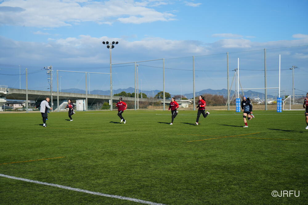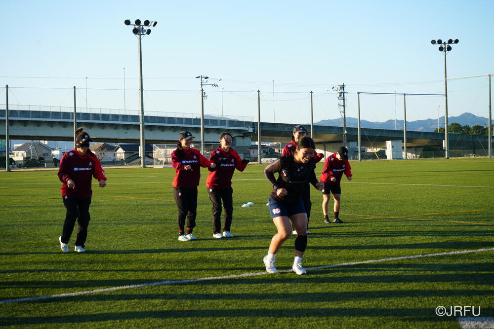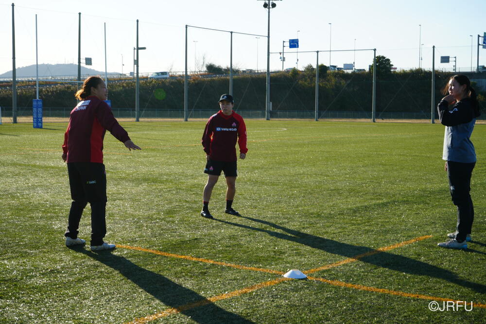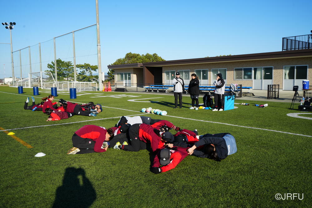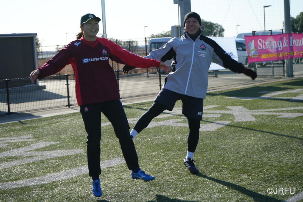 フィールドでは、荻原コーチにキックオフ、坂田S&Cコーチにサクラセブンズのラグビーに繋がる身体の使い方についてご指導いただきました。