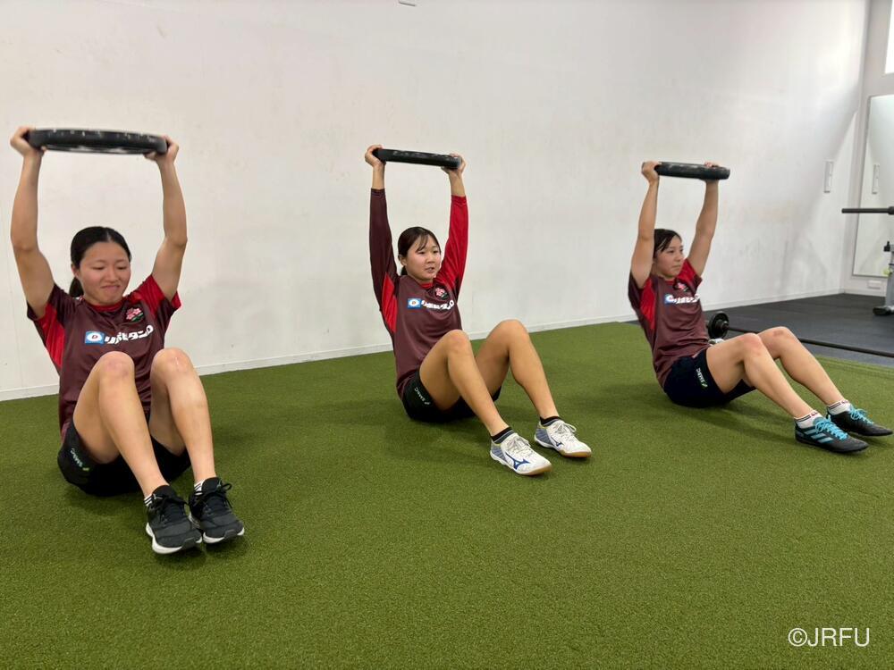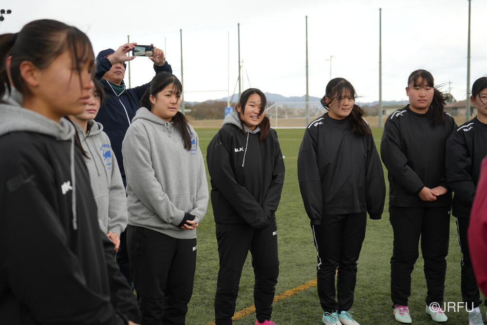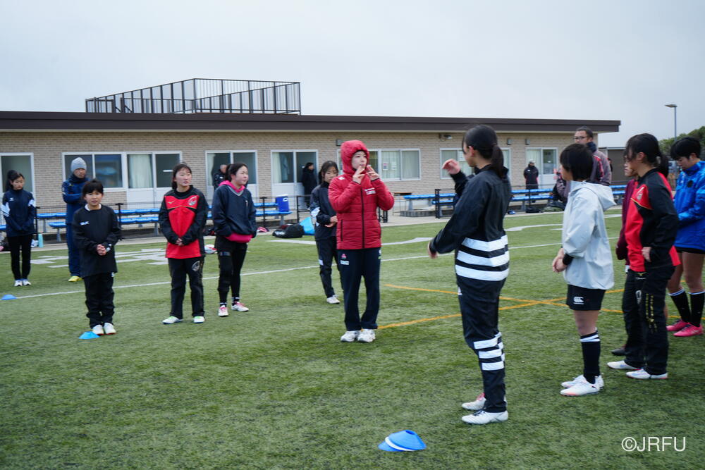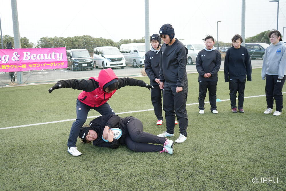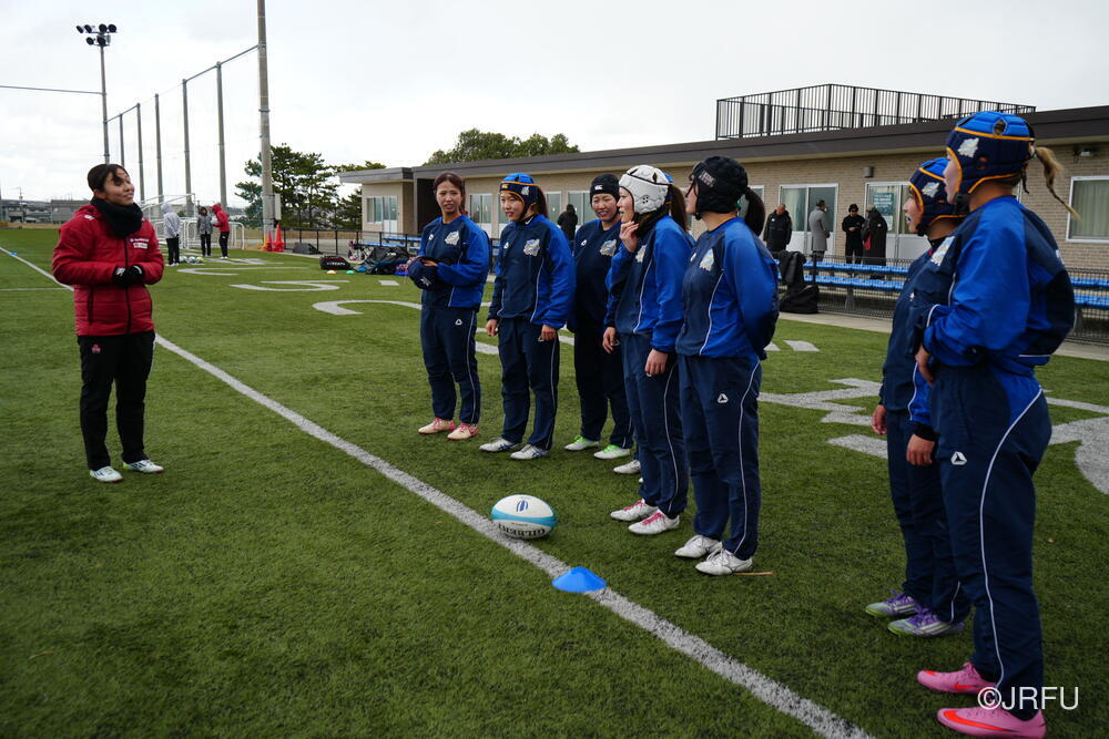 フィールドでは、荻原コーチにキックオフ、坂田S&Cコーチにサクラセブンズのラグビーに繋がる身体の使い方についてご指導いただきました。