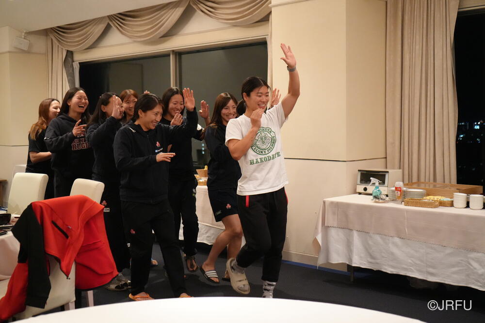 最後は、新成人の谷山選手のリクエストに応えて「だるまさんの1日」を行いました。何事も全力で取り組むサクラセブンズ!「だるまさんが◯◯してる」の声がけにあわせて、選手たちは連動し、最後まで同じ絵を見ていました。