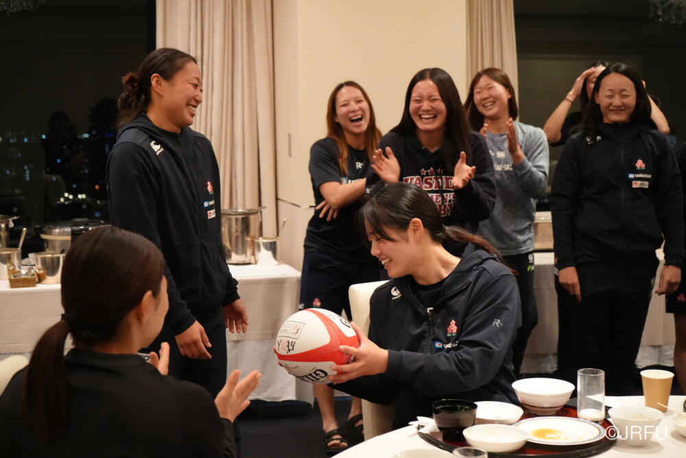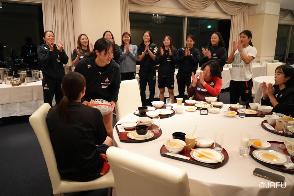 夕食では、サプライズがありました。突然一つのテーブルの選手たちが立ち上がり、音楽にあわせて阿波踊りを始めたのです。もう一つのテーブルまで踊りながら歩いて行くと、谷山選手に立ち止まり、ボールが渡されました。そこには「祝・成人」の文字が!谷山選手は昨日のオフの時間に地元へ帰って成人式へに出席し、今日の練習にあわせて戻ってきました。選手・スタッフからの祝福メッセージが書かれたボールを受け取った谷山選手は「皆さんのような素敵な大人になりたいです!」とコメント。ミナコ、成人おめでとう‼