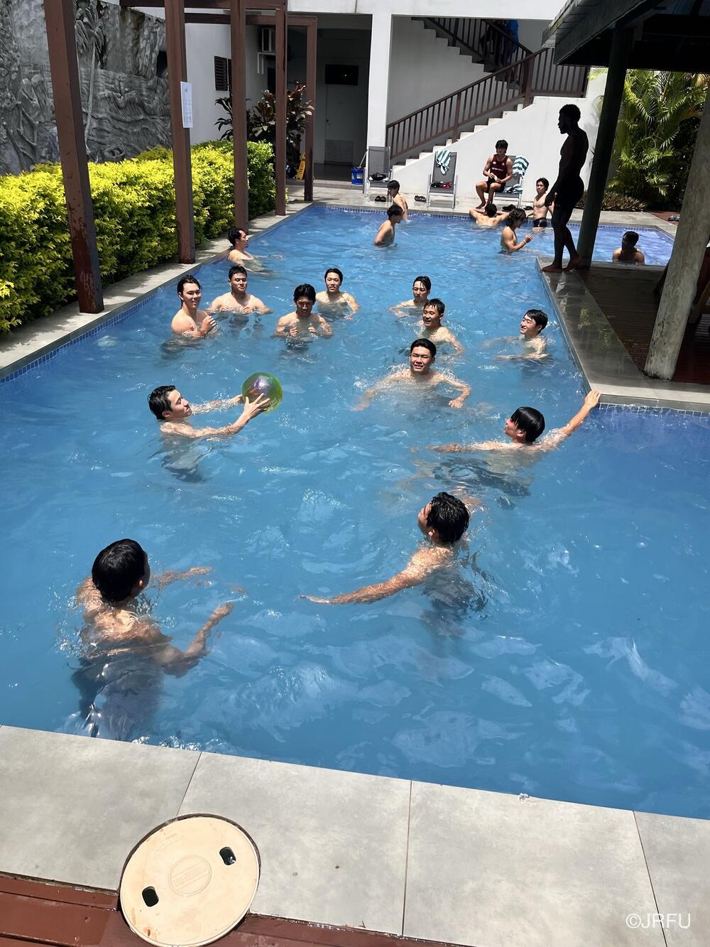 午後は、宮下選手が大会のキャプテンフォトに参加しました。その後は、自由時間となり、各自でプールに入ったりリカバリーをしたりと明日の試合に向けての準備をしました。