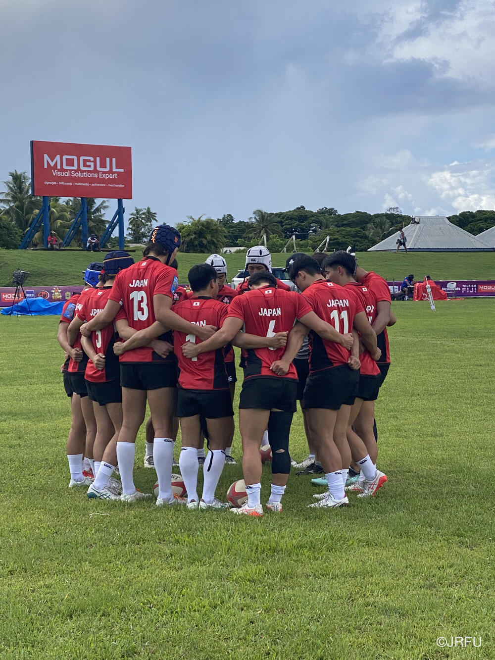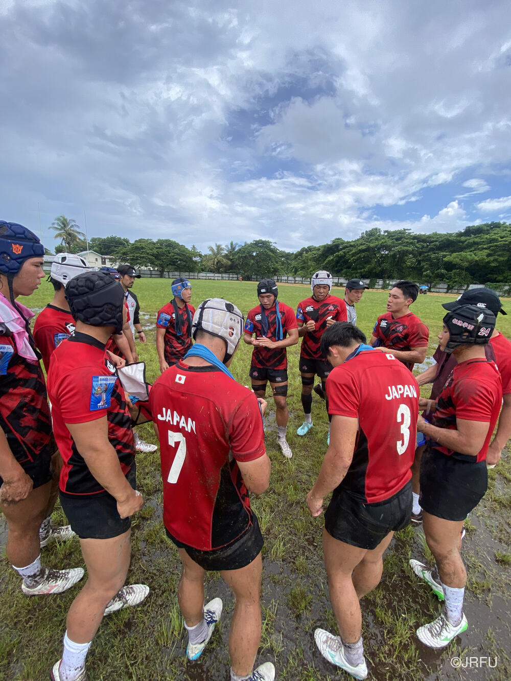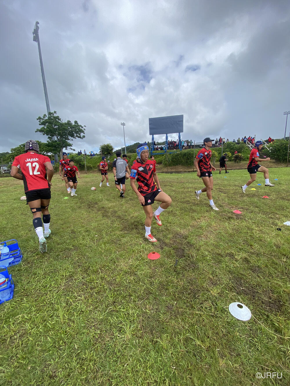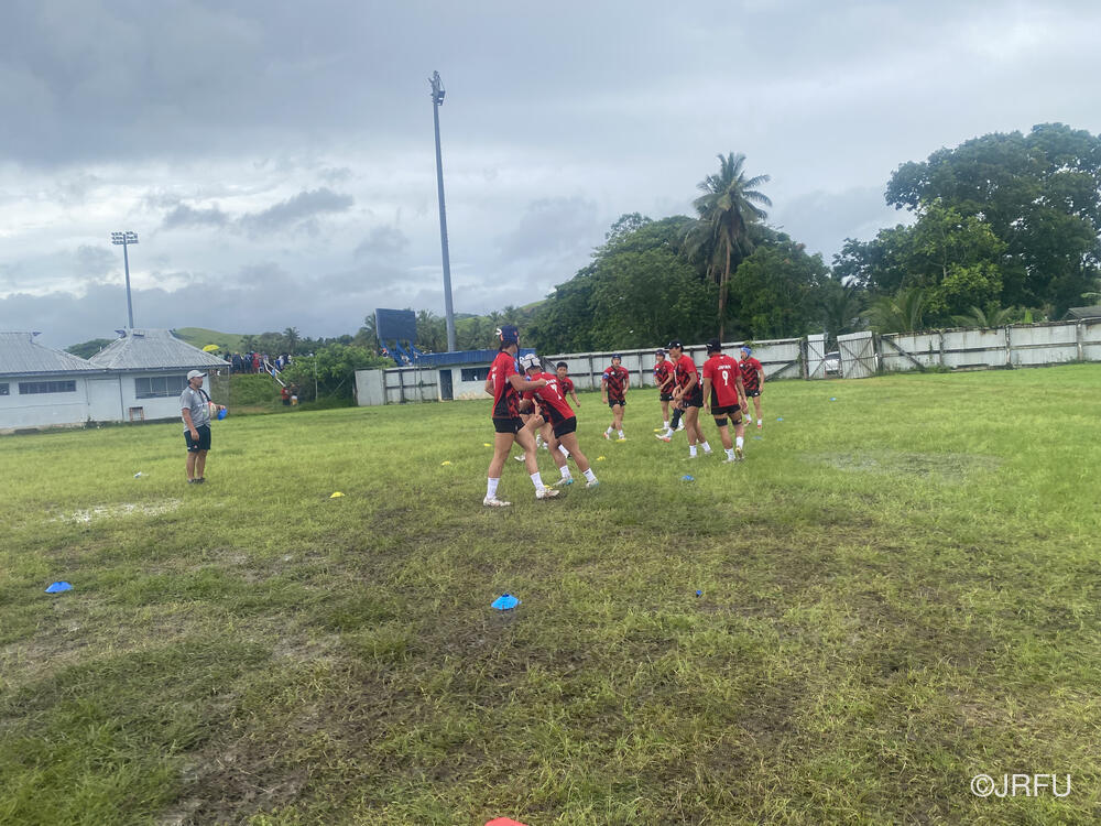 大会初戦はプールC(ユース)第1試合目のShogun Fiji Highlanders 戦でした。到着した頃は雨が降っていたもののアップが始まる頃には雨がやみ強い日差しの下、暑い中アップをしました。