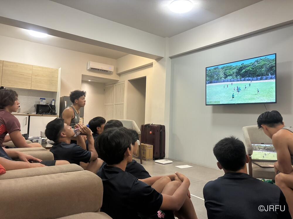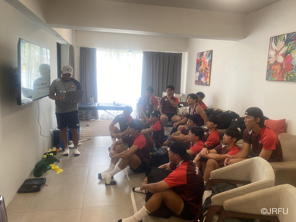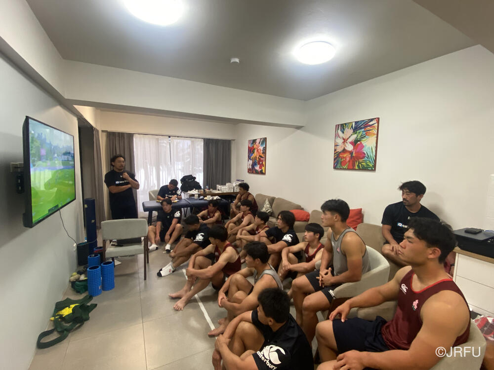夕食後にはチームミーティングを行い、今日の試合で見つかった課題、明日の試合ではどうするかなど全員で確認しました。課題をしっかり修正し、よかったポイントをもっと伸ばし明日からの試合に活かすため準備を整えています。また、リカバリーにも時間をかけ、コンディションを整えながら明日からの試合に備えています。