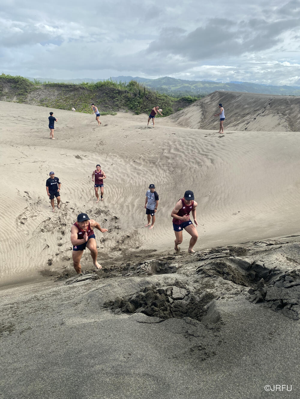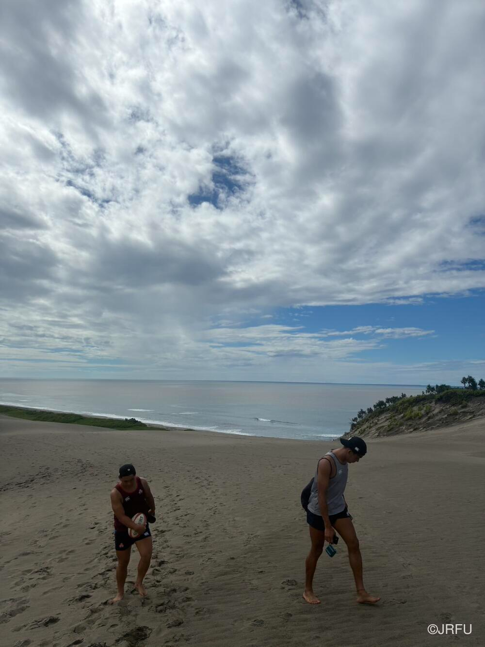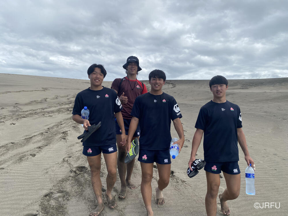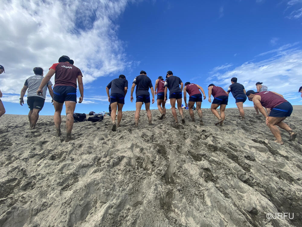 バスに戻ろうとした時、Yaro Chiefsのキャプテンからアドバイスをいただき、スクラムを組んで急な砂の坂を登ることになりました。全員で登り切った後、バスで帰ろうとした時にUSA代表がバスでやってきたりと、皆この砂丘をうまくトレーニング場所として活用していました。