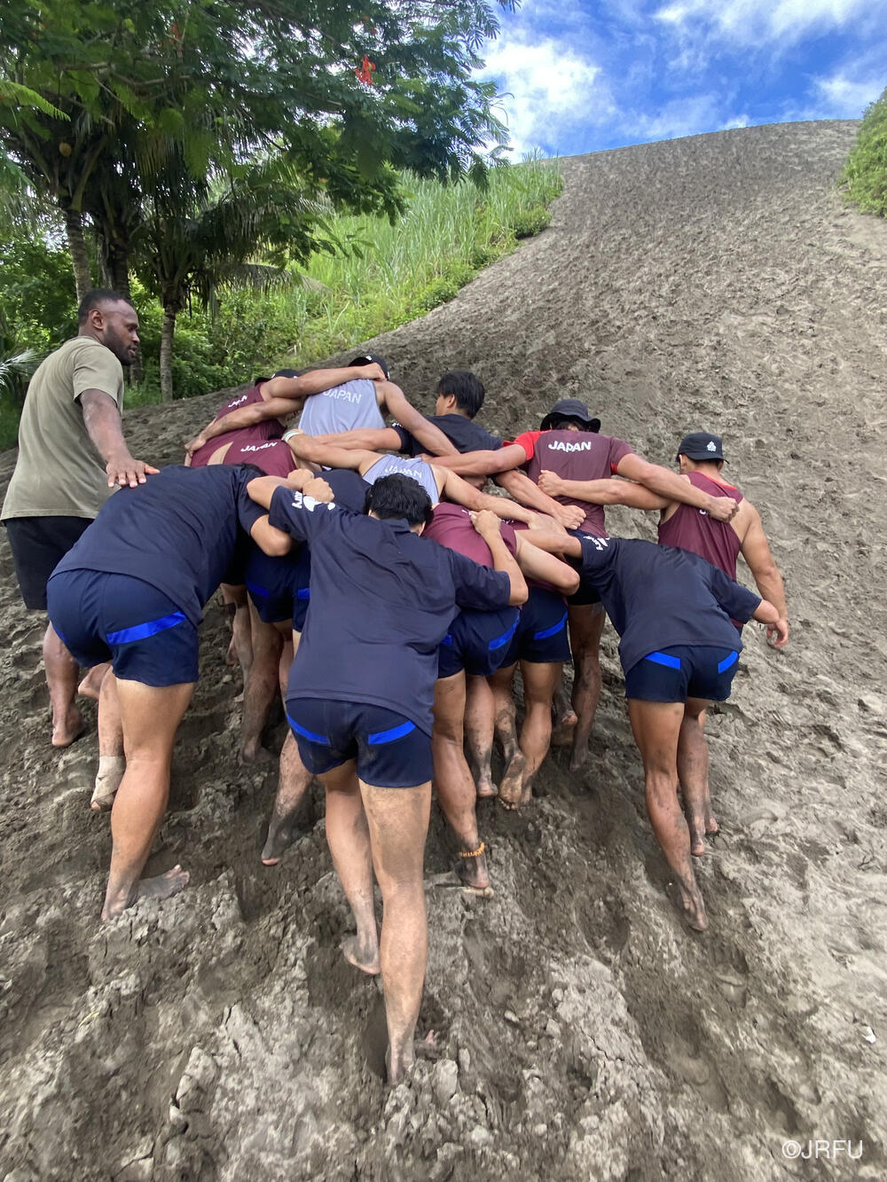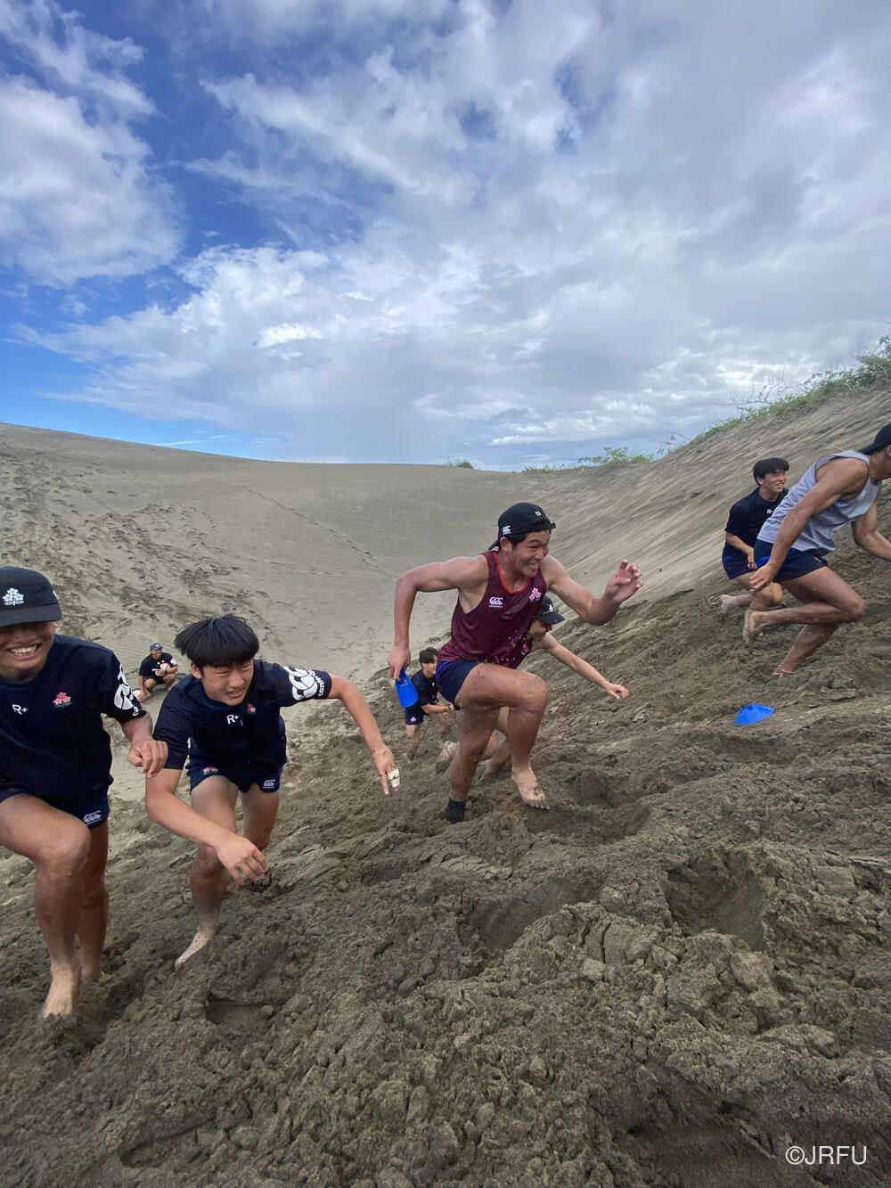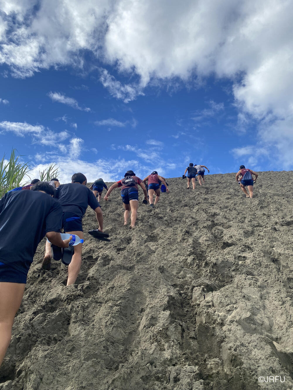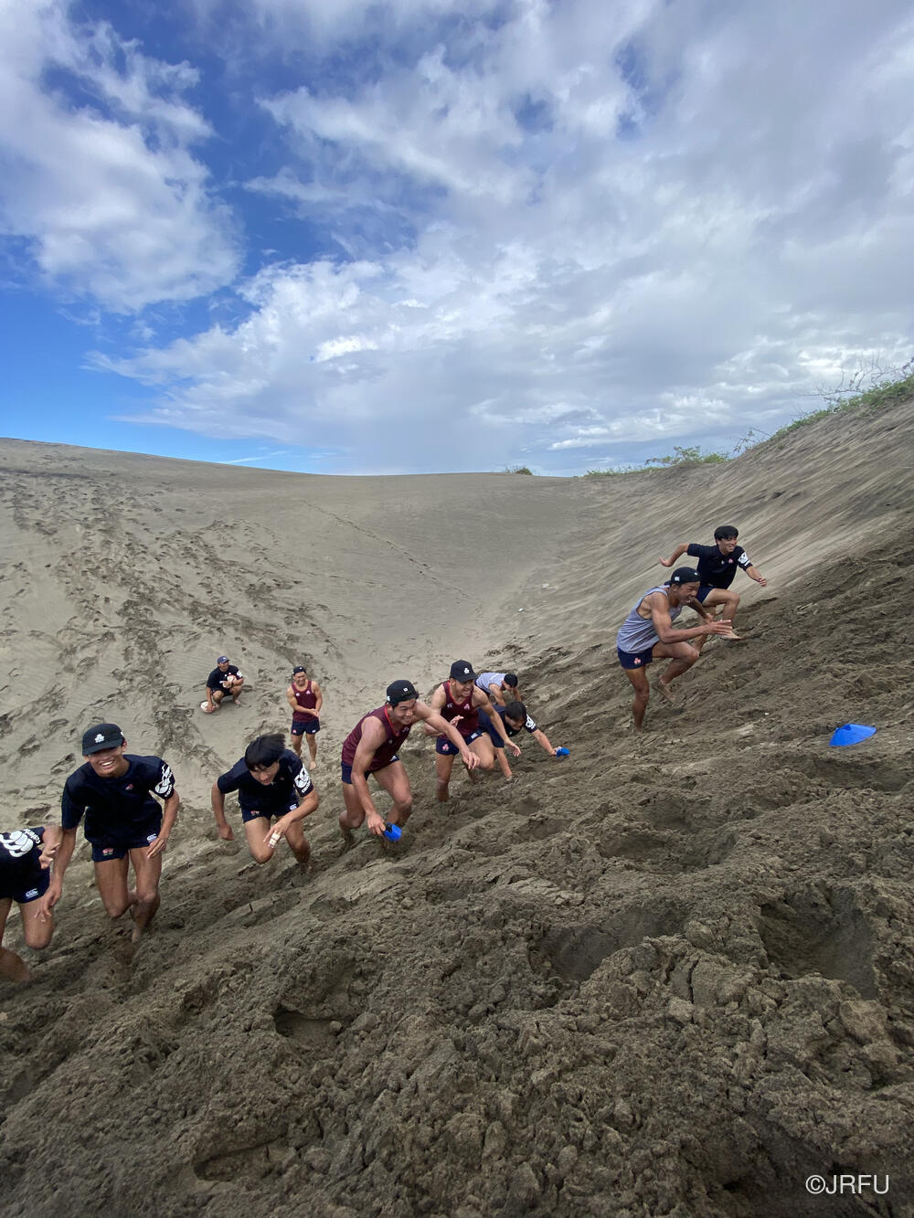 バスに戻ろうとした時、Yaro Chiefsのキャプテンからアドバイスをいただき、スクラムを組んで急な砂の坂を登ることになりました。全員で登り切った後、バスで帰ろうとした時にUSA代表がバスでやってきたりと、皆この砂丘をうまくトレーニング場所として活用していました。