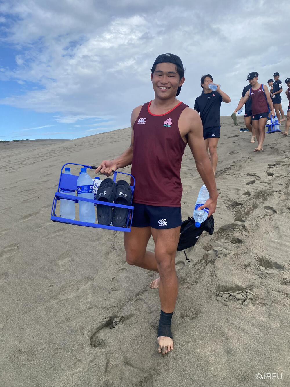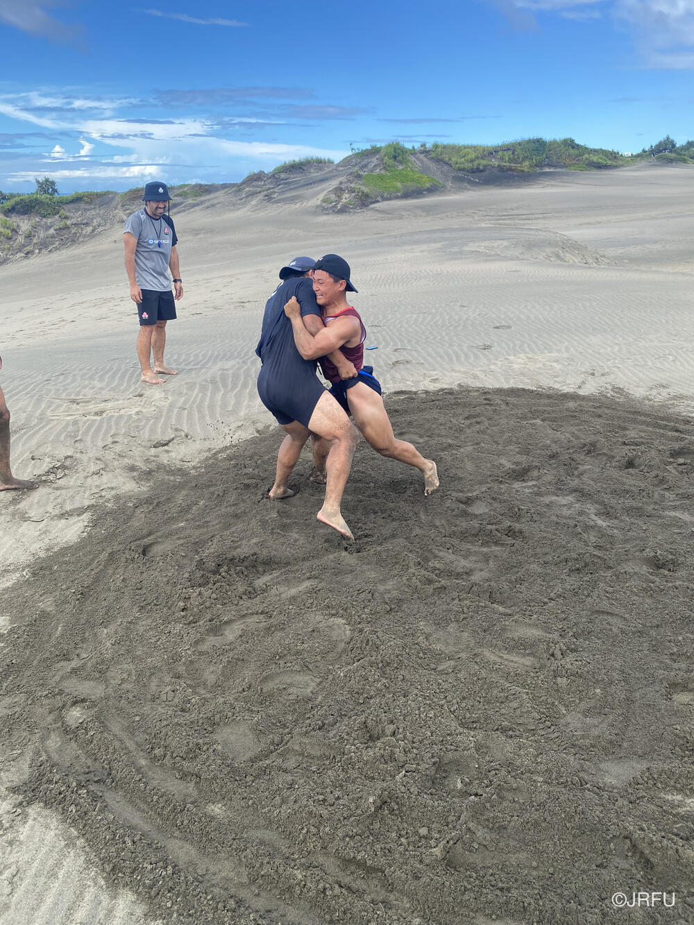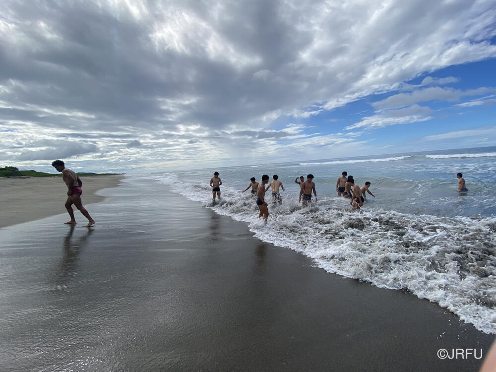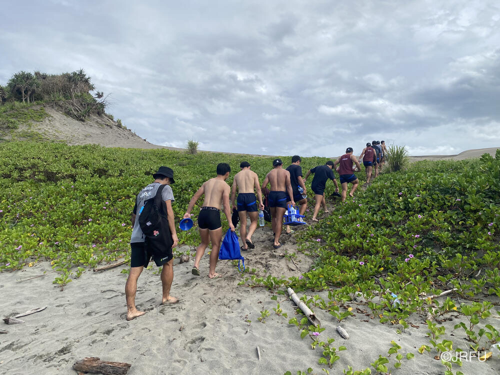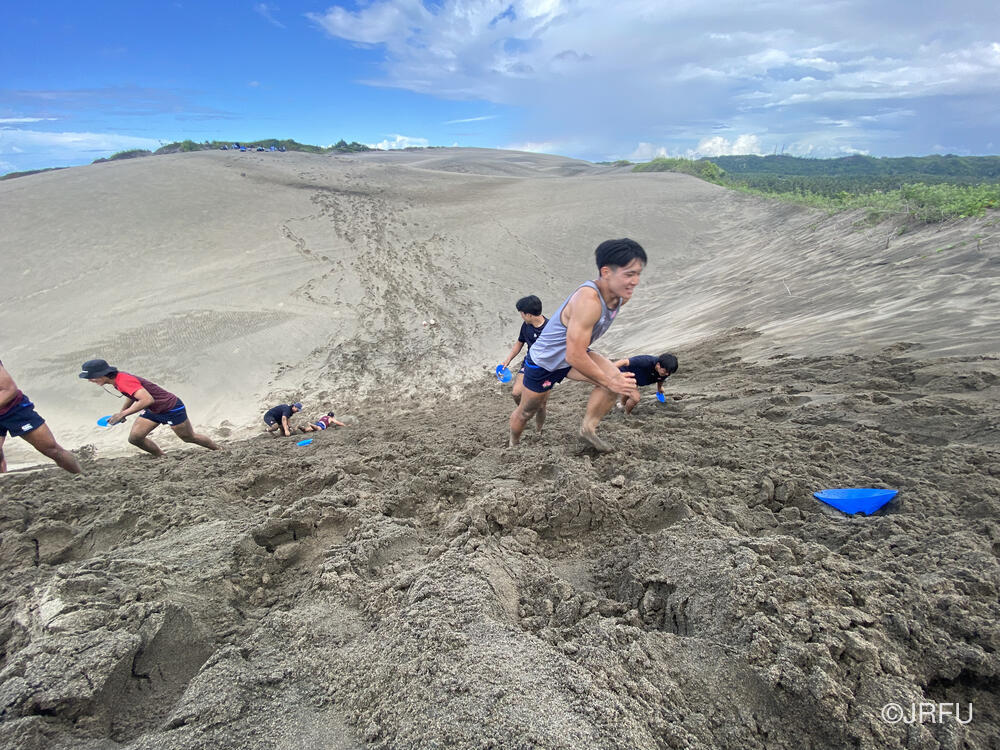 砂丘に到着した時、今回行われた大会の優勝チームであるYaro Chiefsのキャプテンがいました。砂丘では急な坂をダッシュで登ったり、相撲をしたりと過酷でした。相撲では選手と帯同スタッフ交えての戦いを行い、トレーニングが終わった後は選手全員で海に入りましたが、波が強かったです。
